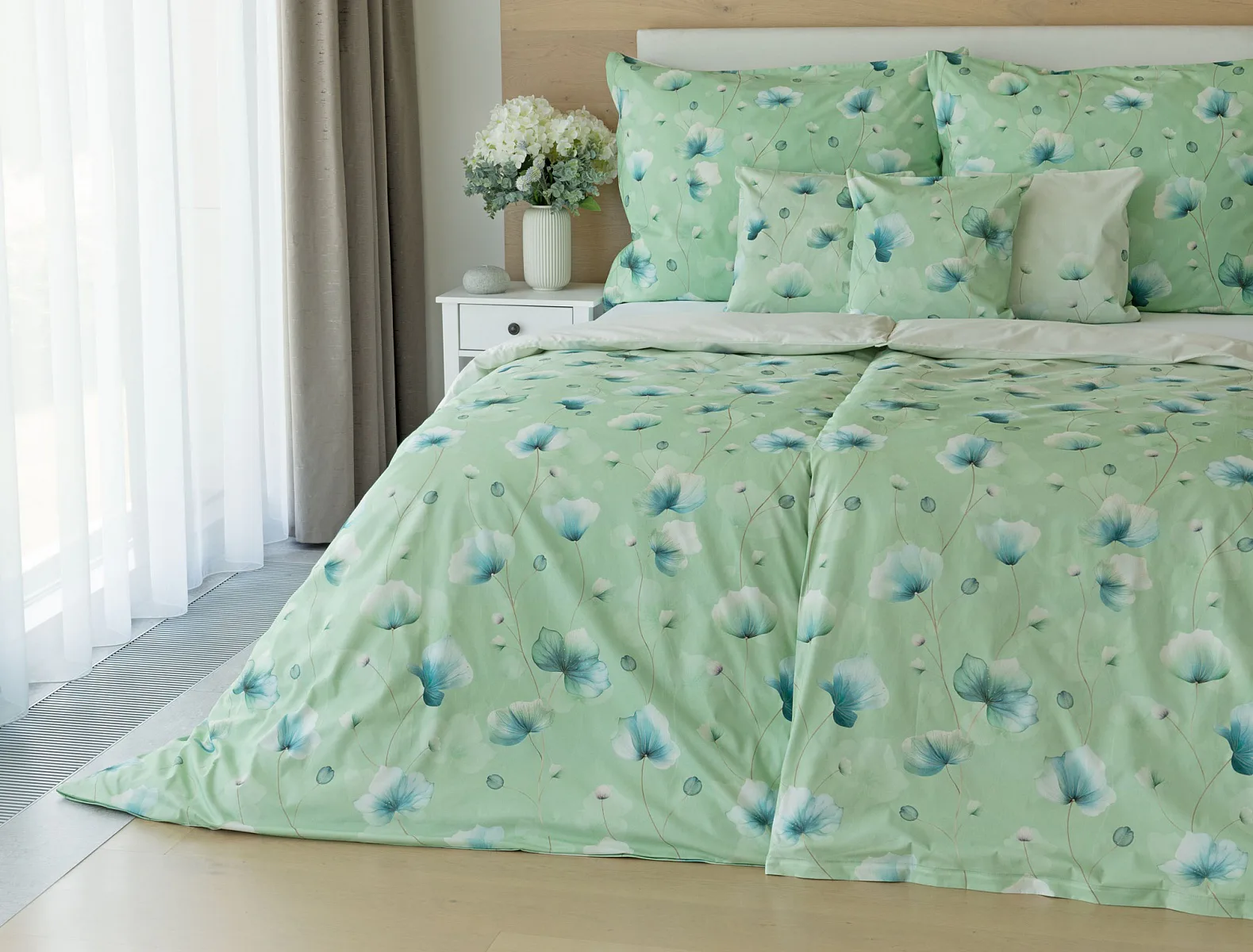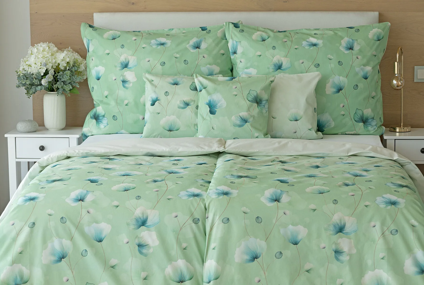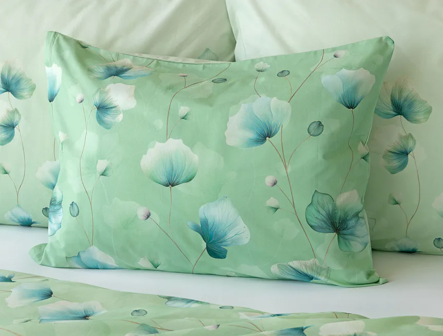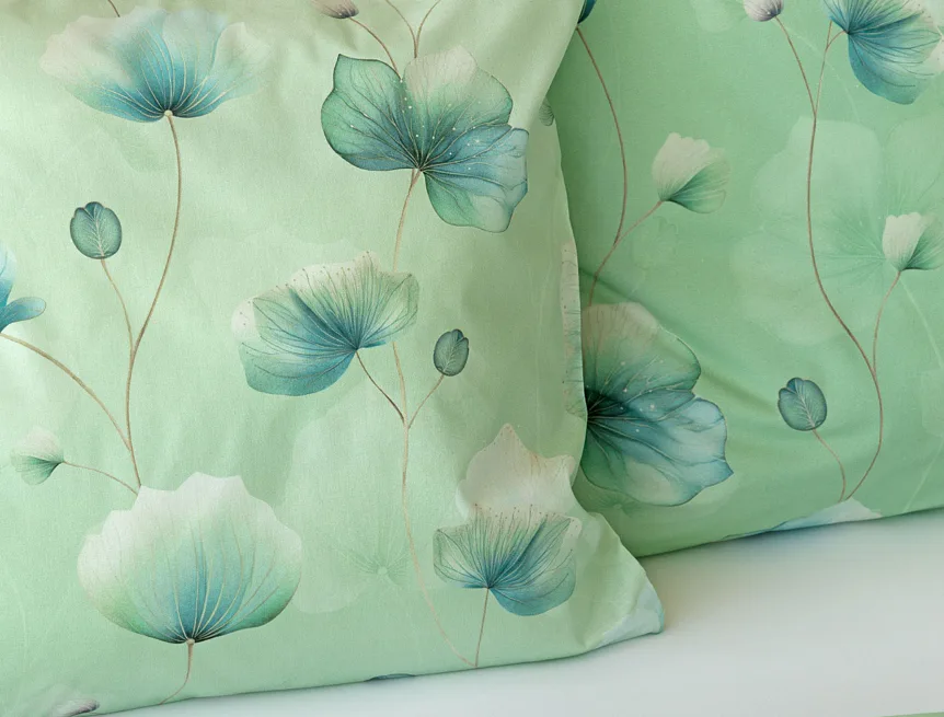 Bavlněné ložní povlečení Nelly vnese do vaší ložnice nádech svěžesti a vlnu pozitivní energie. Podklad v atraktivní zelené barvě zdobí velice jednoduchý florální motiv v paletě modrých a petrolejových tónů. Eleganci vzoru podtrhuje ombré efekt, který přechází v horní části povlaků k tlumenému, jemně zelenkavému odstínu.