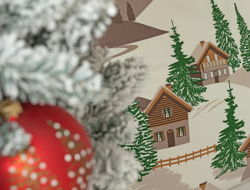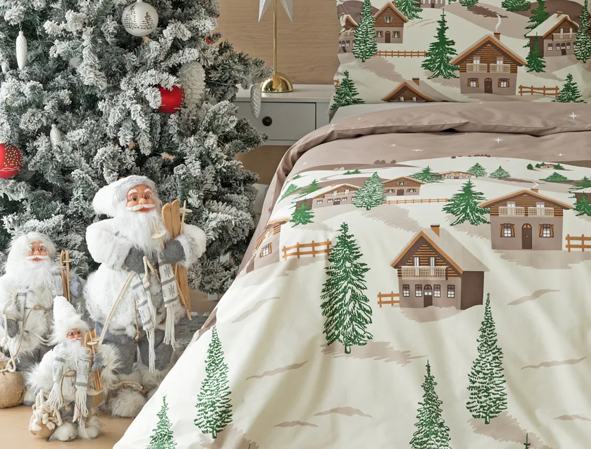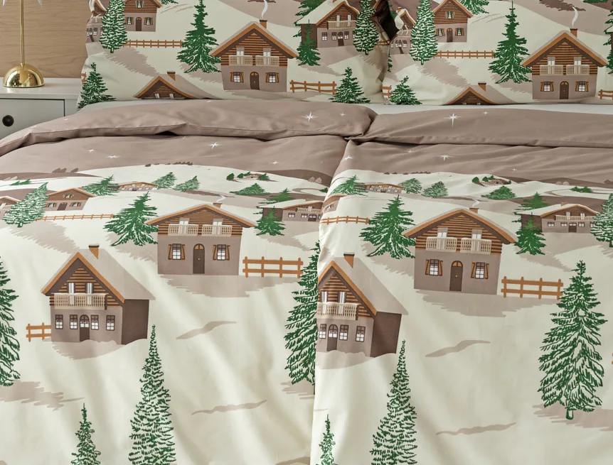 Bavlněné povlečení Niels s motivem zasněžené horské vesničky vnese do vaší ložnice poklidnou zimní atmosféru. Hřejivé odstíny krémové a hnědé oživí motiv zelených stromečků. Na podkladu v přírodní hnědé barvě září sem tam malá bílá hvězdička. Nechte se hýčkat a zachumlejte se do jemné bavlny deluxe.