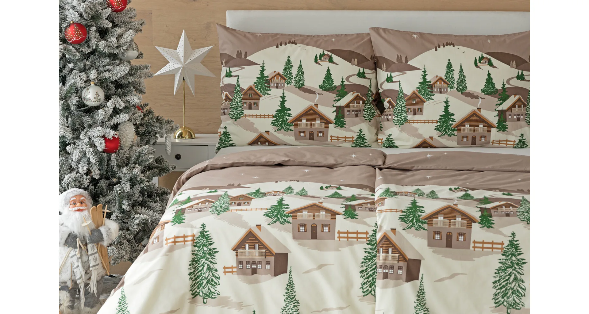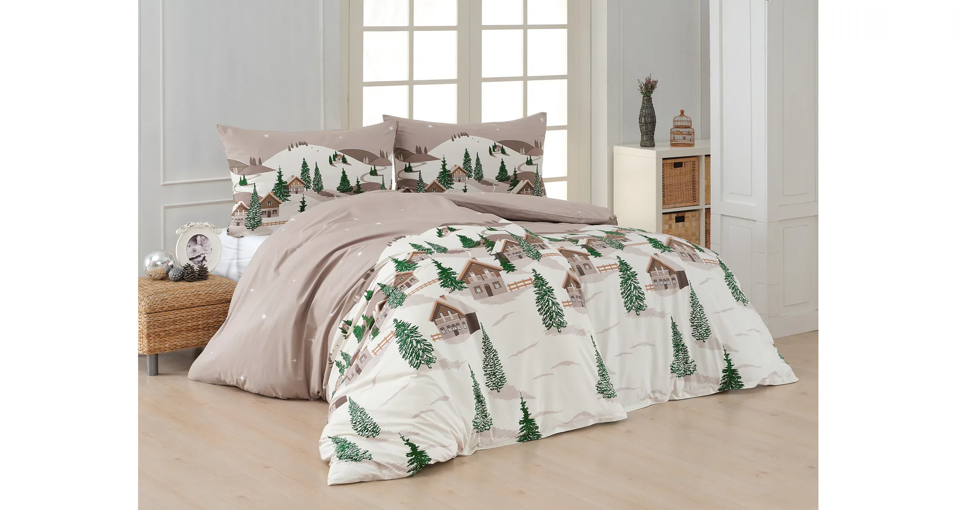 Bavlněné povlečení Niels s motivem zasněžené horské vesničky vnese do vaší ložnice poklidnou zimní atmosféru. Hřejivé odstíny krémové a hnědé oživí motiv zelených stromečků. Na podkladu v přírodní hnědé barvě září sem tam malá bílá hvězdička. Nechte se hýčkat a zachumlejte se do jemné bavlny deluxe.