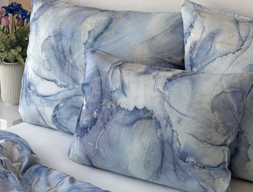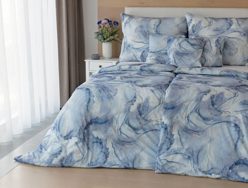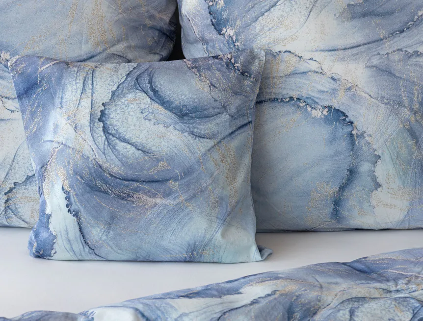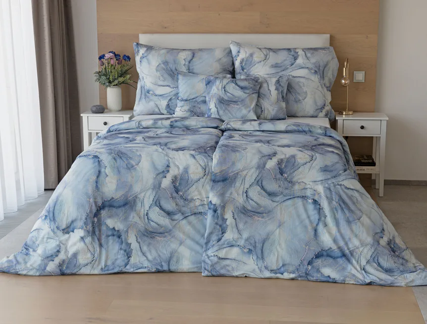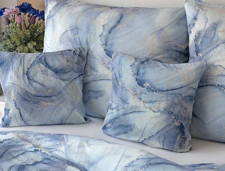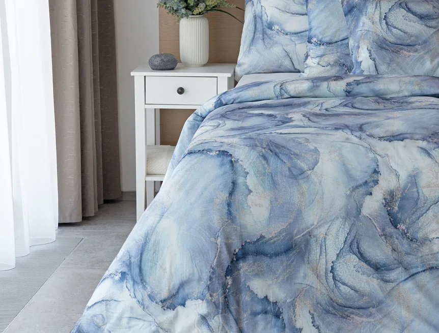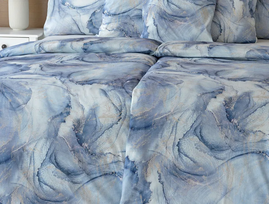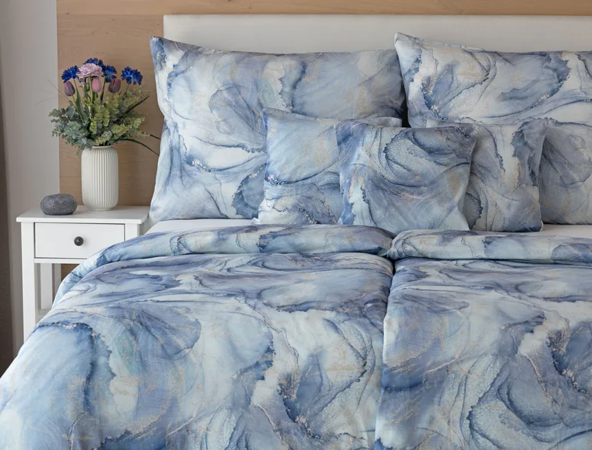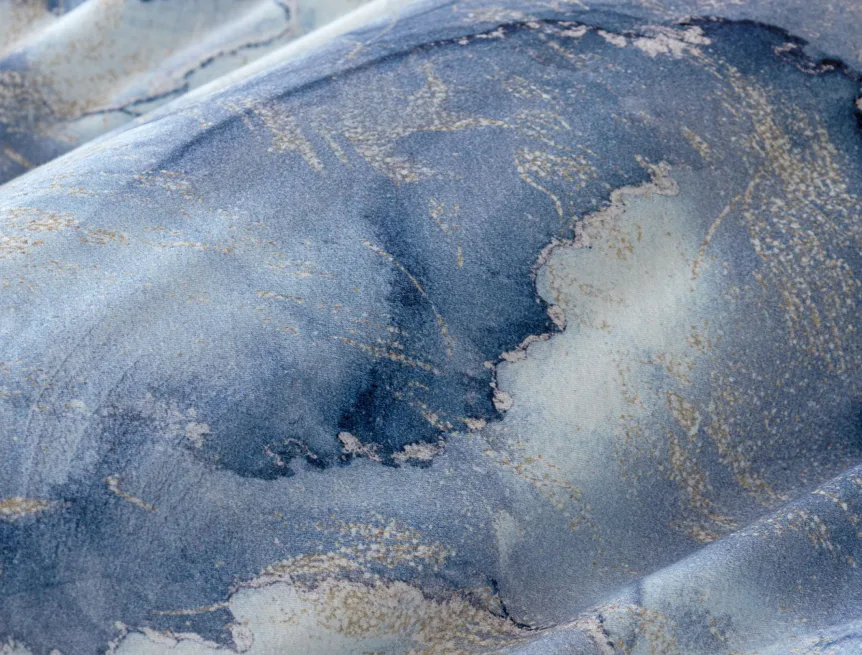 Pro novou kolekci ložního povlečení Mako jersey jsme pečlivě vybírali motivy, které tomuto pružnému materiálu sluší. Abstraktní vzor Odine, který je tvořen paletou modrých tónů protkaných zlatavými prvky, rozzáří vaši ložnici.