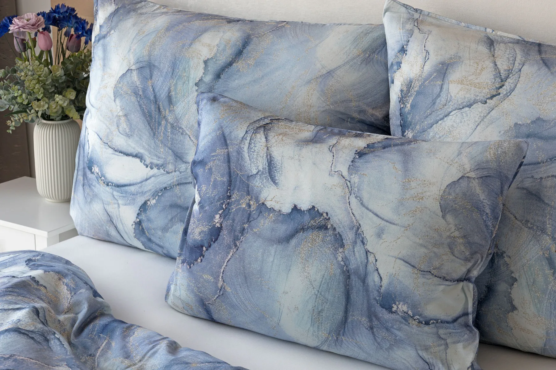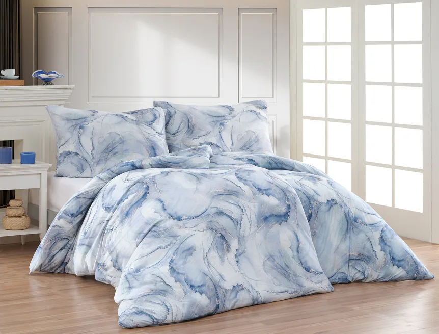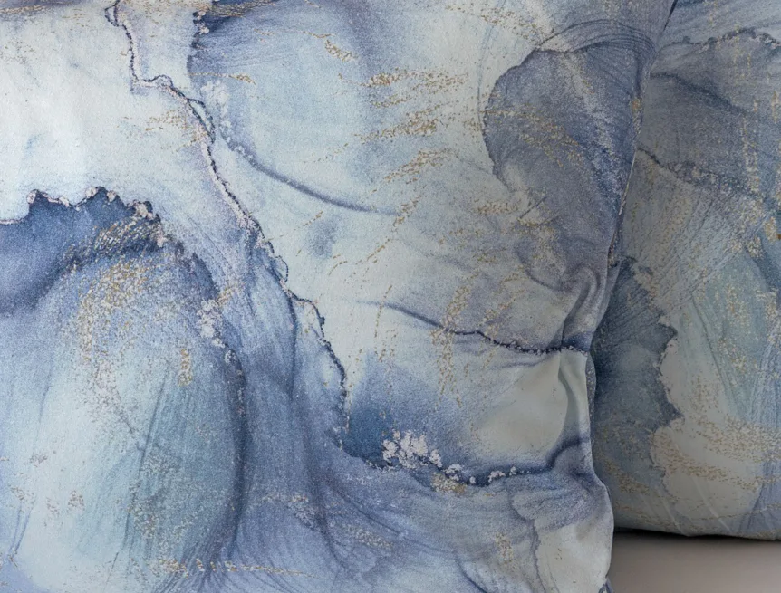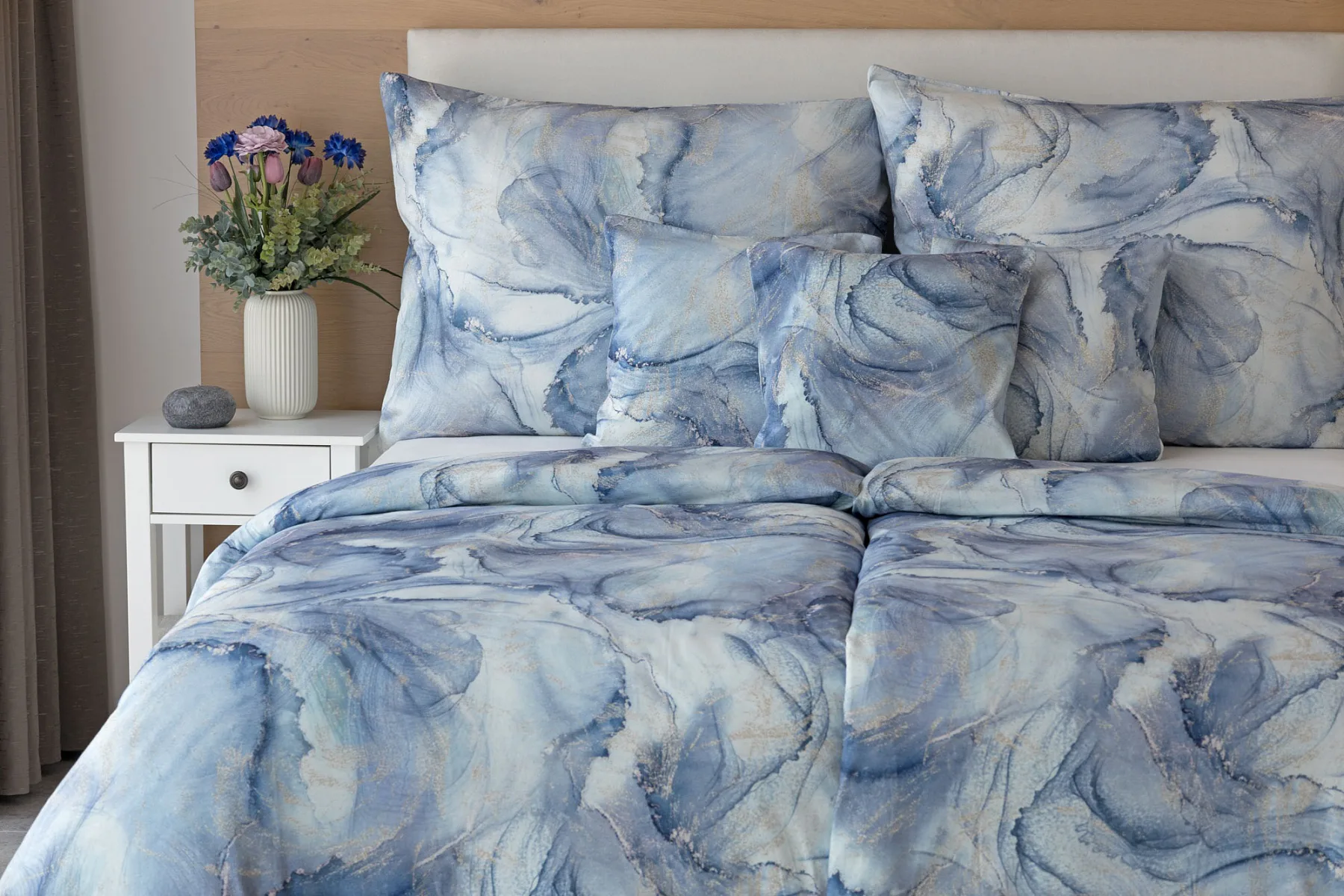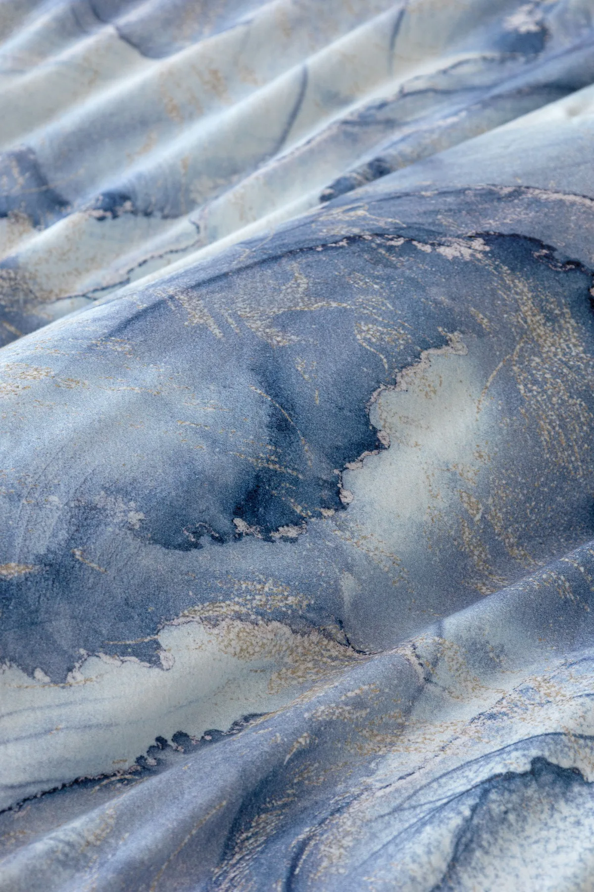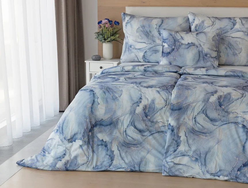 Pro novou kolekci ložního povlečení Mako jersey jsme pečlivě vybírali motivy, které tomuto pružnému materiálu sluší. Abstraktní vzor Odine, který je tvořen paletou modrých tónů protkaných zlatavými prvky, rozzáří vaši ložnici.