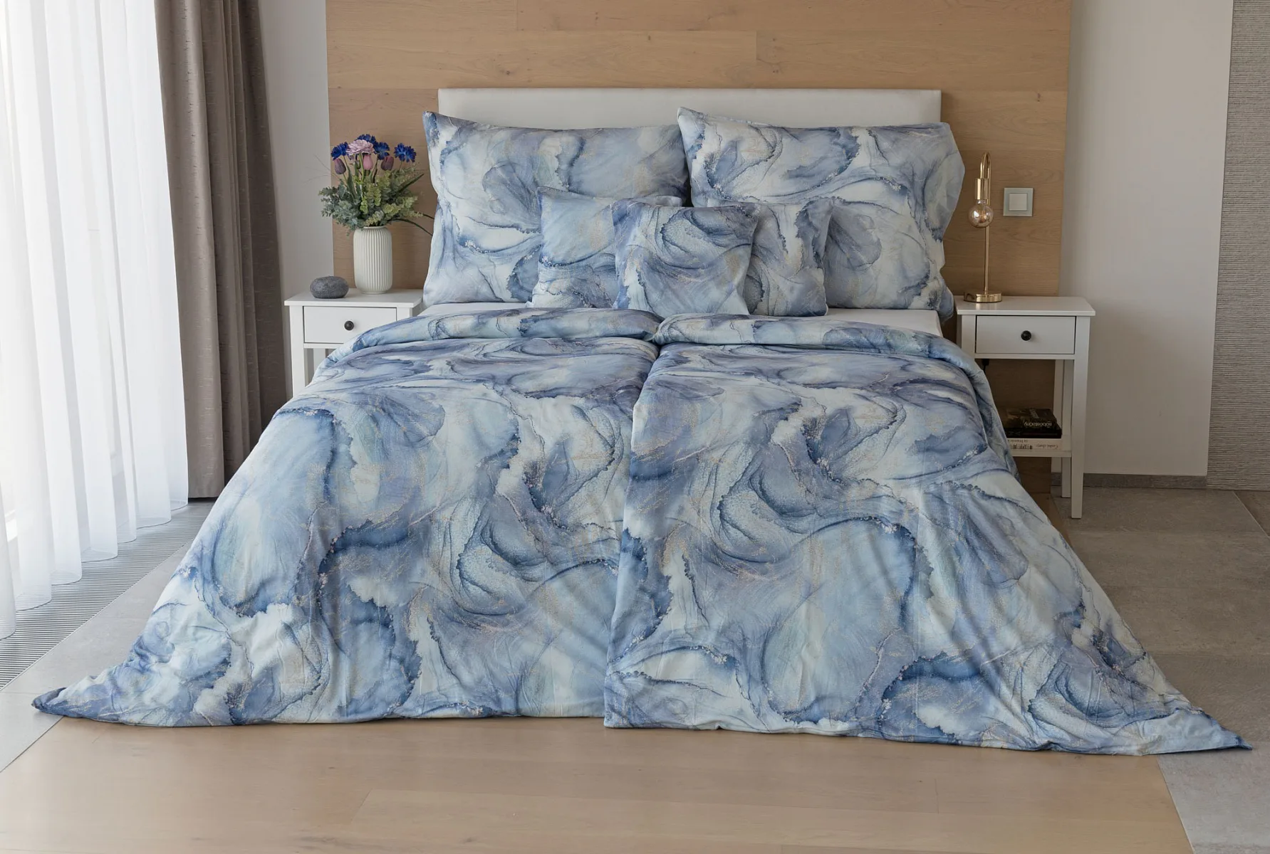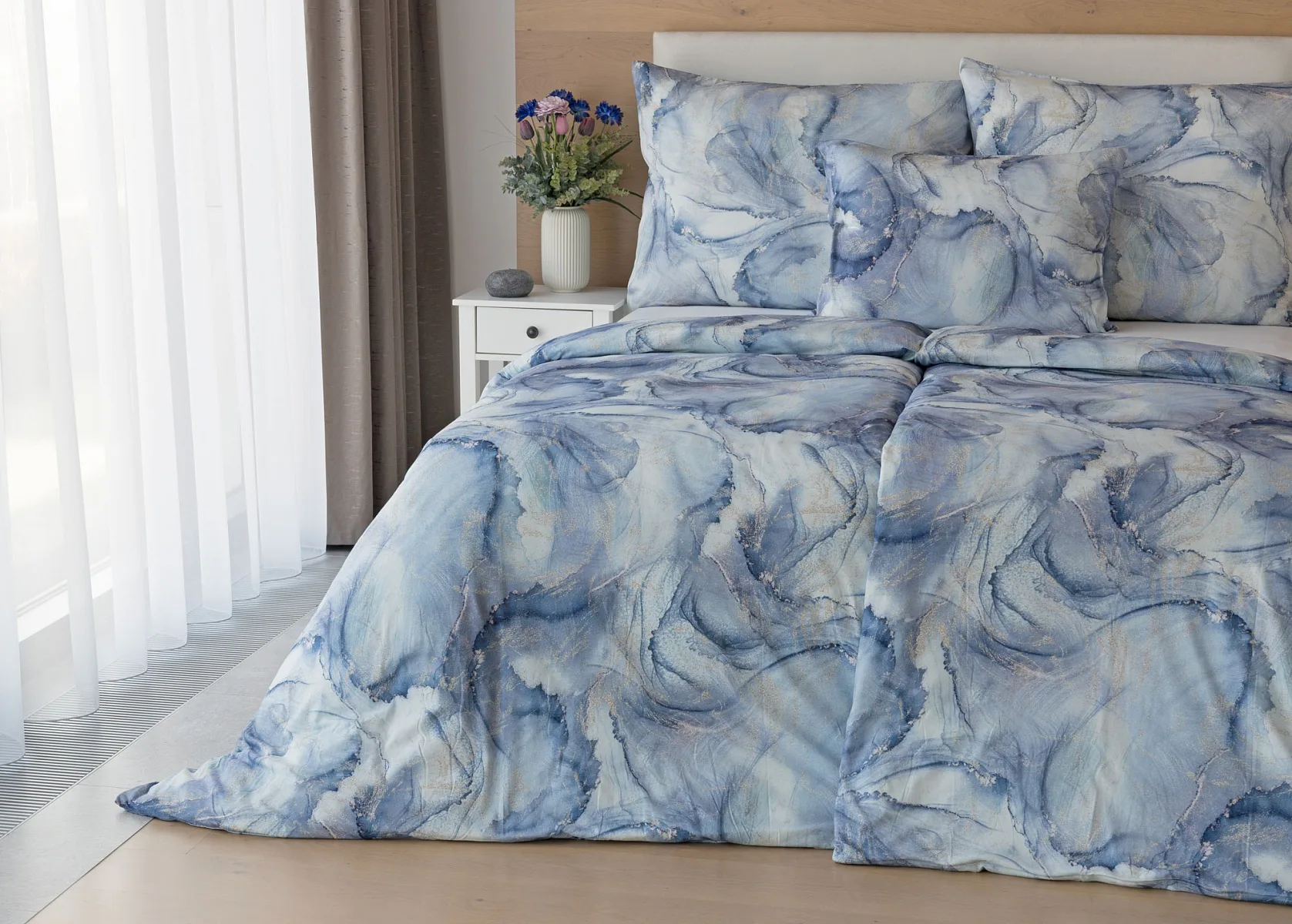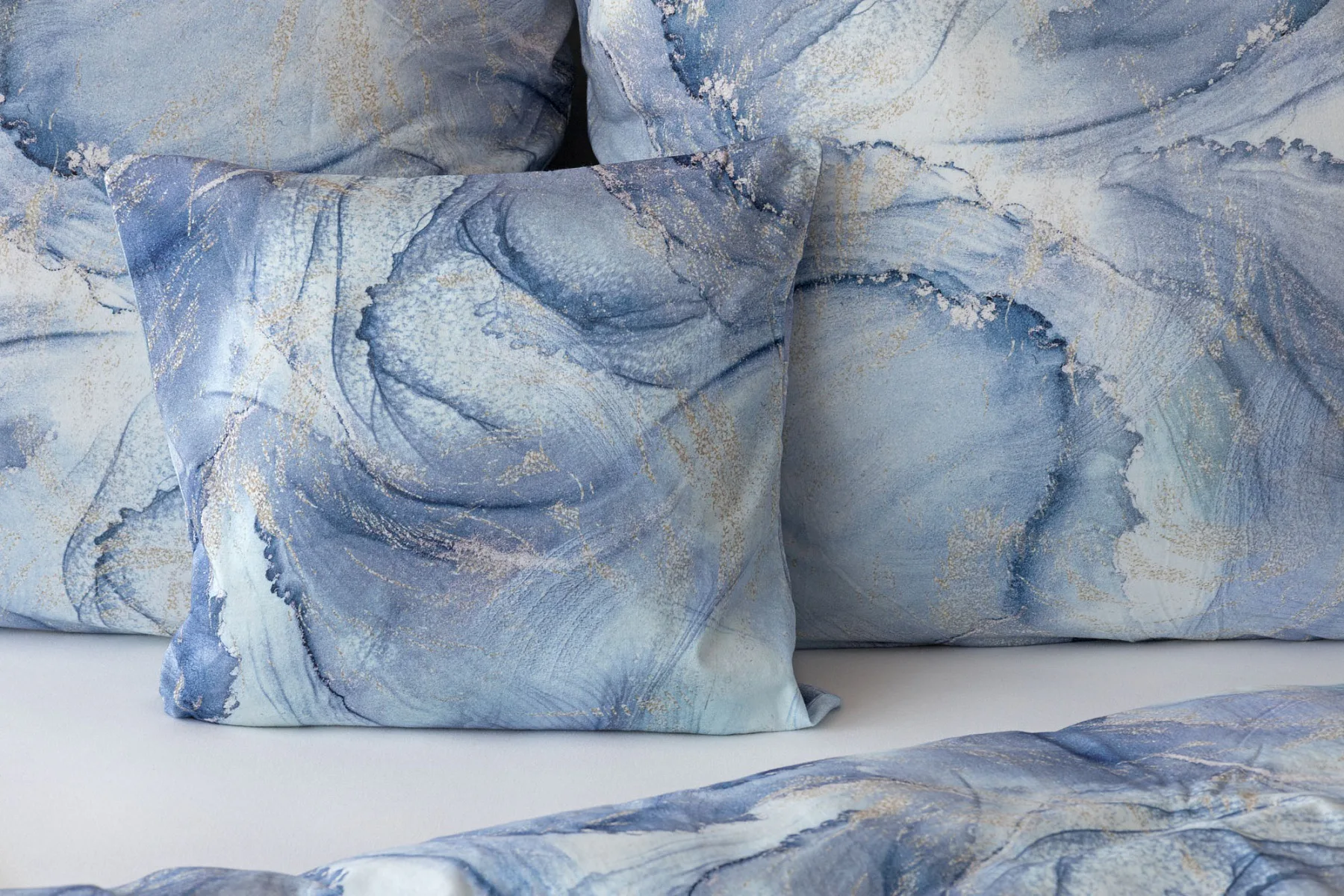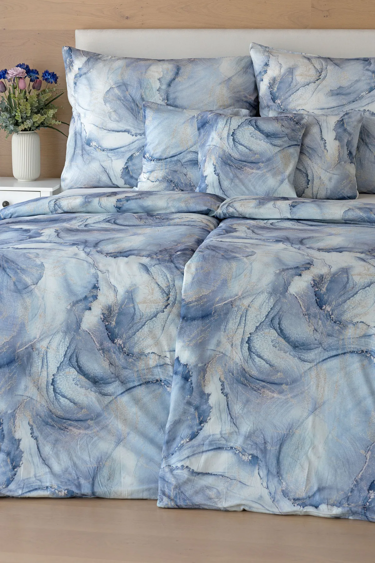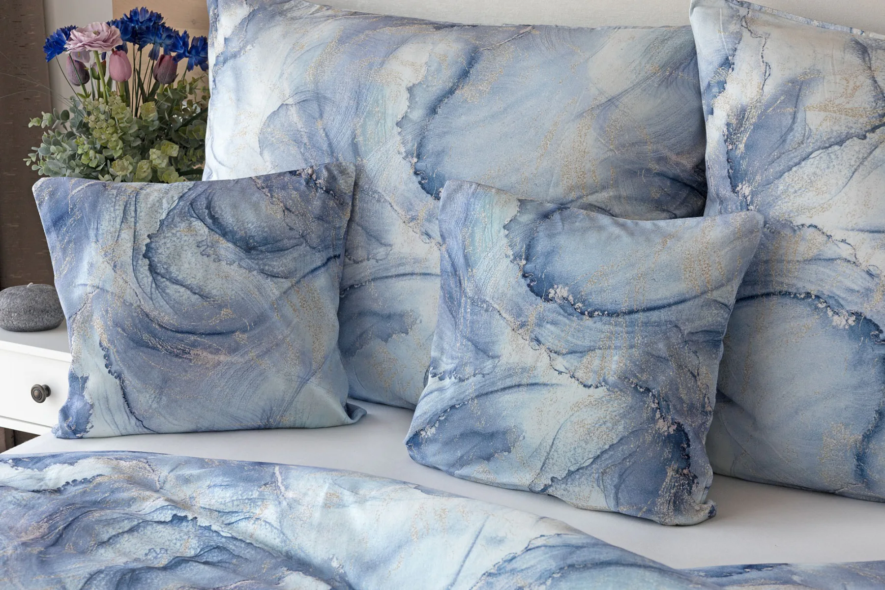 Pro novou kolekci ložního povlečení Mako jersey jsme pečlivě vybírali motivy, které tomuto pružnému materiálu sluší. Abstraktní vzor Odine, který je tvořen paletou modrých tónů protkaných zlatavými prvky, rozzáří vaši ložnici.