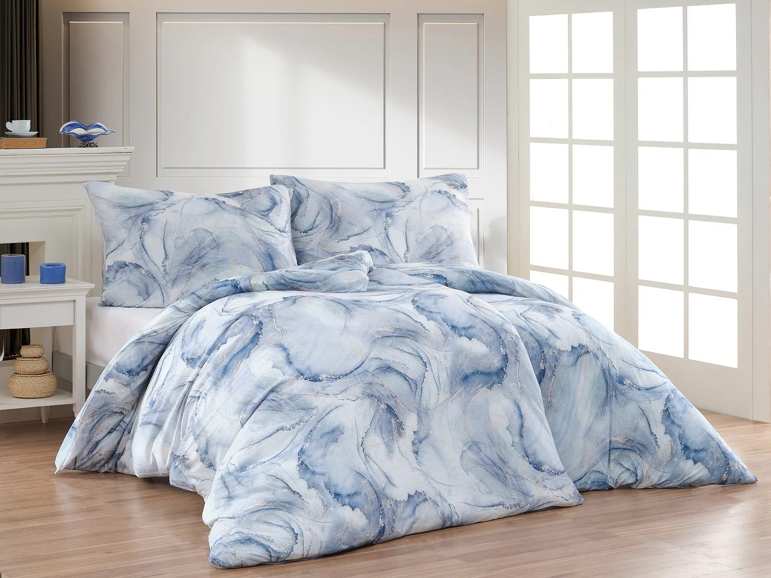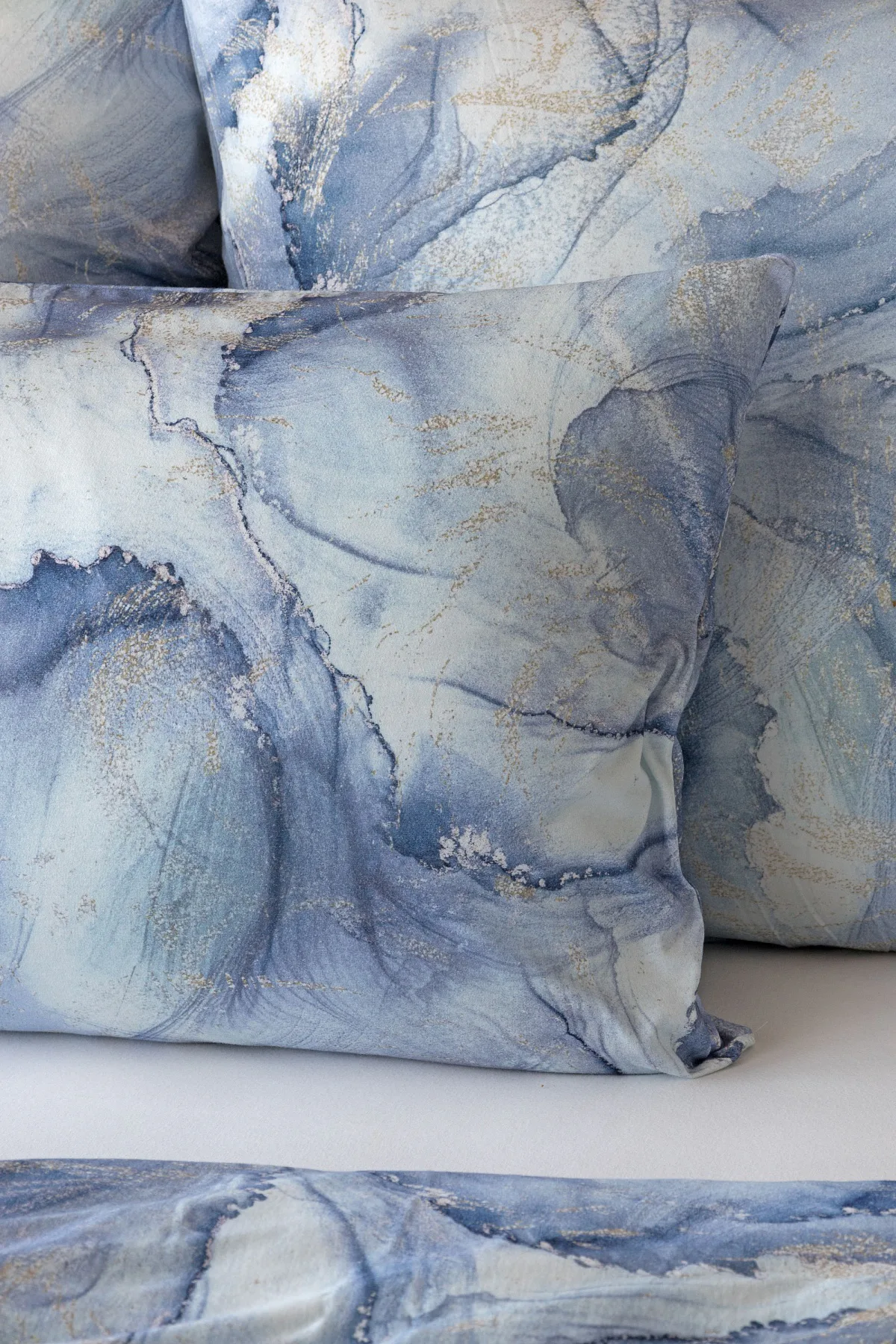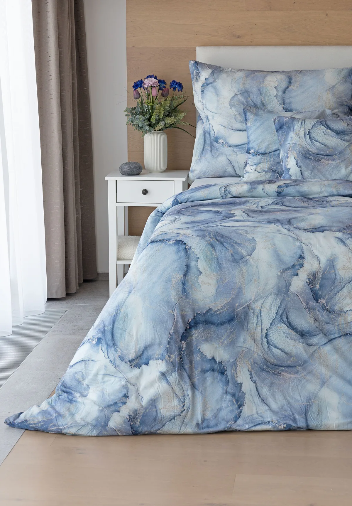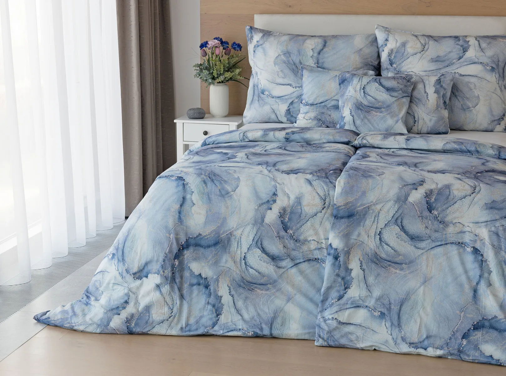 Pro novou kolekci ložního povlečení Mako jersey jsme pečlivě vybírali motivy, které tomuto pružnému materiálu sluší. Abstraktní vzor Odine, který je tvořen paletou modrých tónů protkaných zlatavými prvky, rozzáří vaši ložnici.