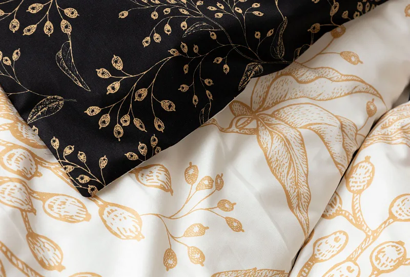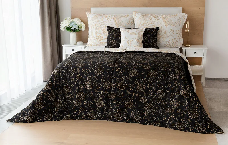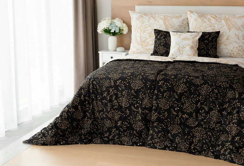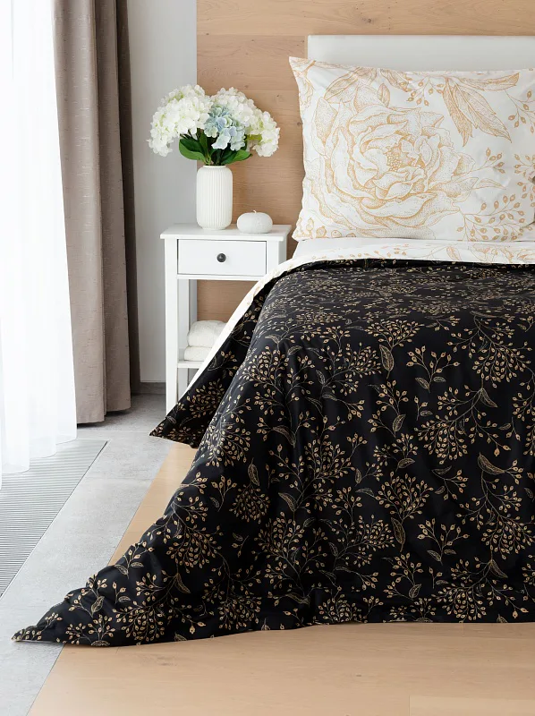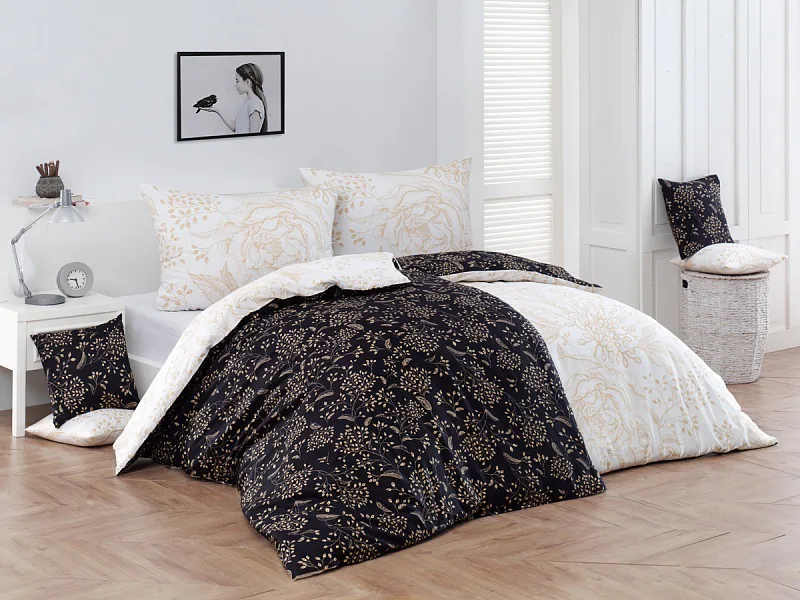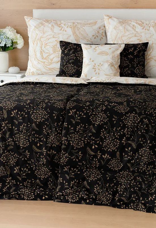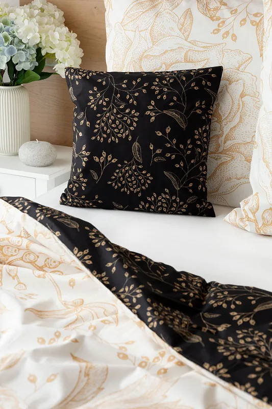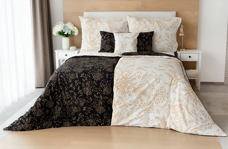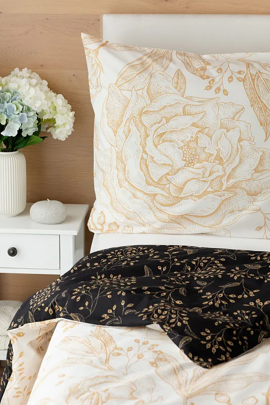 Jemný zlatavý florální vzor vyniká v inverzním provedení. Z vrchní strany povlaku na přikrývku se decentně otiskuje na bílém podkladu, ze spodní strany tentýž vzor zdobí černý podklad. Povlak na polštář je z obou stran v bílém provedení. Povlečení je opatřeno komfortním zipovým uzávěrem.
