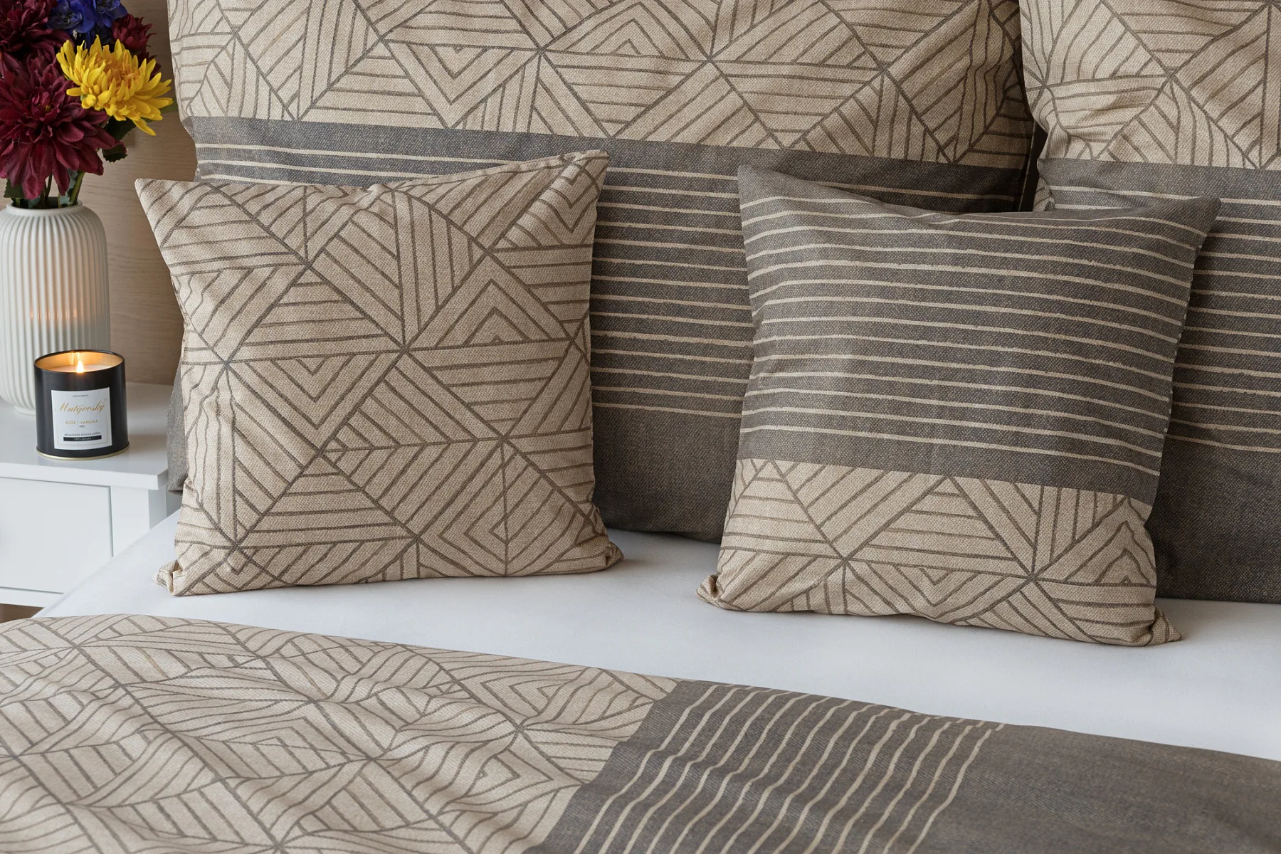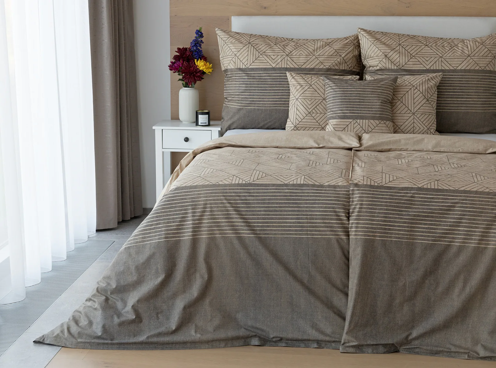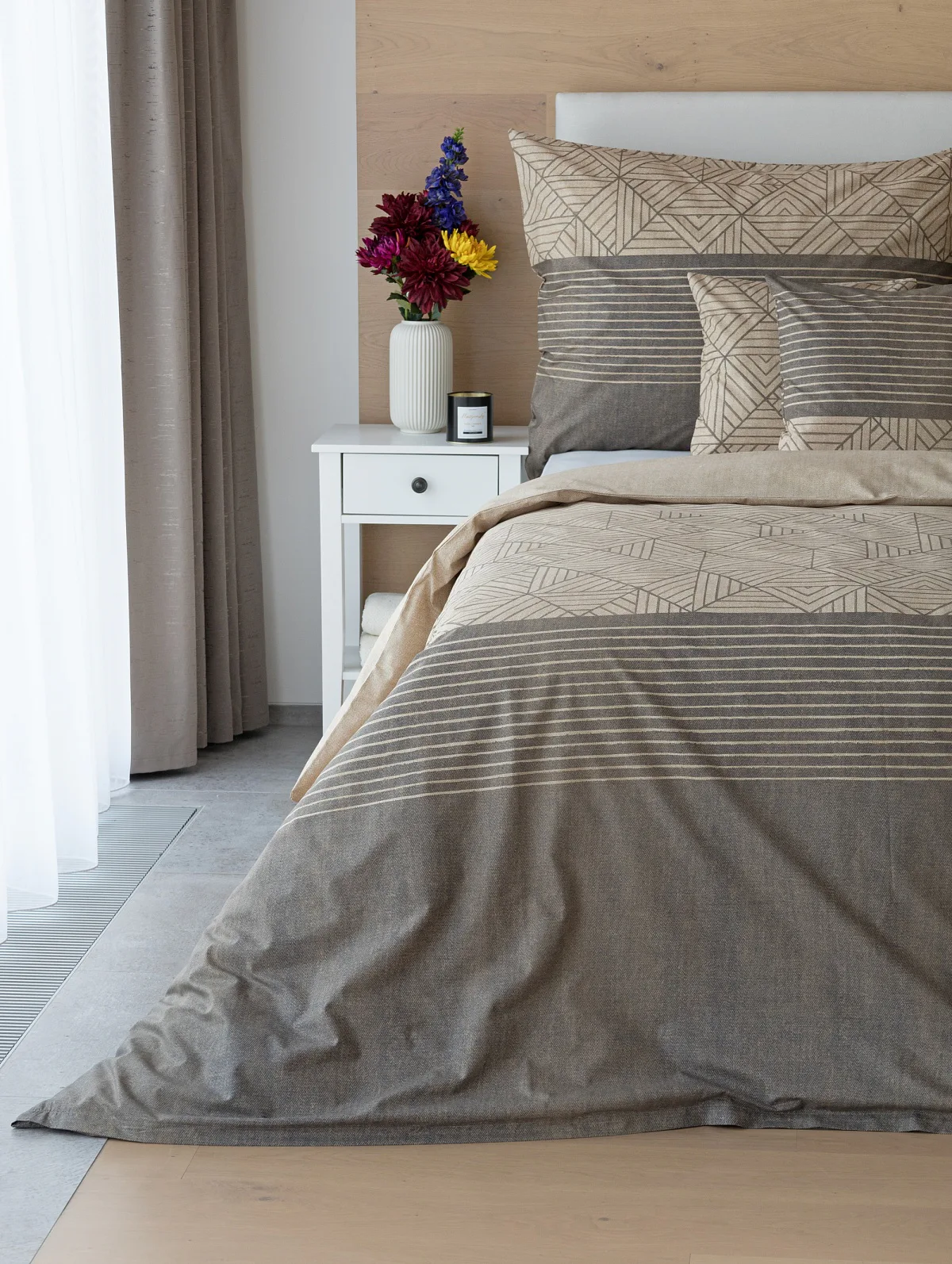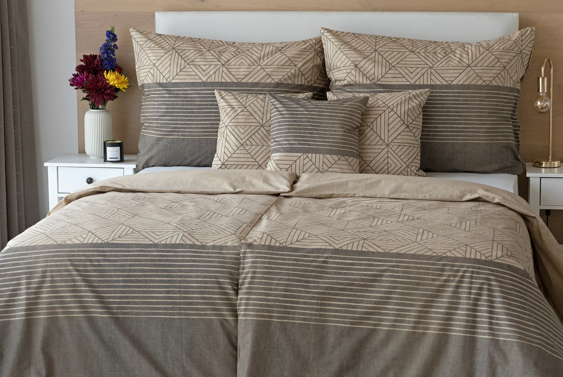 Zařiďte si ložnici ve znamení střídmé elegance s bavlněným povlečením Pietro. Jemný geometrický vzor v kombinaci šedých, přírodních béžových a hnědých tónů dodá interiéru hřejivý nádech.