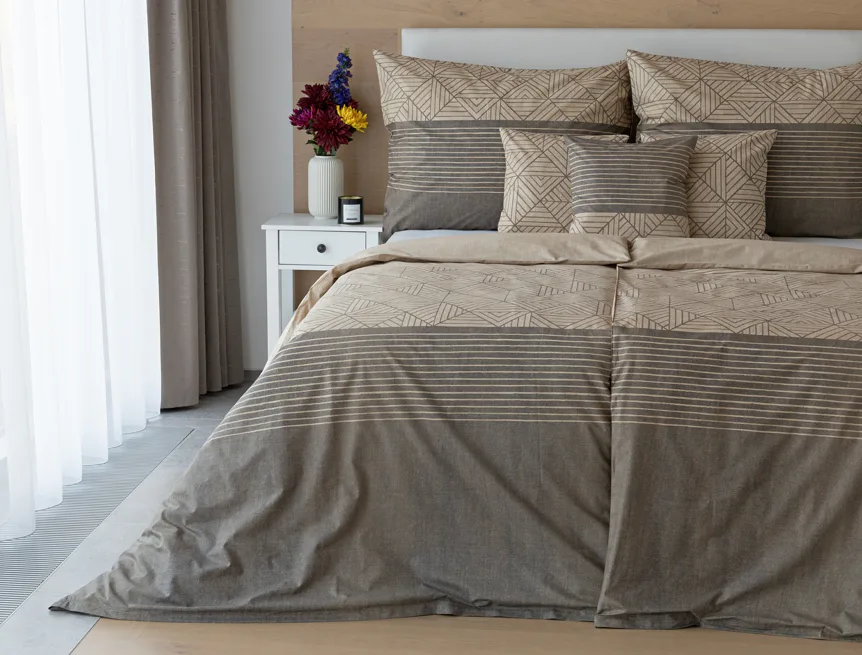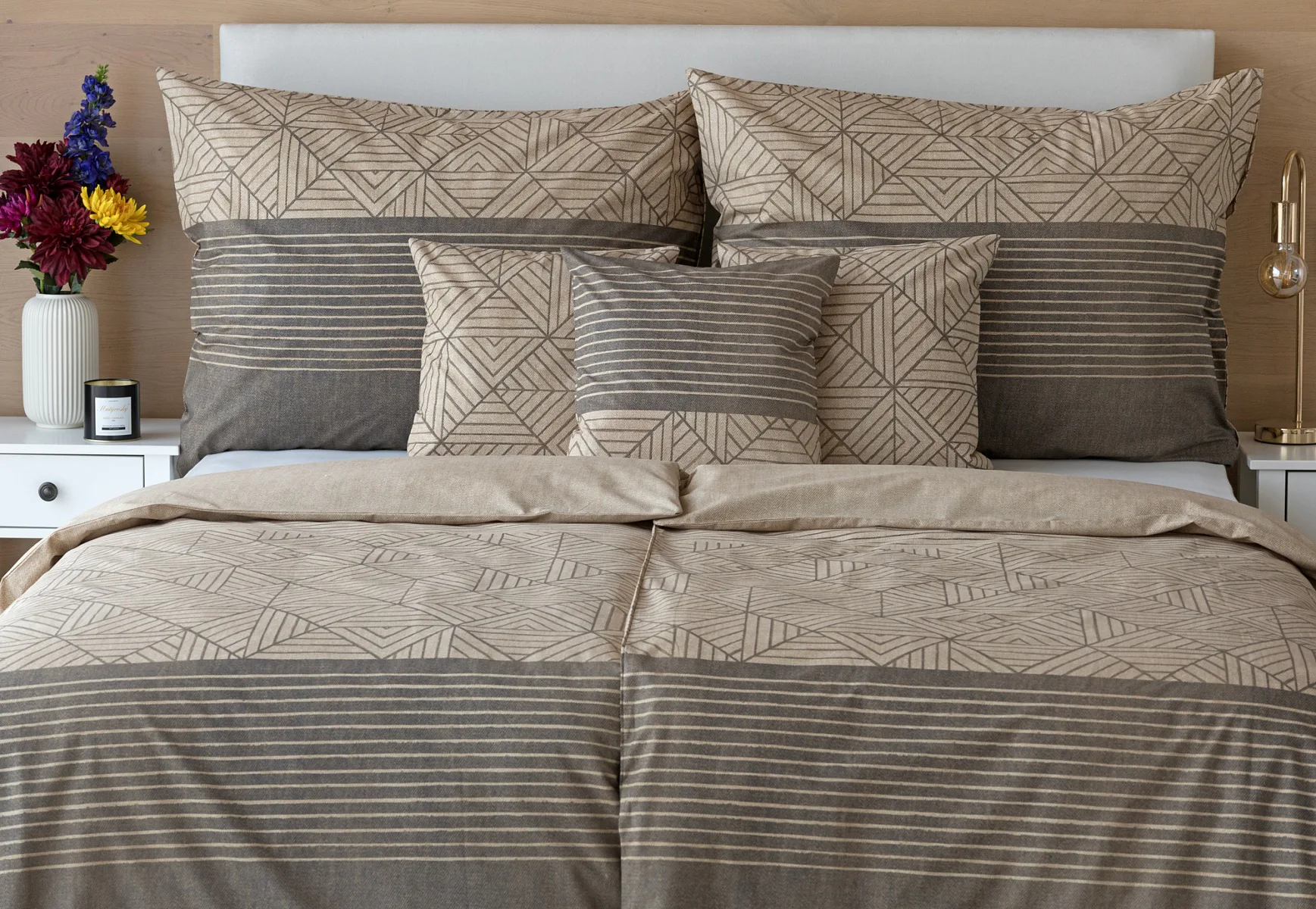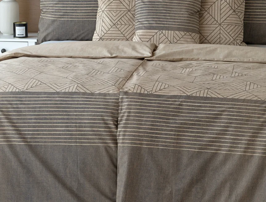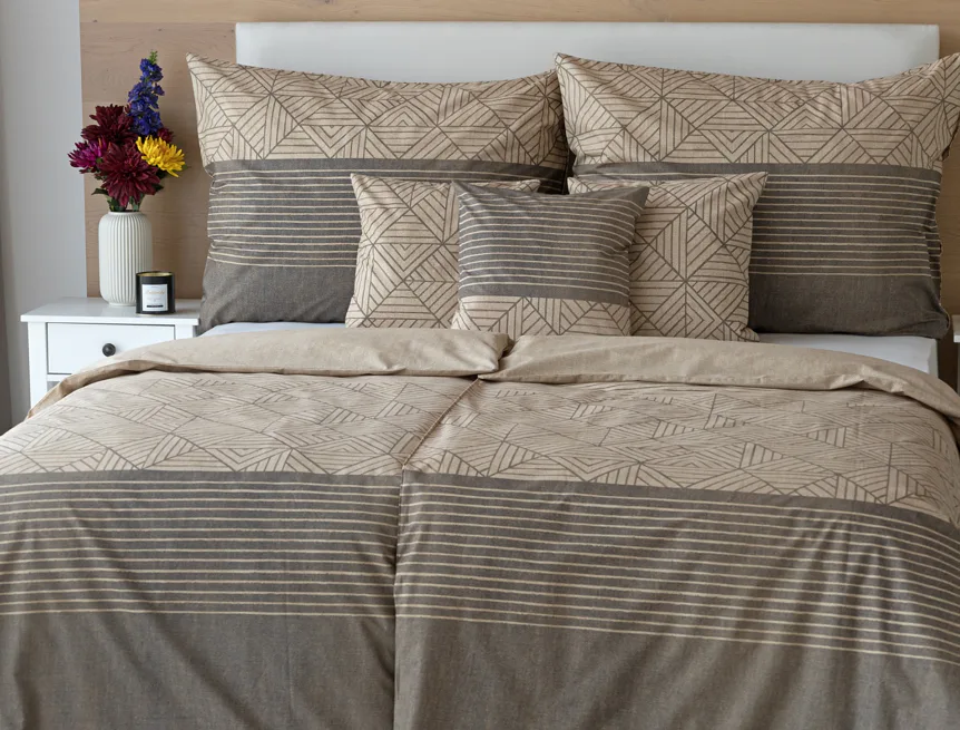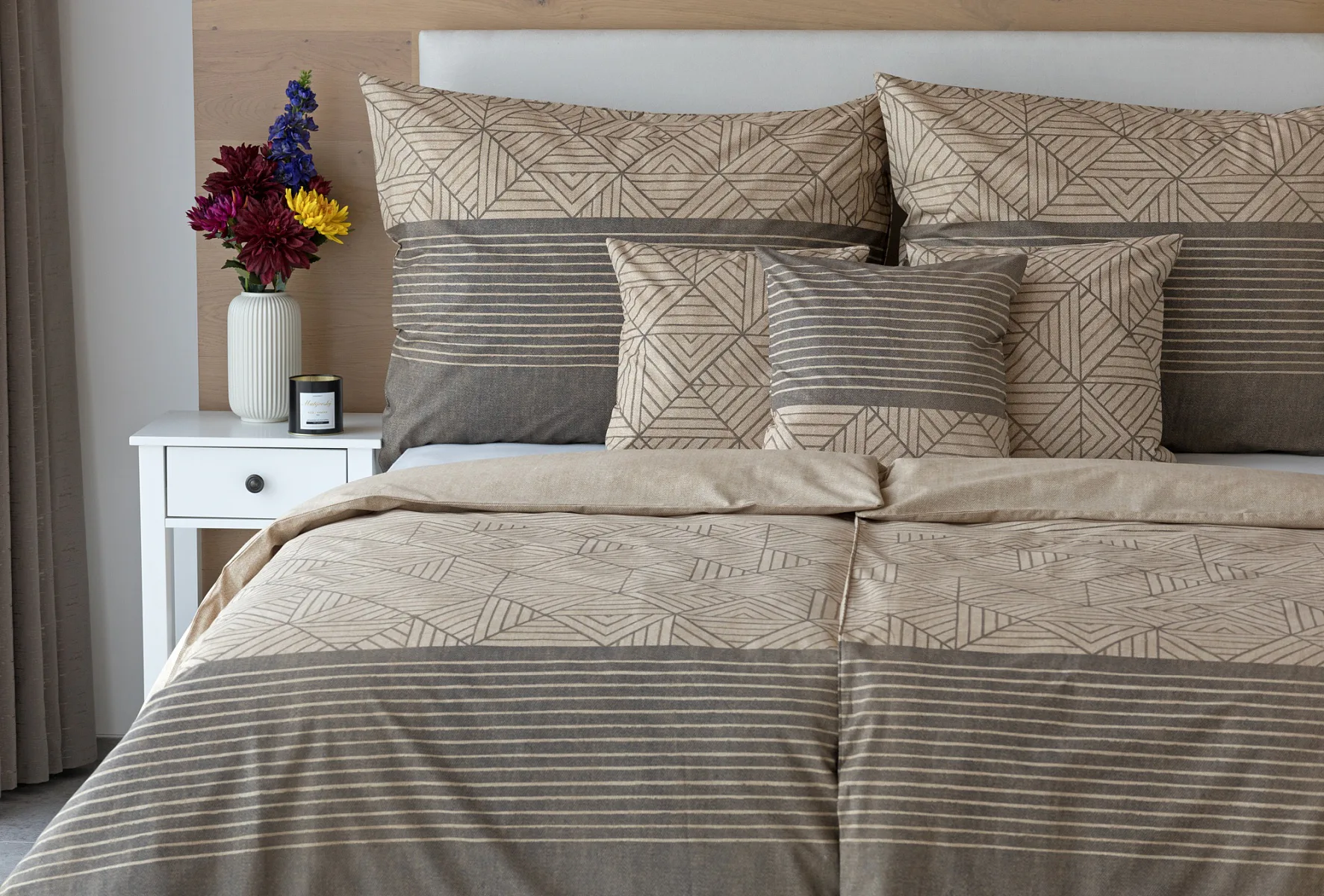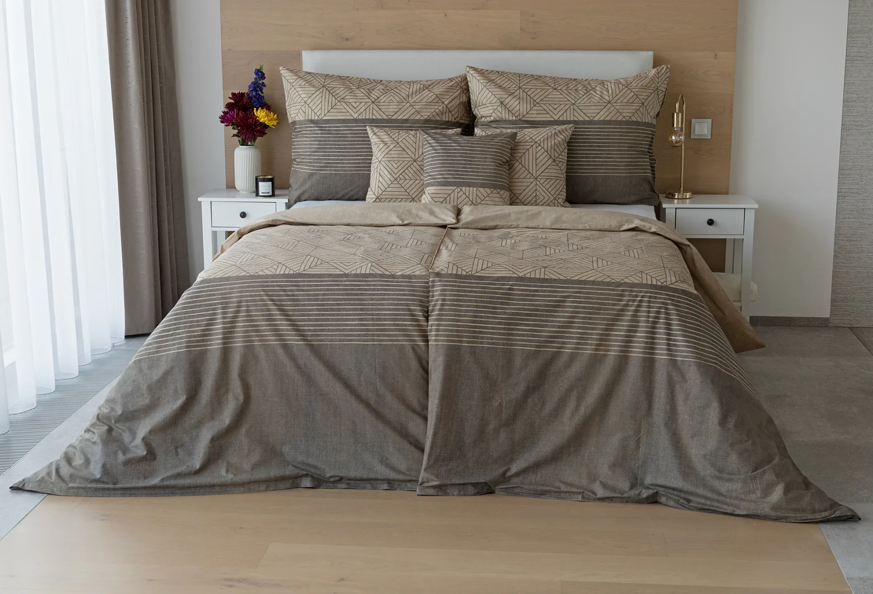 Zařiďte si ložnici ve znamení střídmé elegance s bavlněným povlečením Pietro. Jemný geometrický vzor v kombinaci šedých, přírodních béžových a hnědých tónů dodá interiéru hřejivý nádech.
