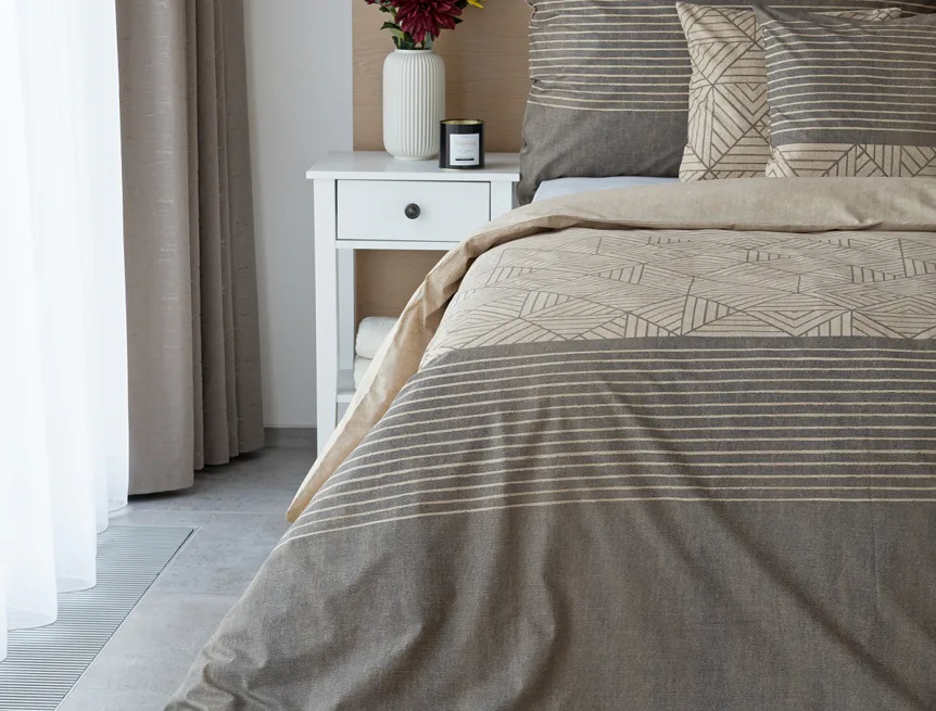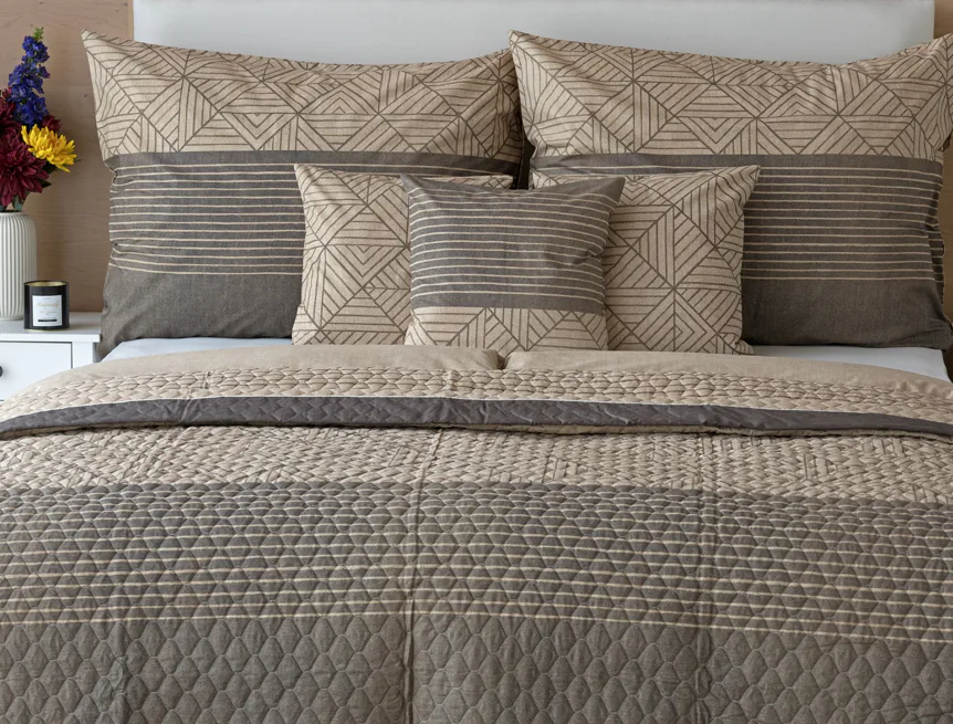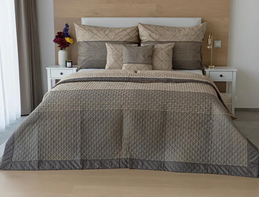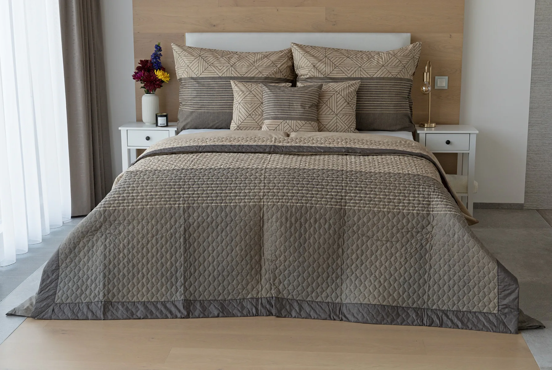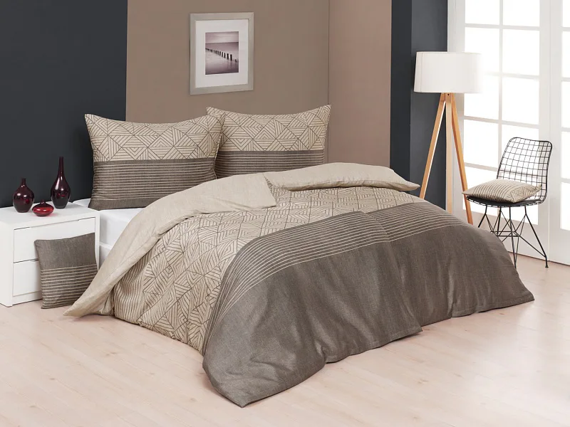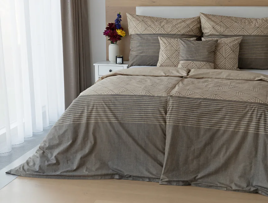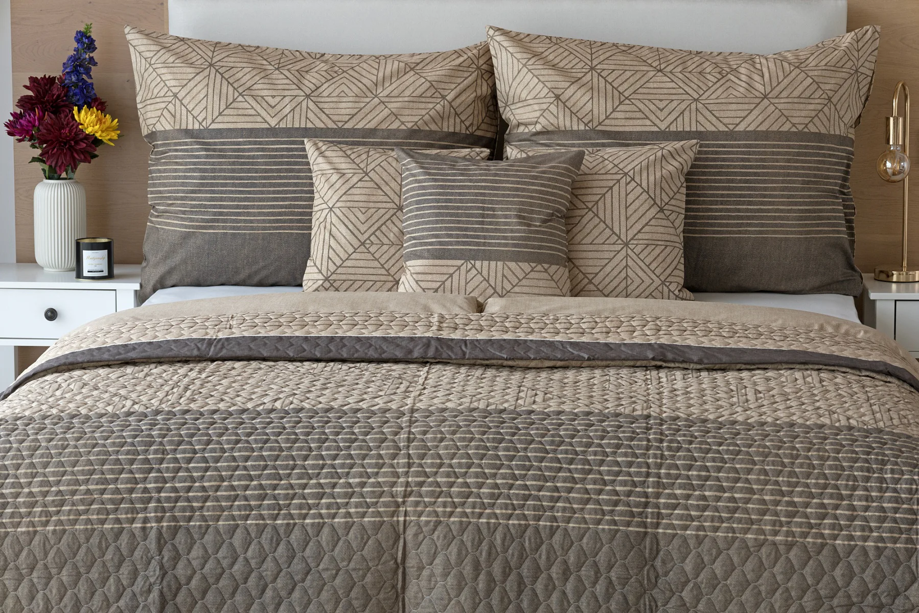 Zařiďte si ložnici ve znamení střídmé elegance s bavlněným povlečením Pietro. Jemný geometrický vzor v kombinaci šedých, přírodních béžových a hnědých tónů dodá interiéru hřejivý nádech.