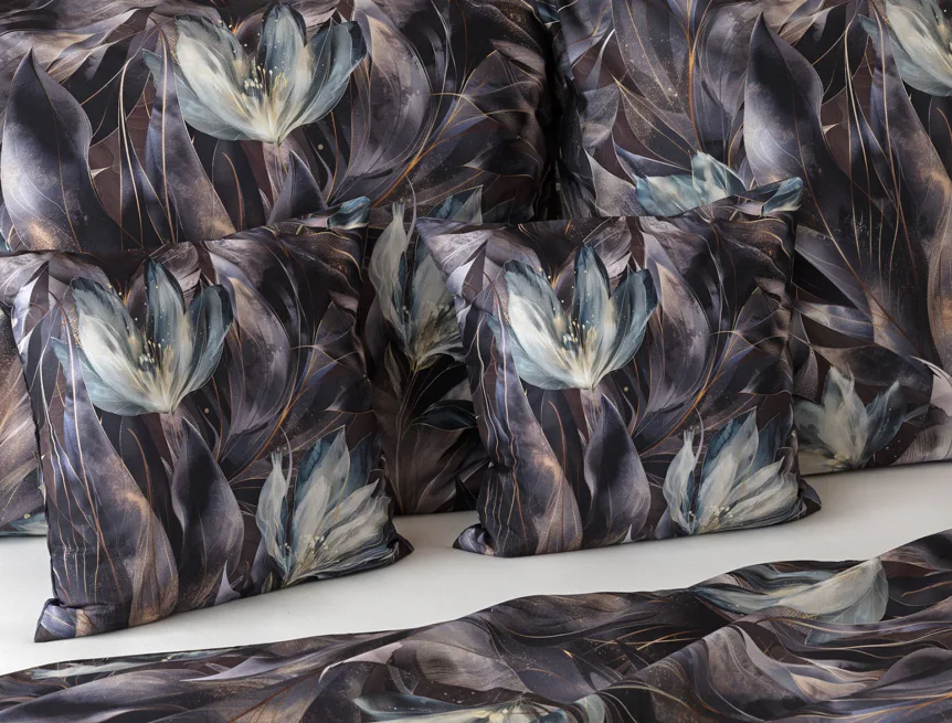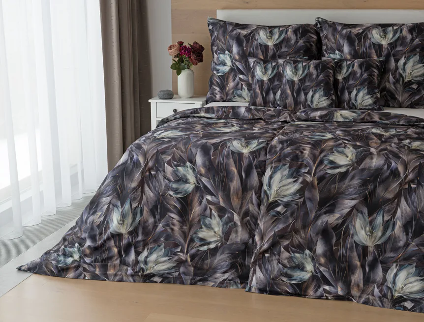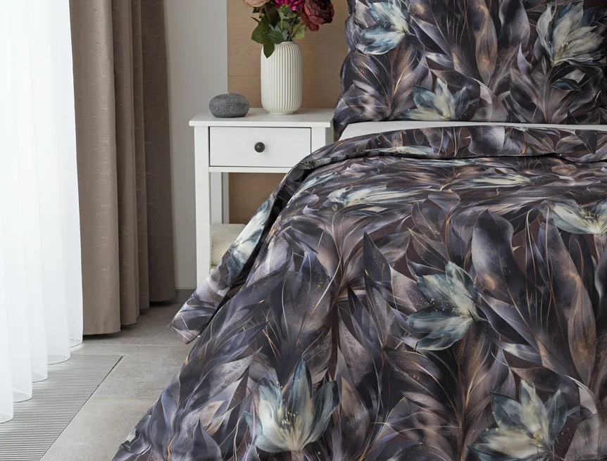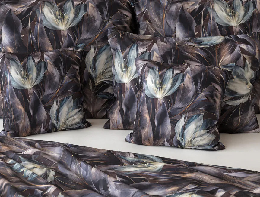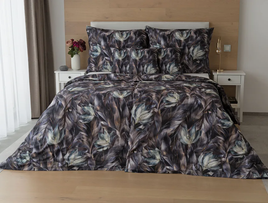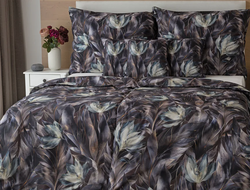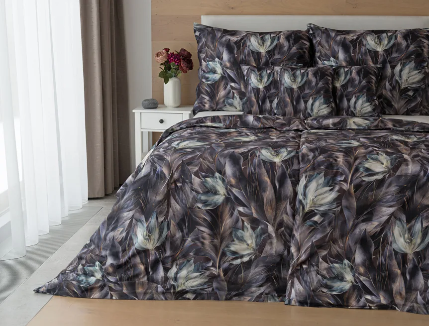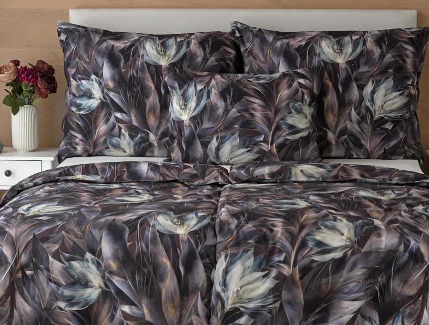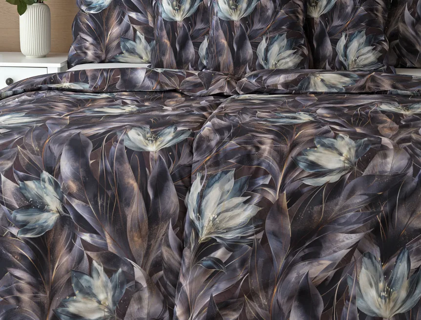 Vychutnejte si magické souznění barev v okouzlujícím vzoru ložního povlečení Poema, které se stane dominantou vaší ložnice. Abstraktní květy v paletě temně fialových a tlumeně petrolejových tónů vynikají v precizním detailu díky nejmodernějšímu digitálnímu tisku.