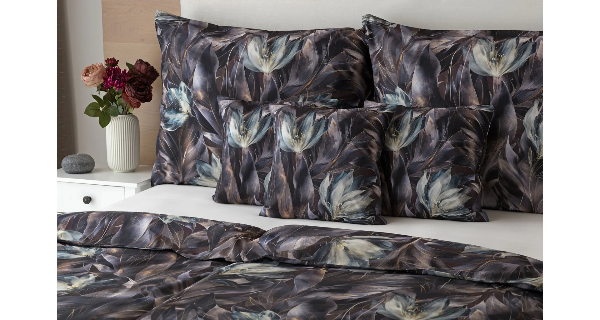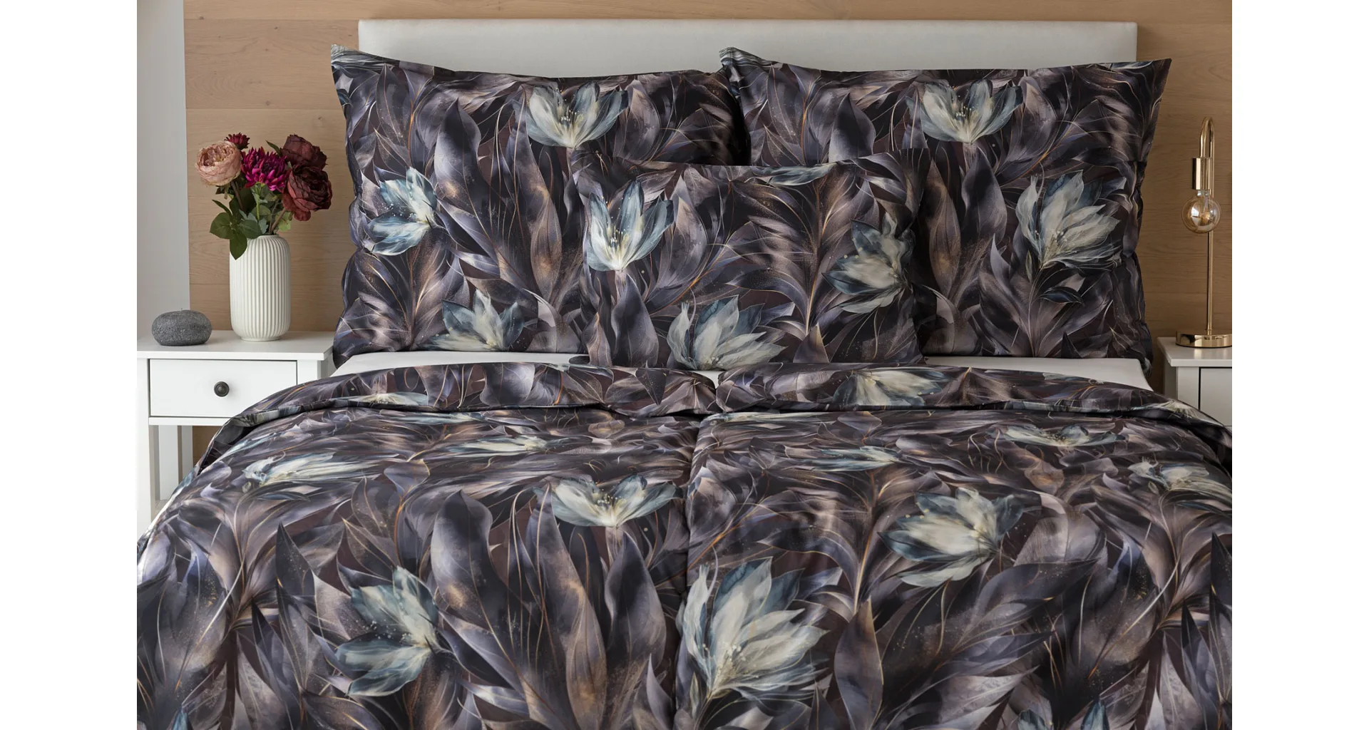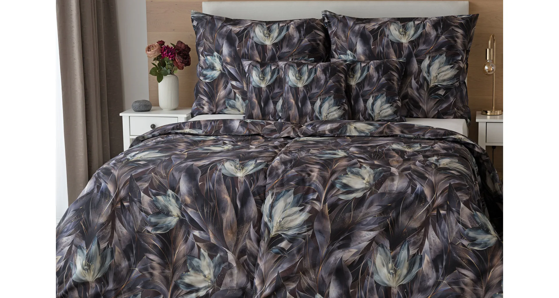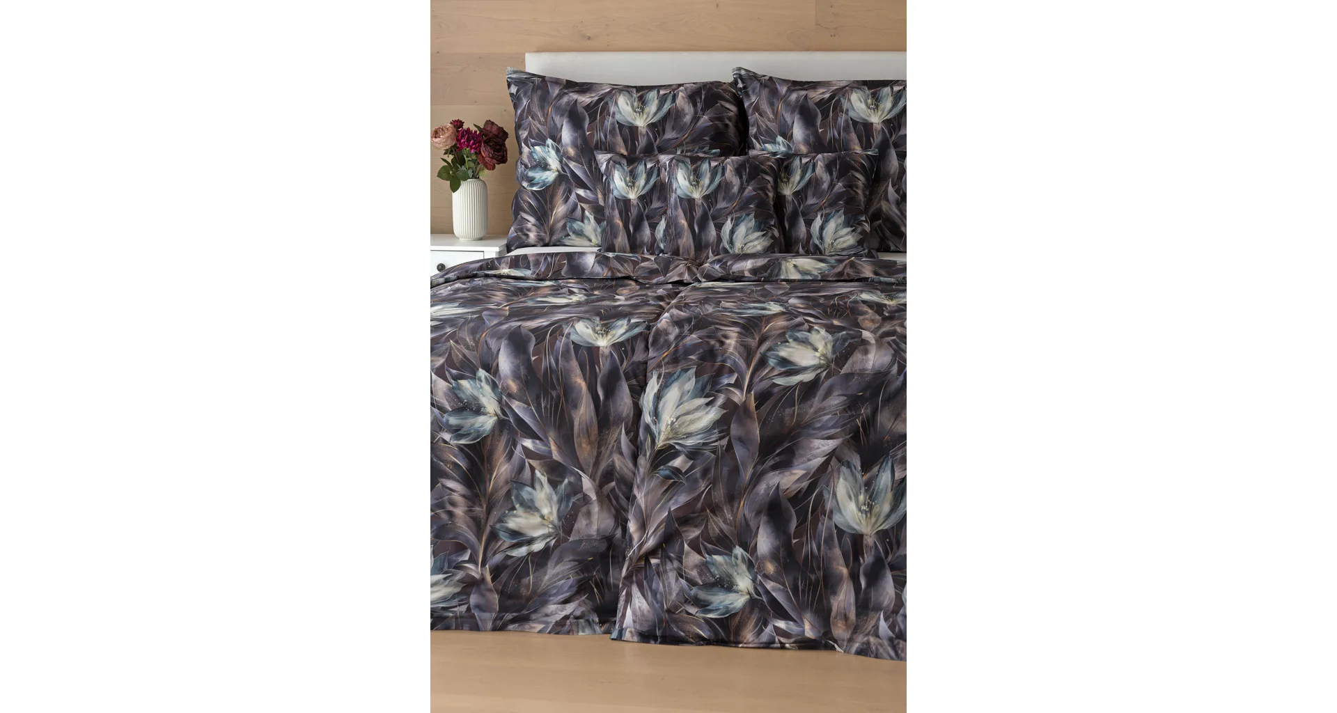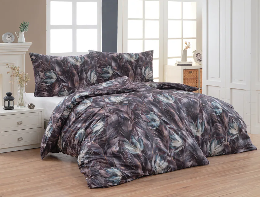 Vychutnejte si magické souznění barev v okouzlujícím vzoru ložního povlečení Poema, které se stane dominantou vaší ložnice. Abstraktní květy v paletě temně fialových a tlumeně petrolejových tónů vynikají v precizním detailu díky nejmodernějšímu digitálnímu tisku.