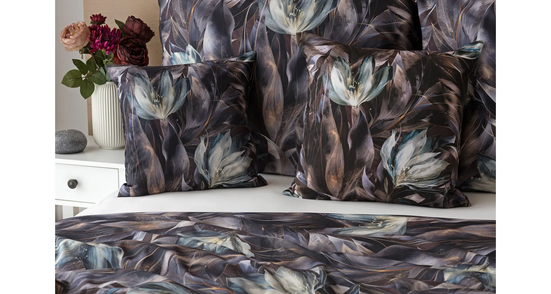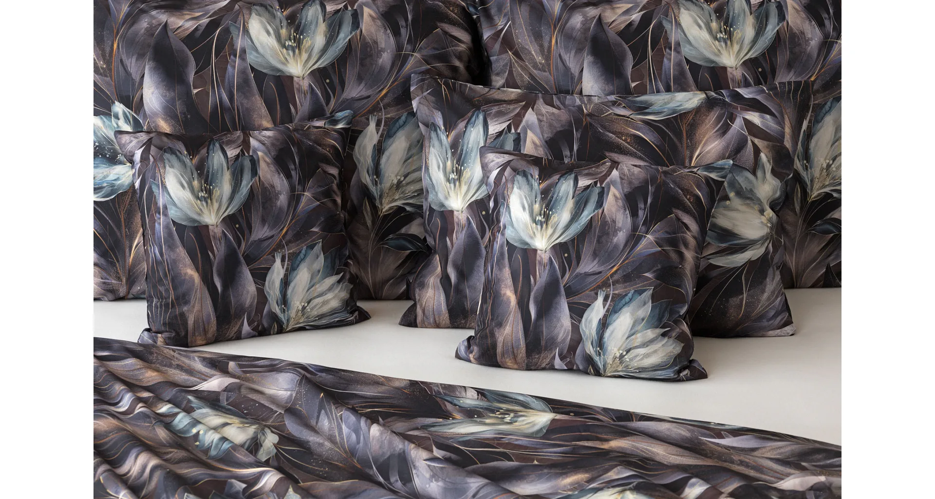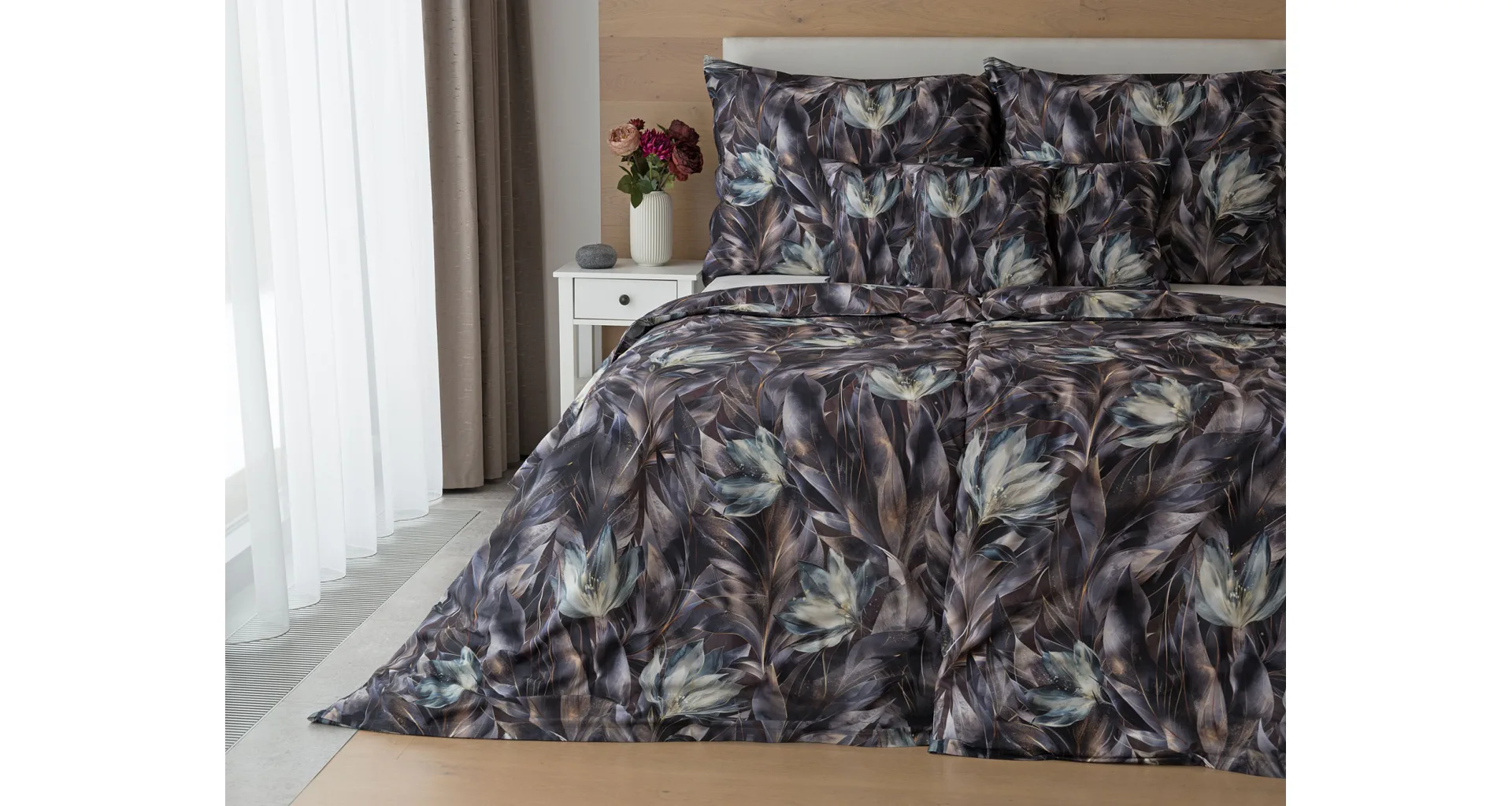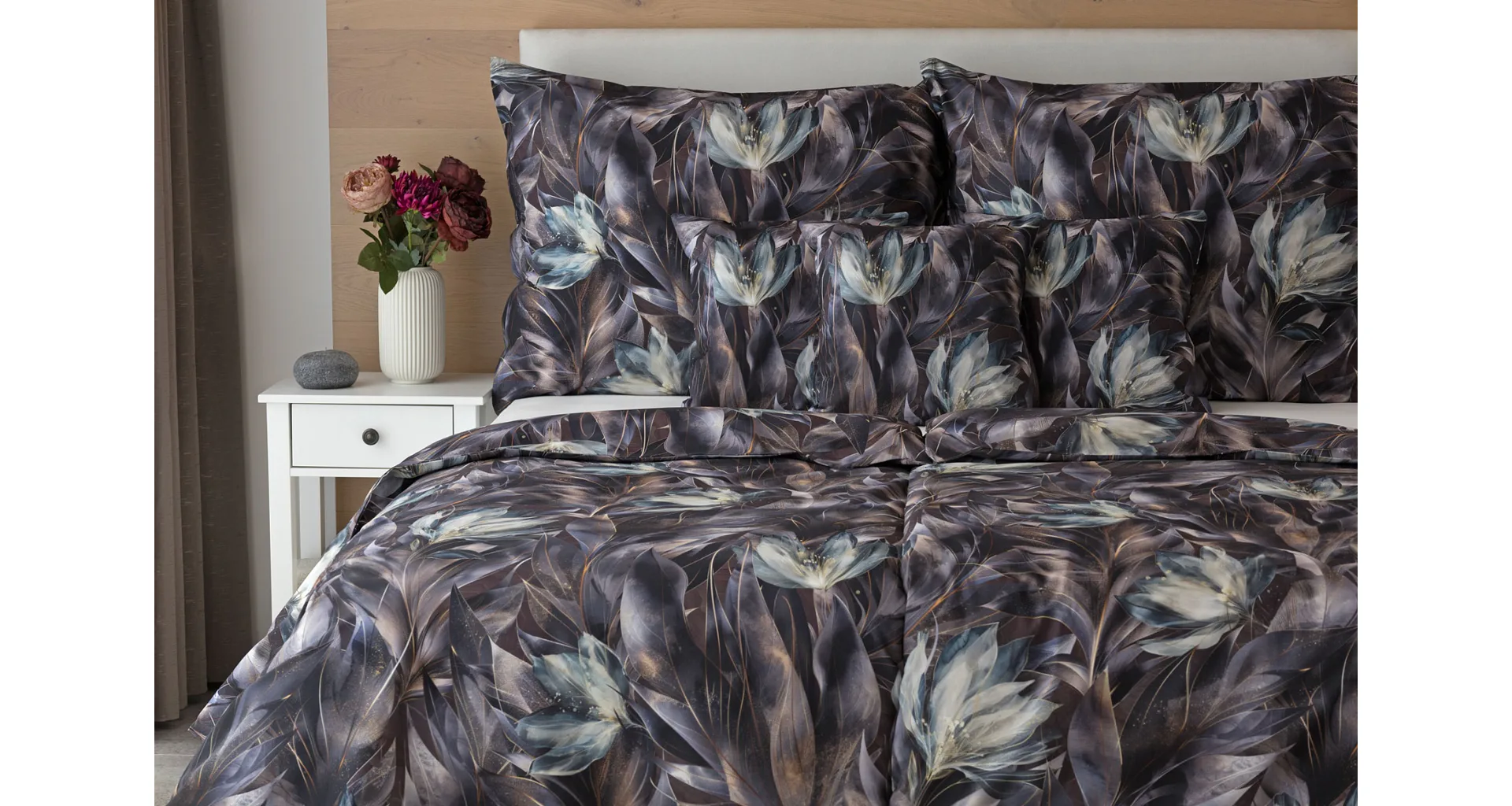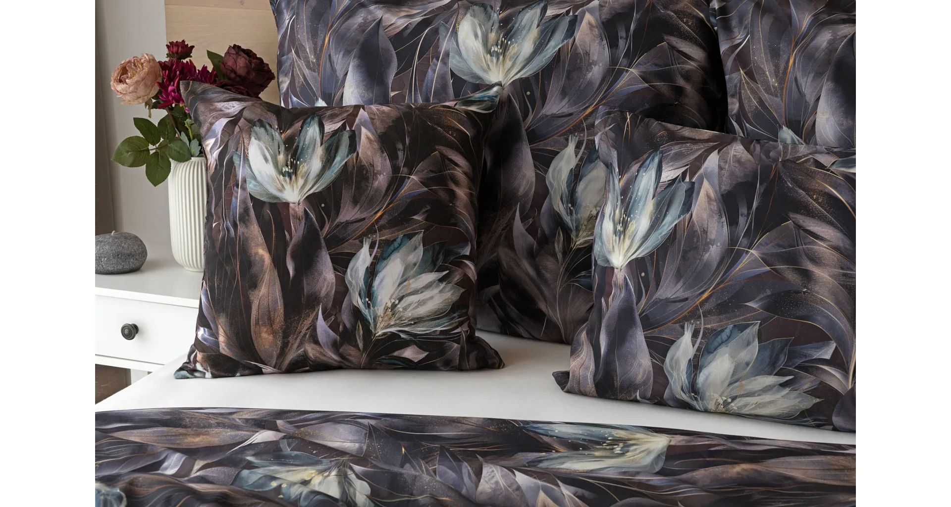 Vychutnejte si magické souznění barev v okouzlujícím vzoru ložního povlečení Poema, které se stane dominantou vaší ložnice. Abstraktní květy v paletě temně fialových a tlumeně petrolejových tónů vynikají v precizním detailu díky nejmodernějšímu digitálnímu tisku.