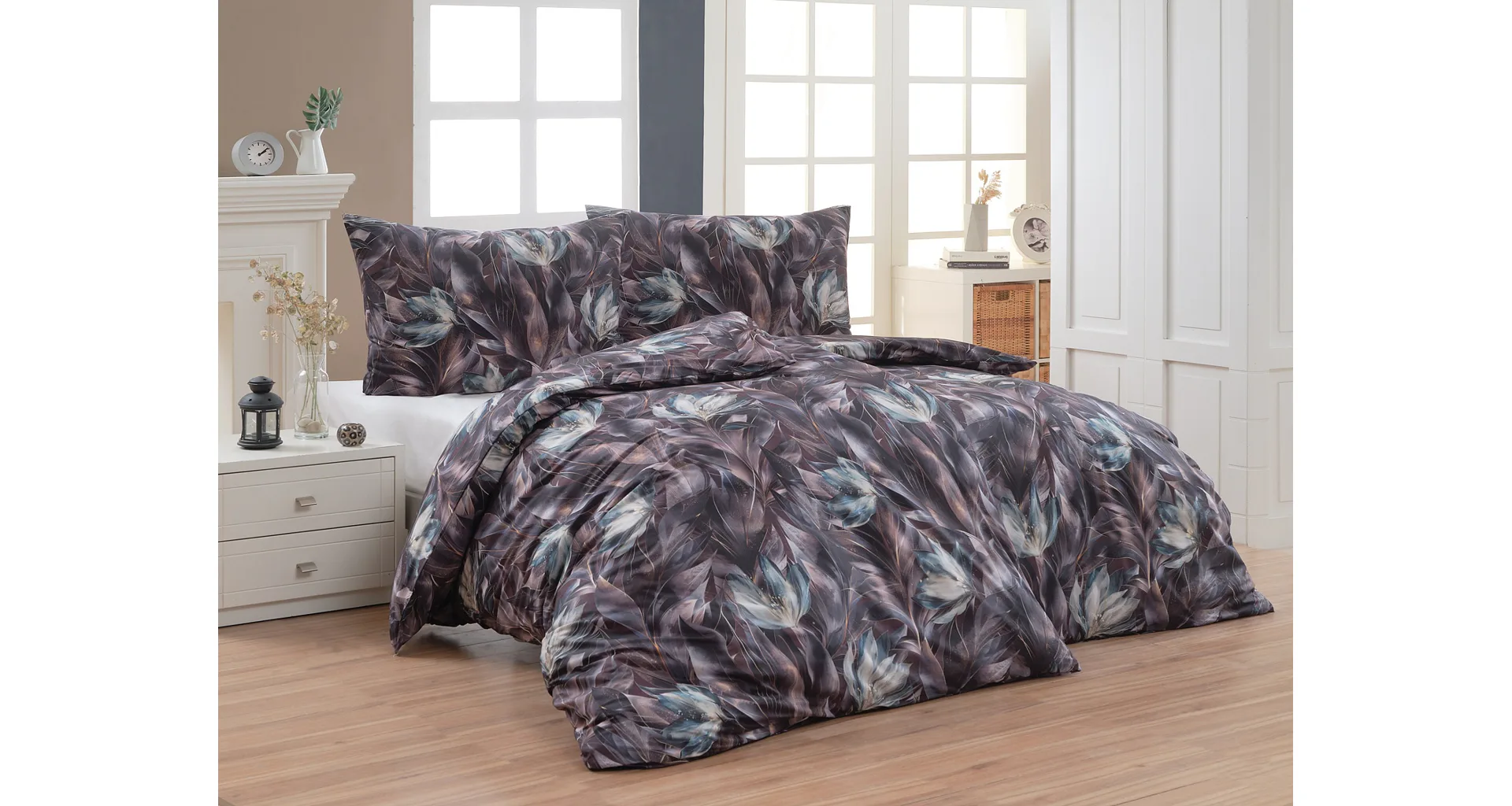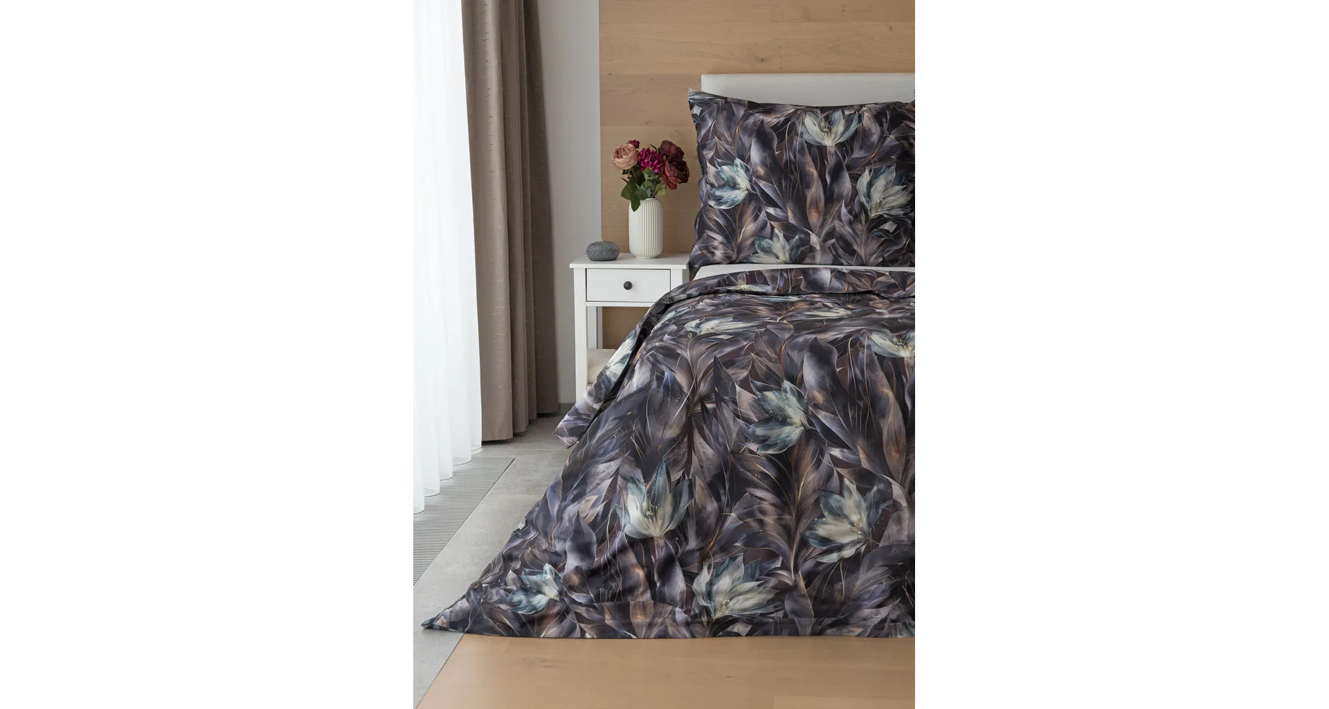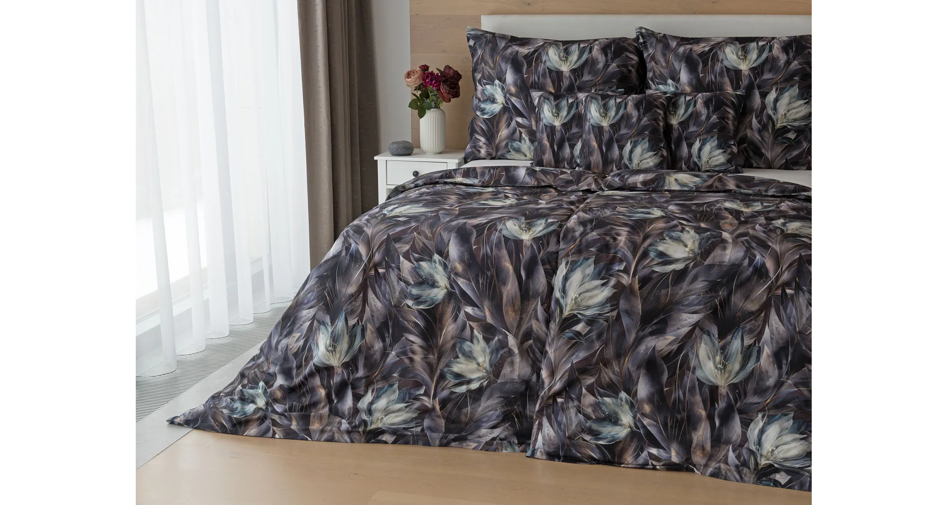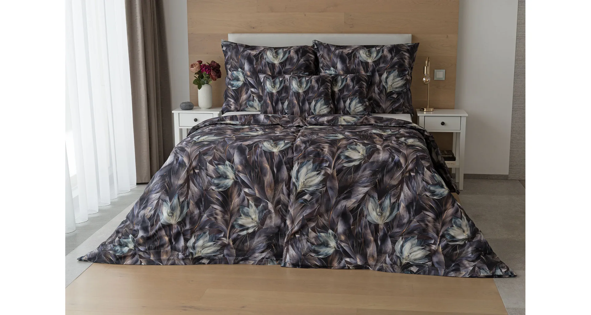 Vychutnejte si magické souznění barev v okouzlujícím vzoru ložního povlečení Poema, které se stane dominantou vaší ložnice. Abstraktní květy v paletě temně fialových a tlumeně petrolejových tónů vynikají v precizním detailu díky nejmodernějšímu digitálnímu tisku.