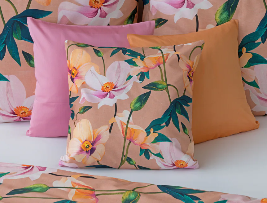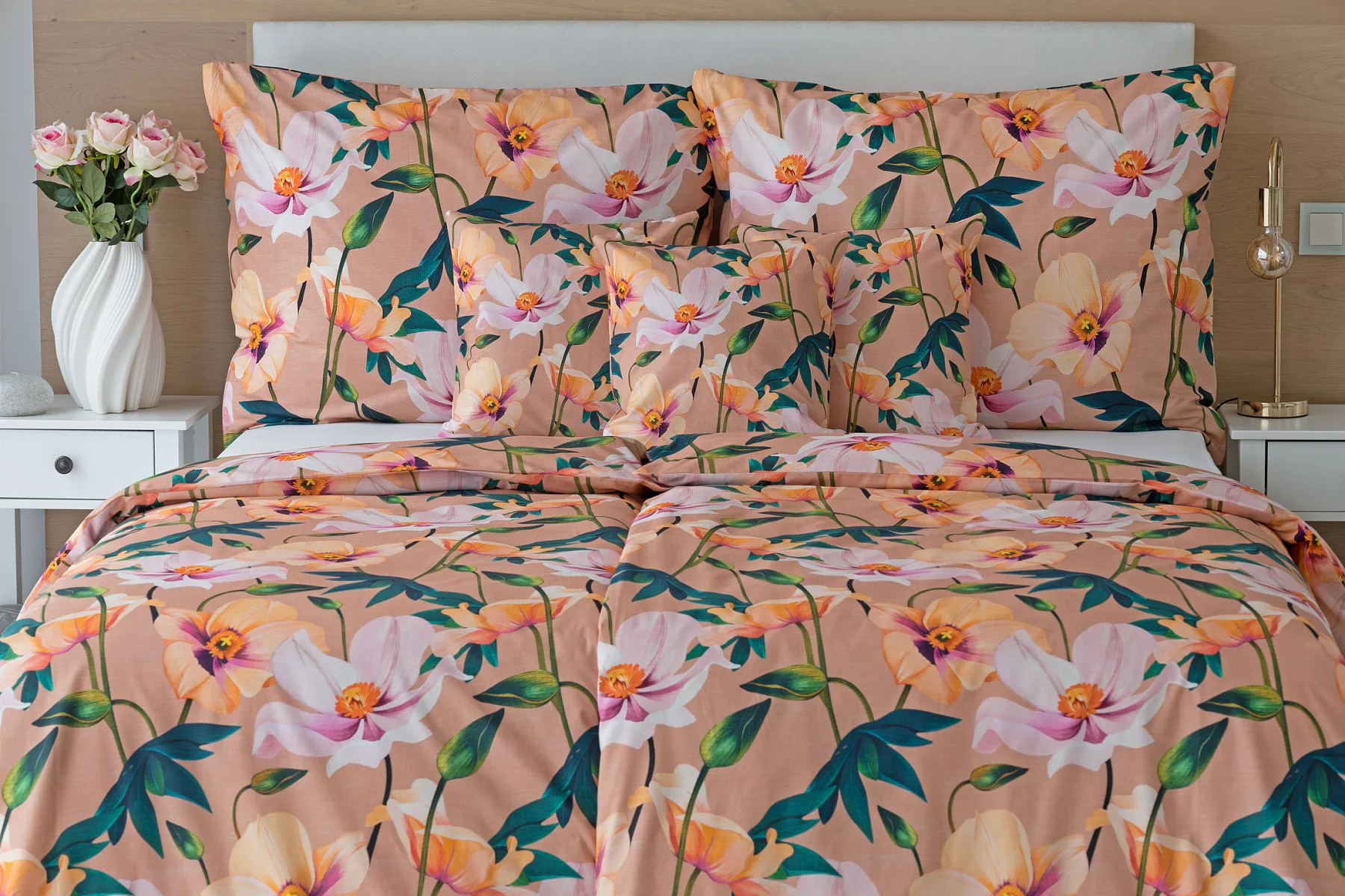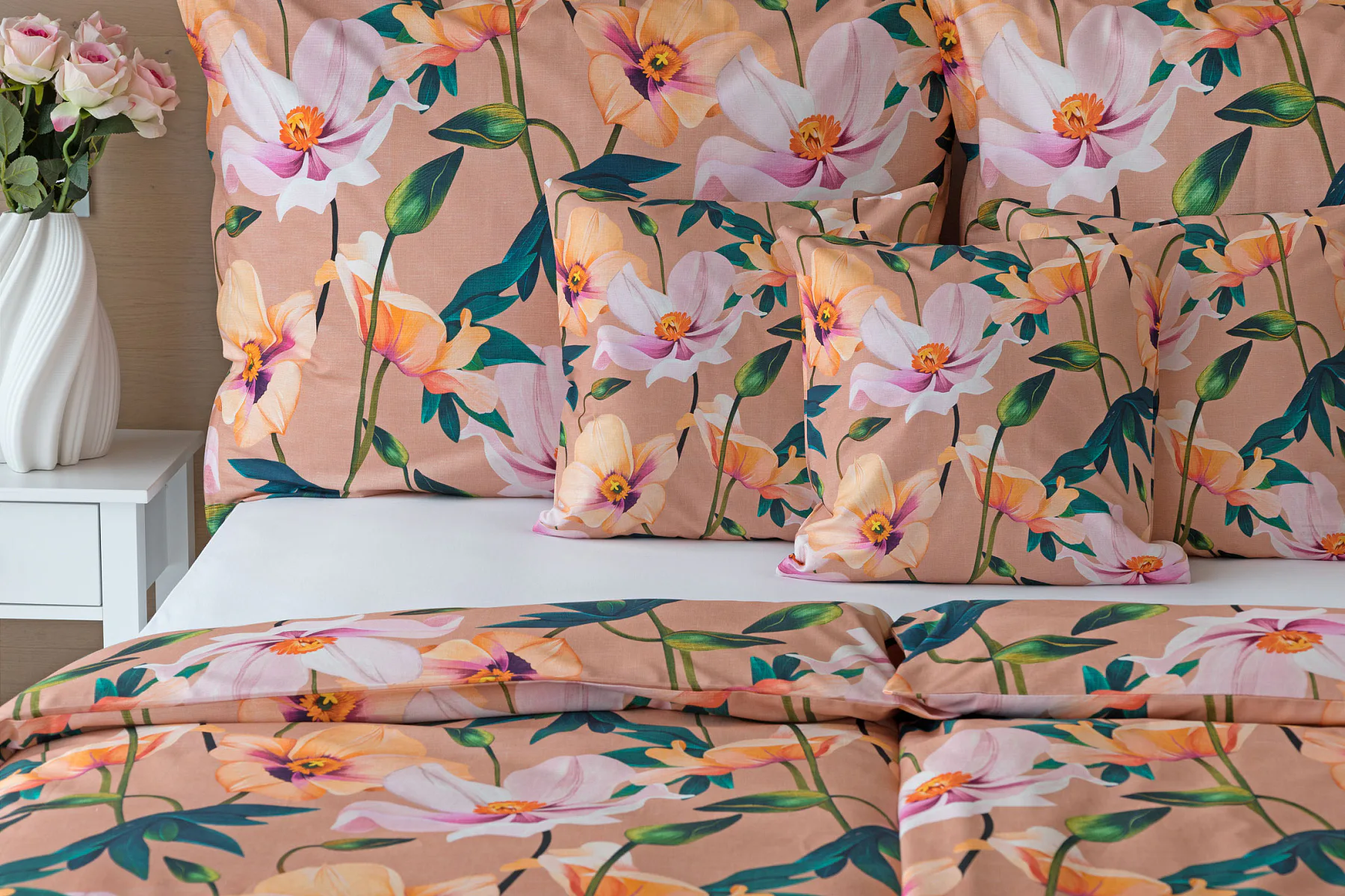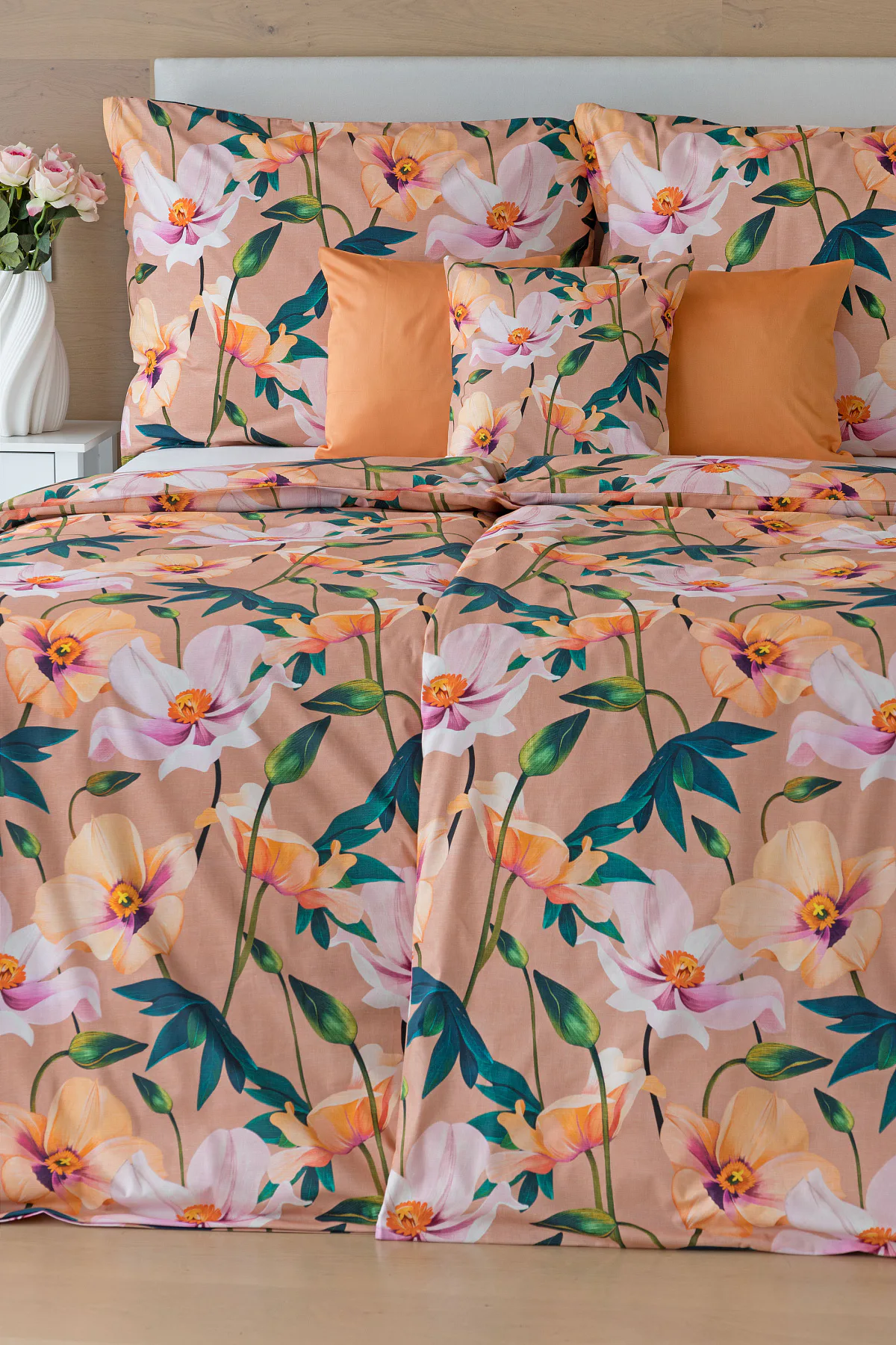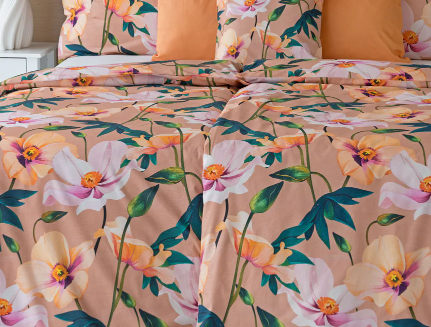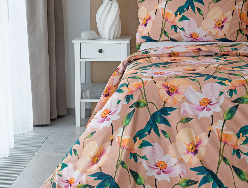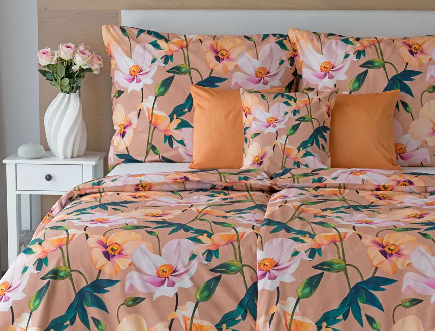 Květinové ložní povlečení Poppy vnese do vaší ložnice nádech svěžesti. Decentní barevná paleta mákových květů v kombinaci s výraznými zelenými listy dodává povlečení atraktivní vzhled, který oživí a zútulní každý interiér. Podkladová barva nese jemné tóny pudrové, meruňkové a korálové, doplněné jemnou tečkovanou strukturou. Dopřejte si každou noc dotek přírody a probouzejte se obklopeni květy.