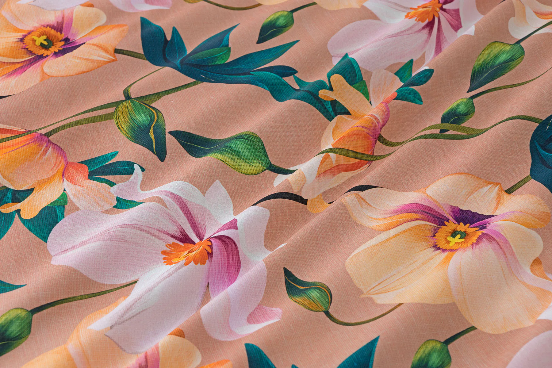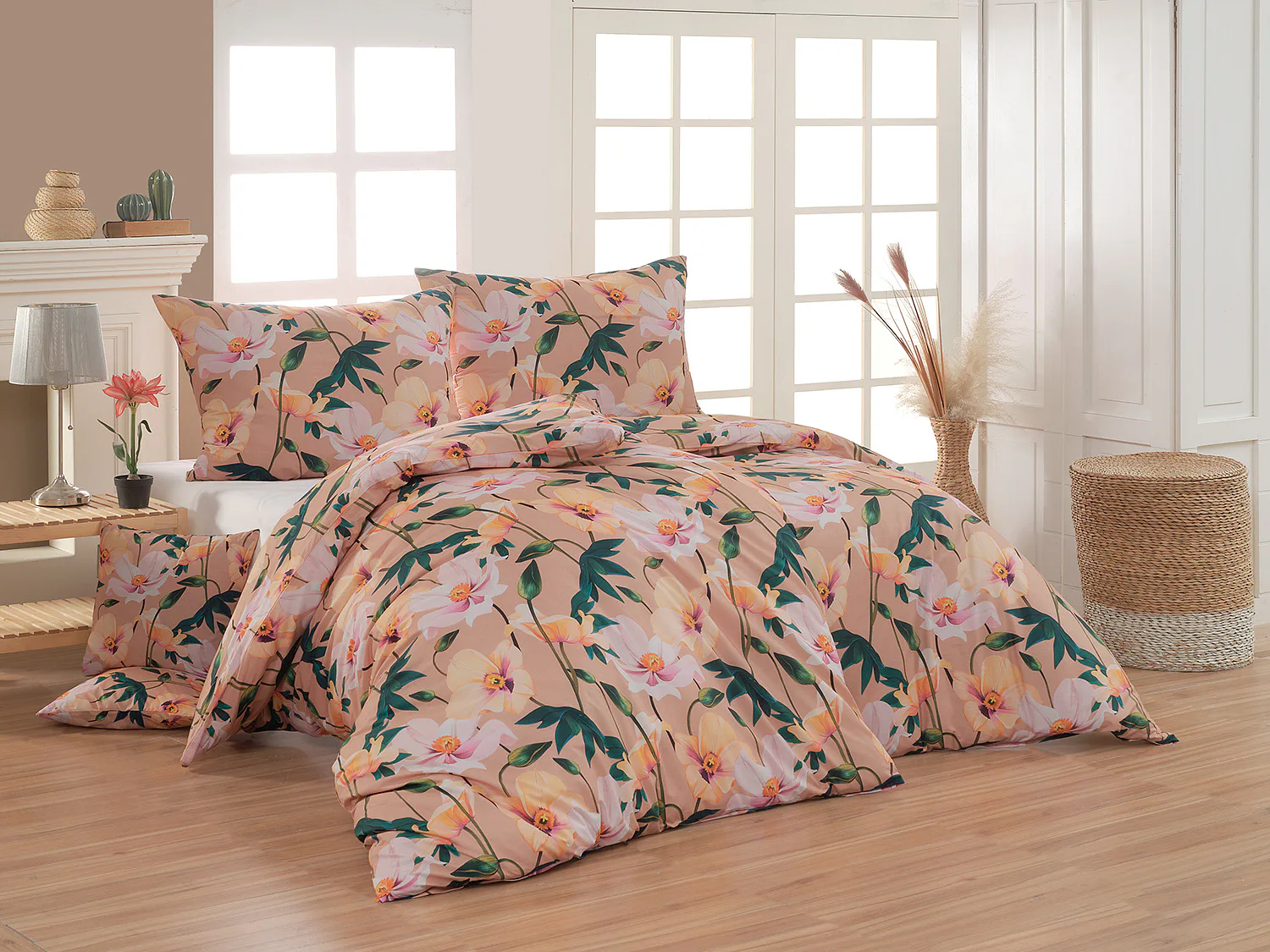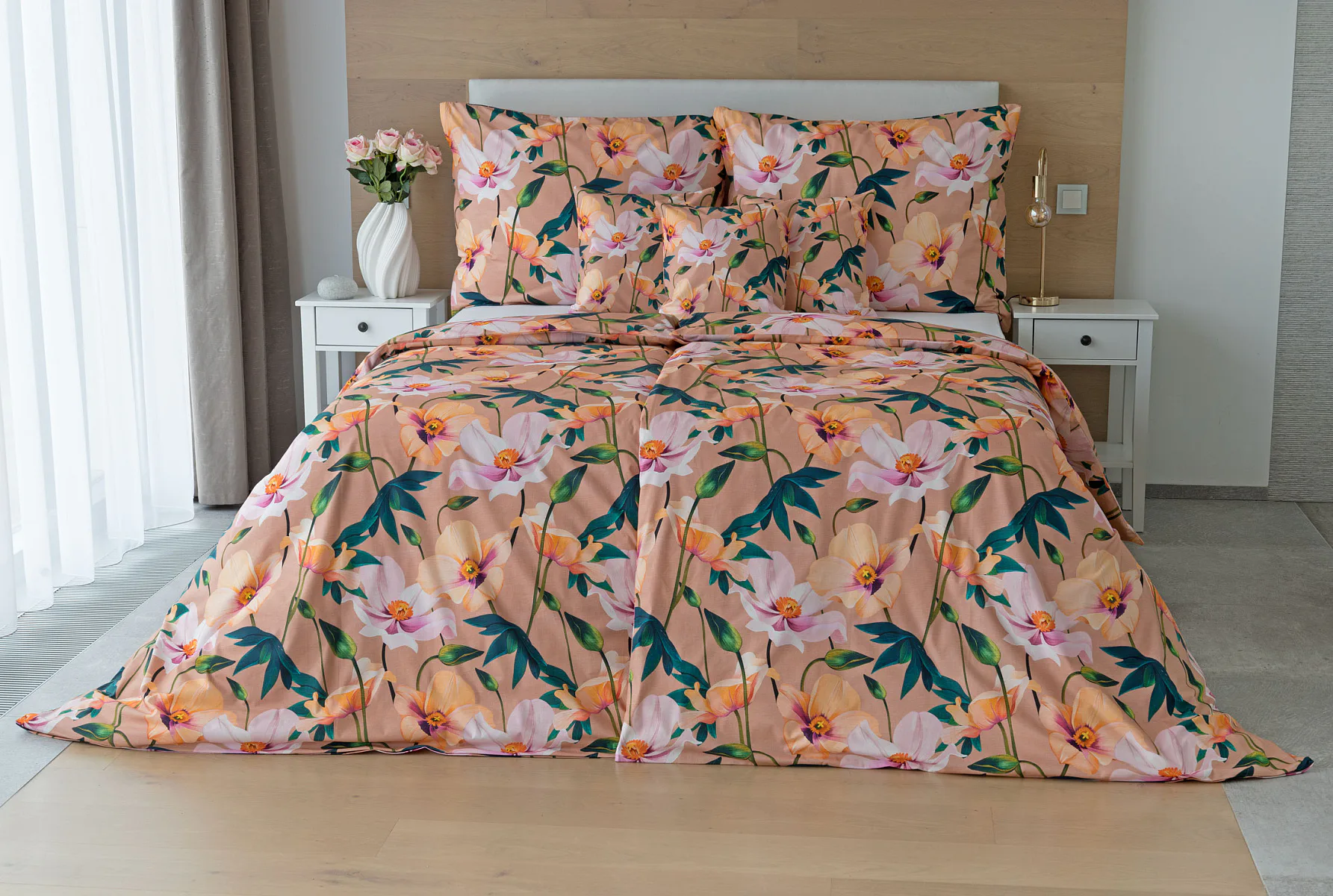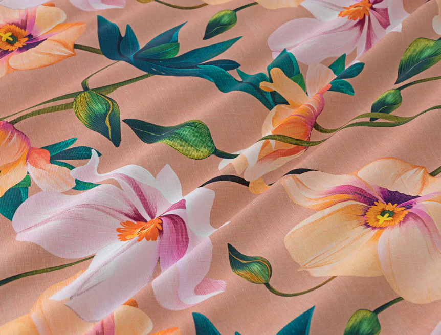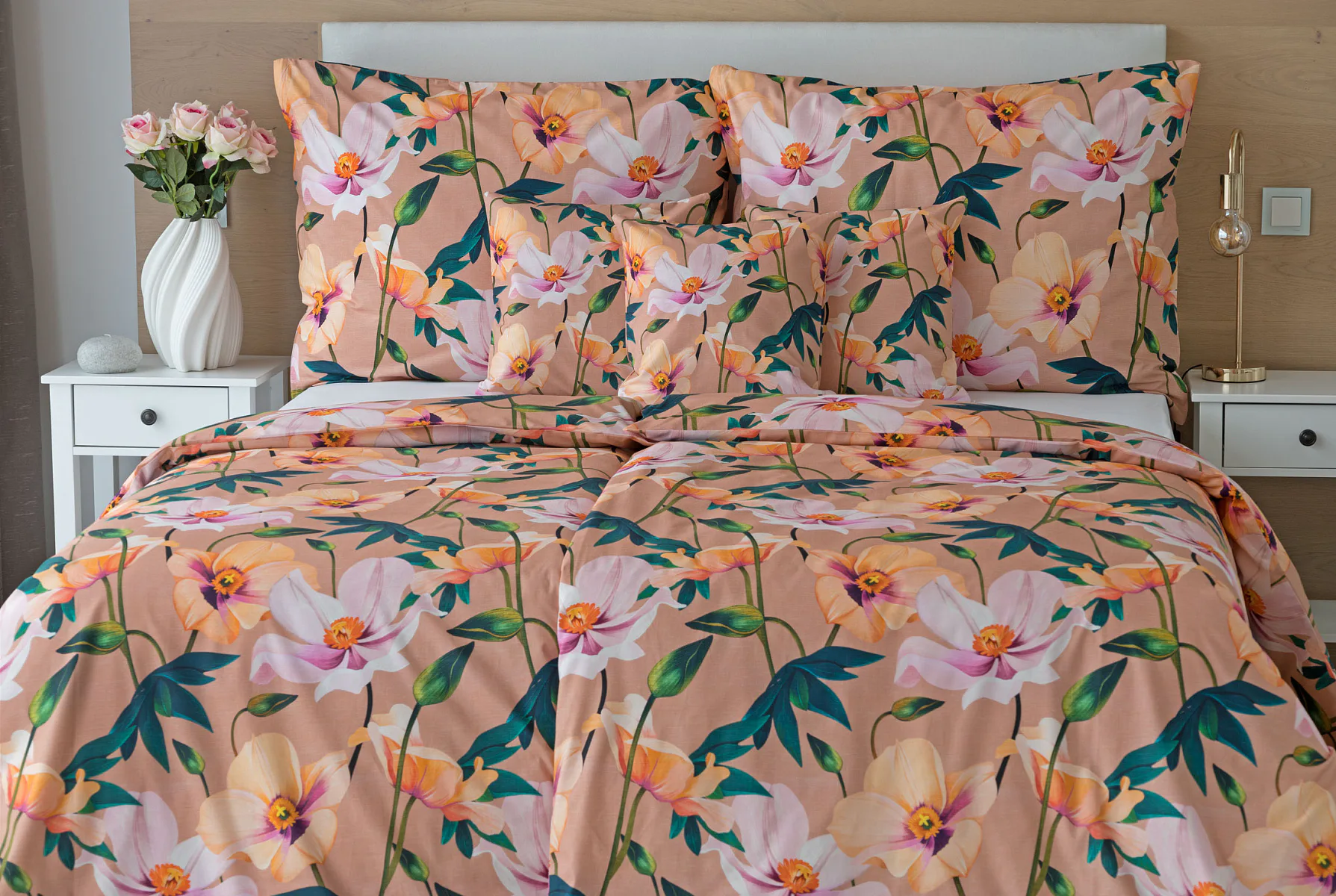 Květinové ložní povlečení Poppy vnese do vaší ložnice nádech svěžesti. Decentní barevná paleta mákových květů v kombinaci s výraznými zelenými listy dodává povlečení atraktivní vzhled, který oživí a zútulní každý interiér. Podkladová barva nese jemné tóny pudrové, meruňkové a korálové, doplněné jemnou tečkovanou strukturou. Dopřejte si každou noc dotek přírody a probouzejte se obklopeni květy.