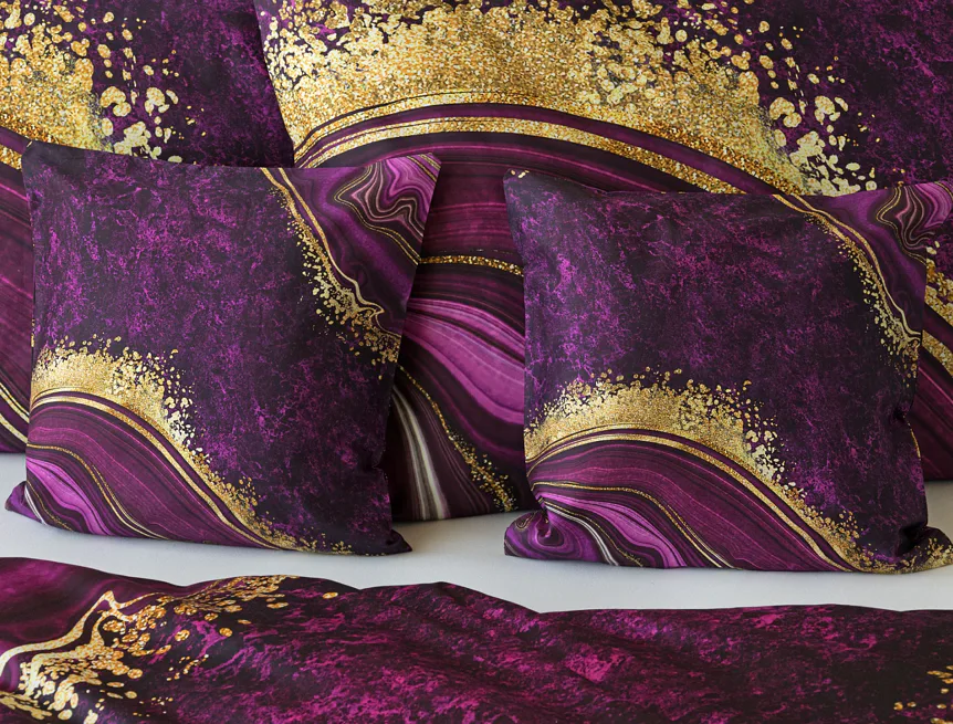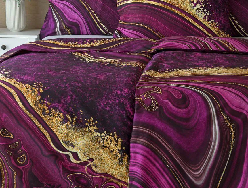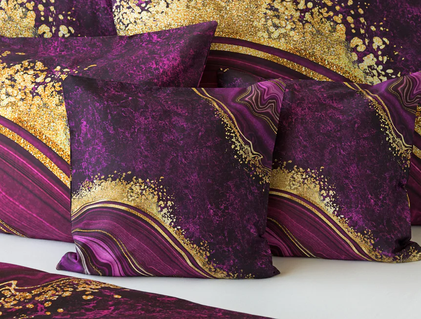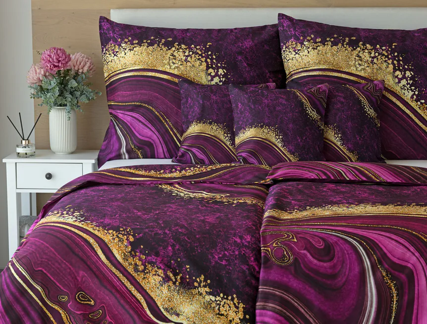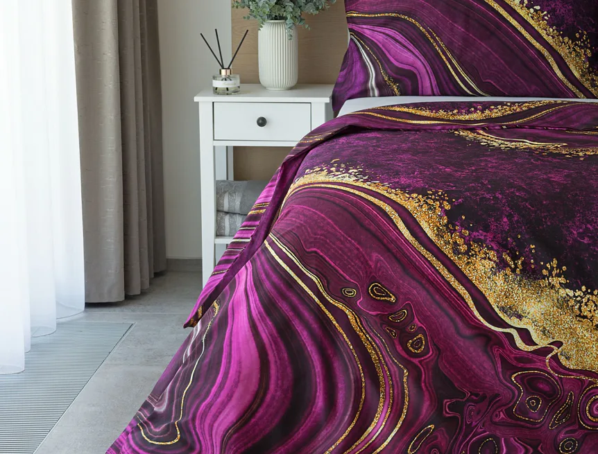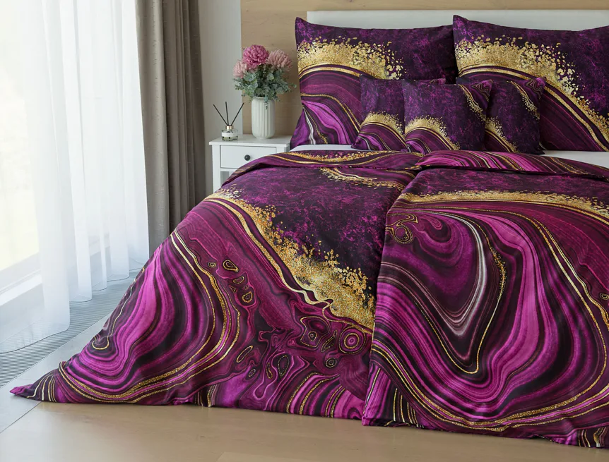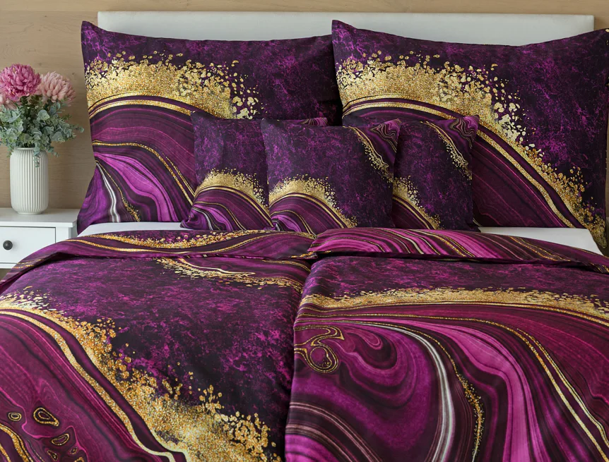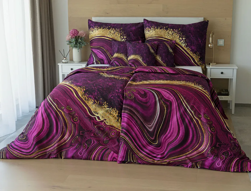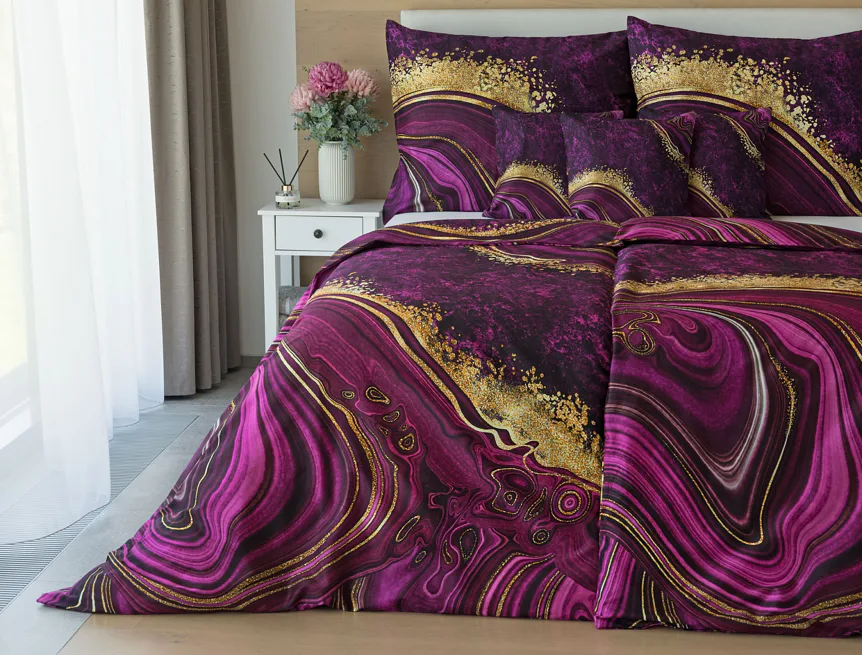 Obměna velmi oblíbeného modrého povlečení Iris, ložní set Ramada, potěší všechny milovníky zářivě růžových tónů. Abstraktnímu vzoru dominují odstíny malinově růžové, fuchsiové a ostře fialové barvy, které v abstraktním vzoru zdobí zlatavé prvky.