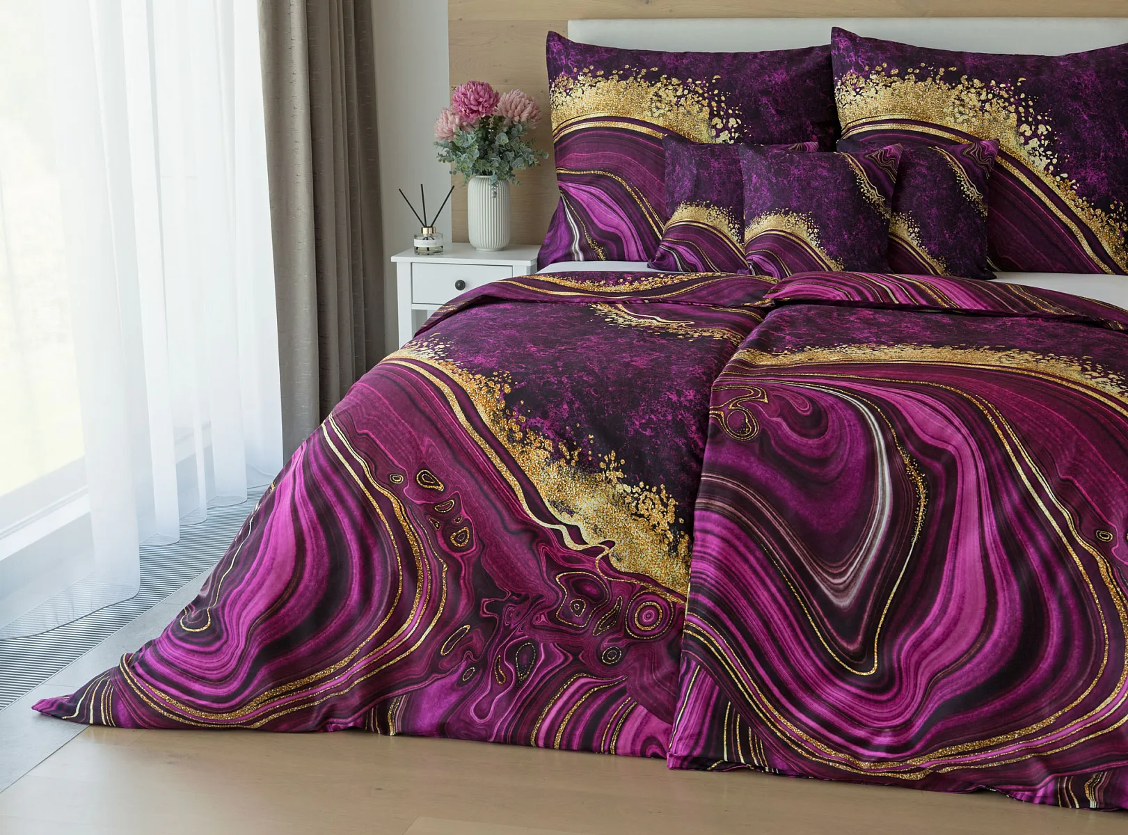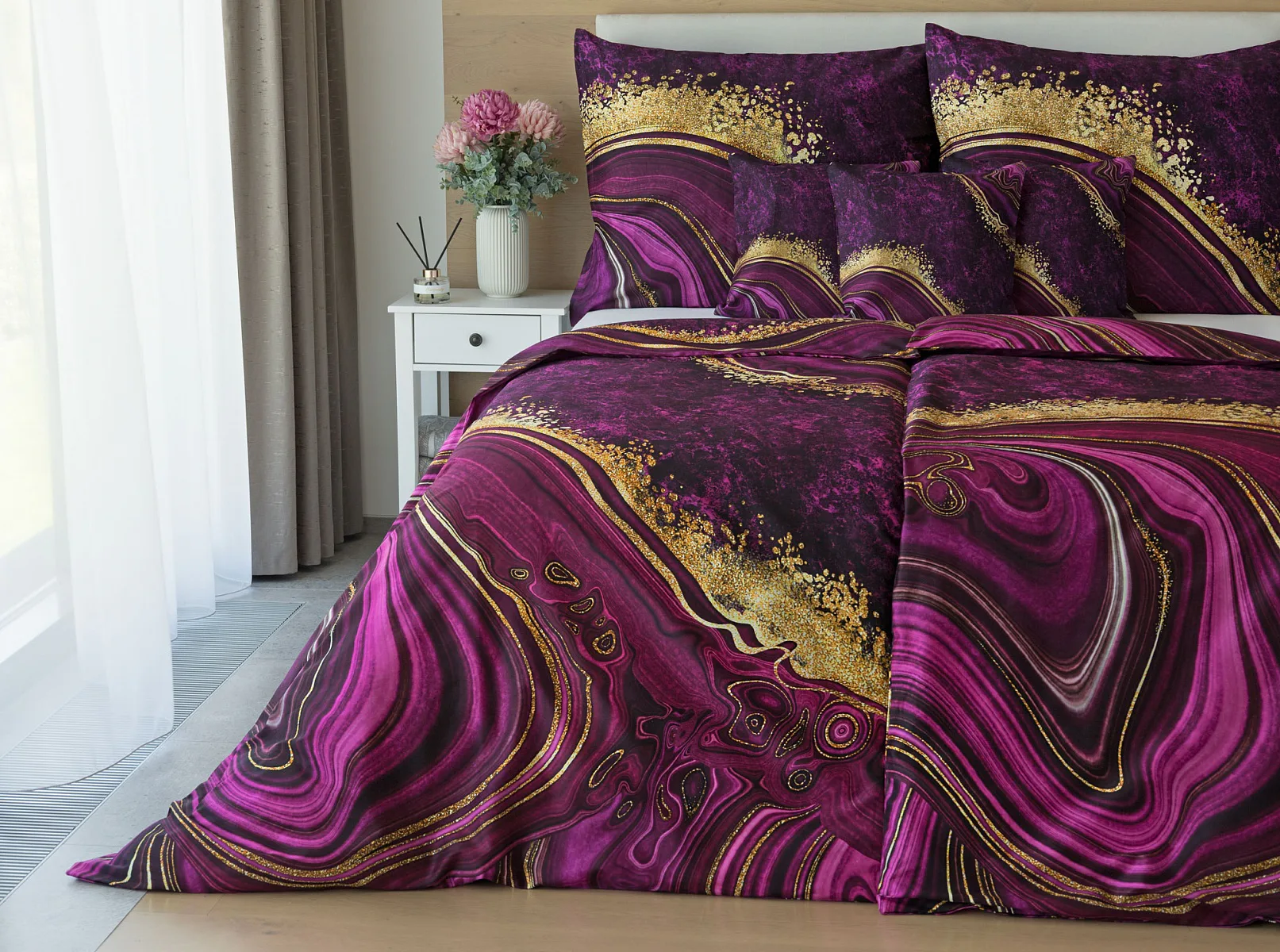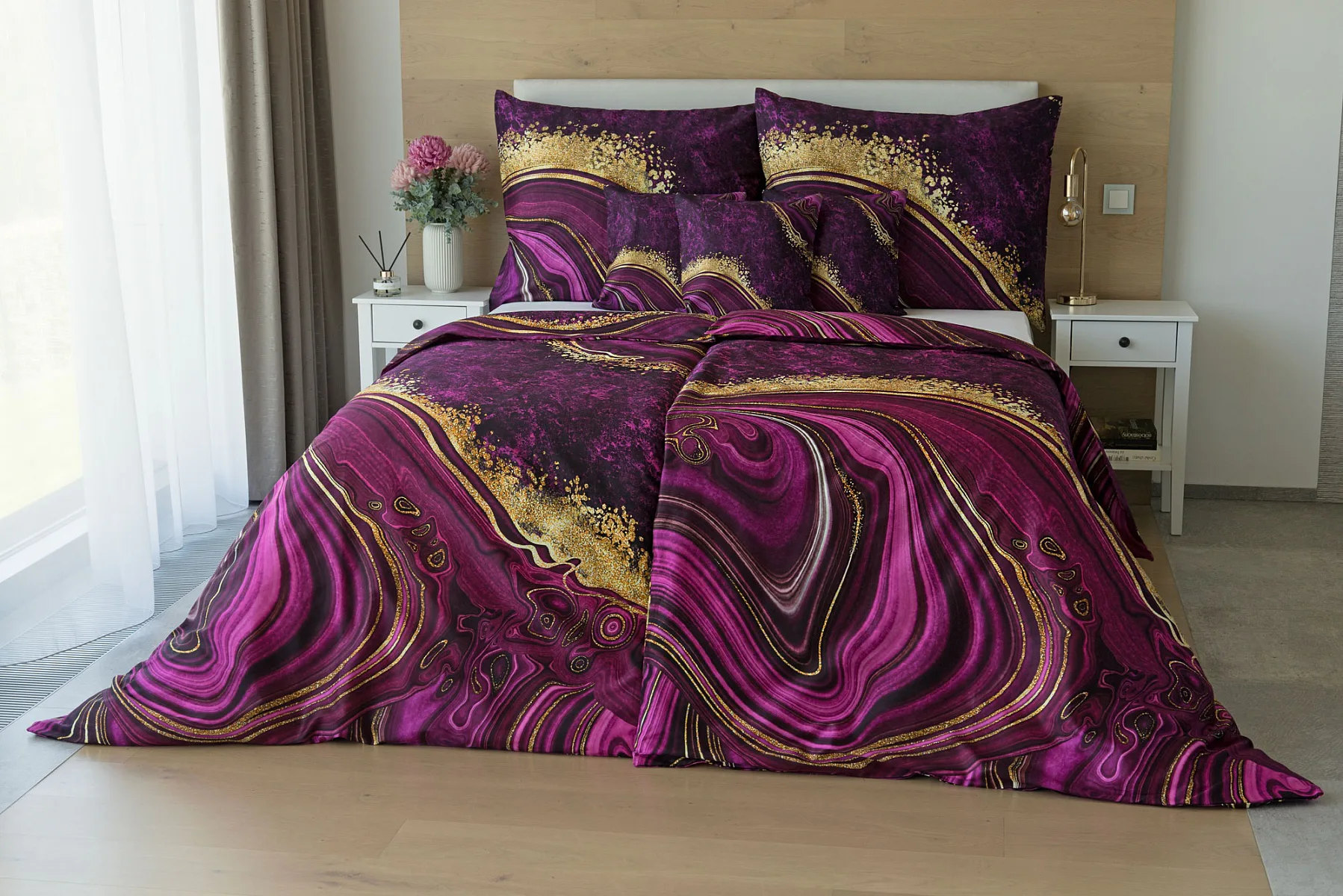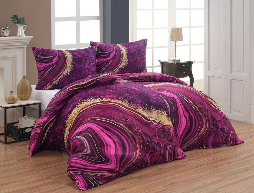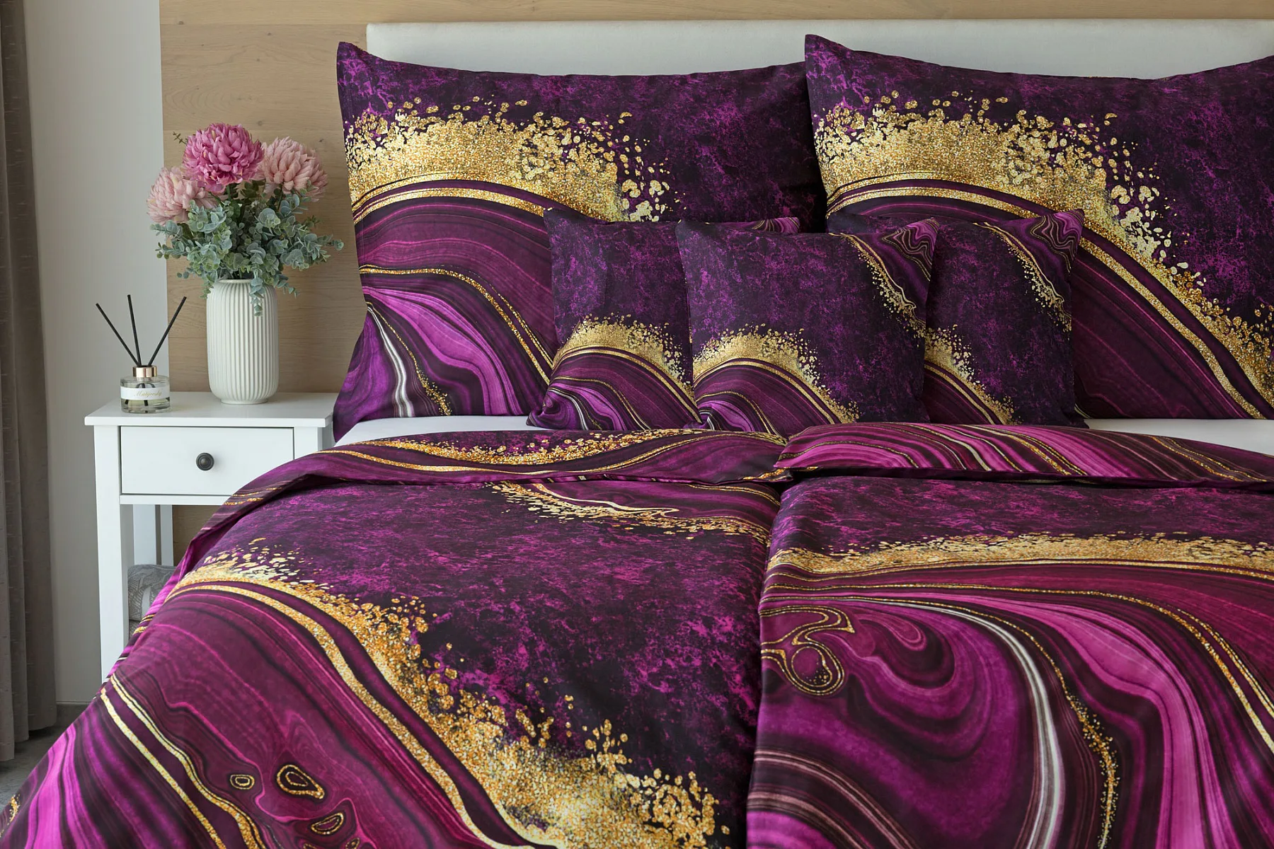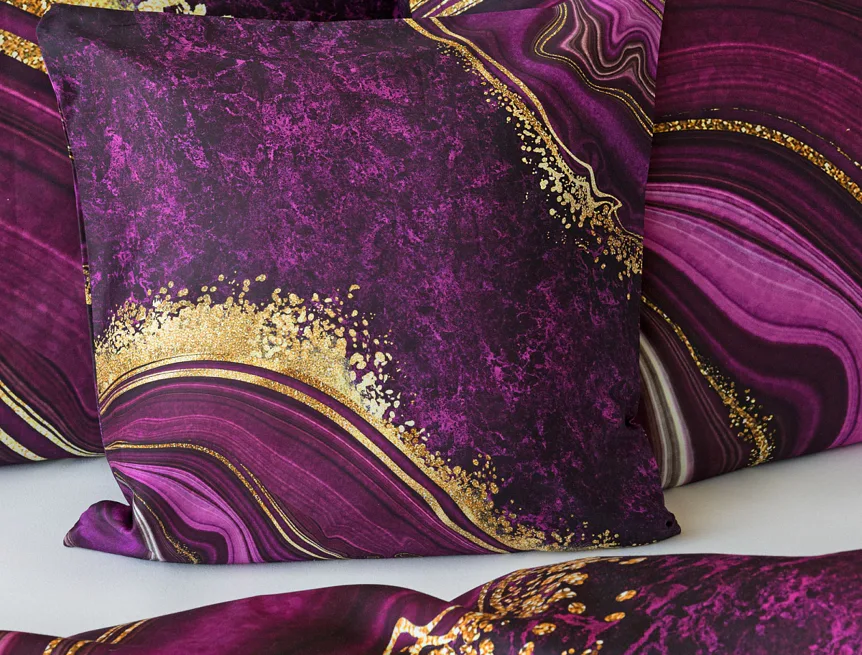 Obměna velmi oblíbeného modrého povlečení Iris, ložní set Ramada, potěší všechny milovníky zářivě růžových tónů. Abstraktnímu vzoru dominují odstíny malinově růžové, fuchsiové a ostře fialové barvy, které v abstraktním vzoru zdobí zlatavé prvky.