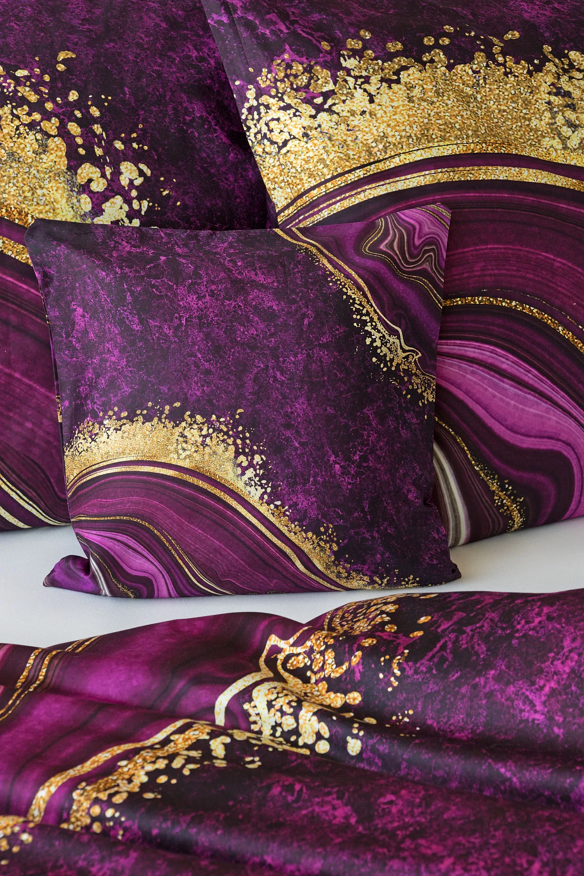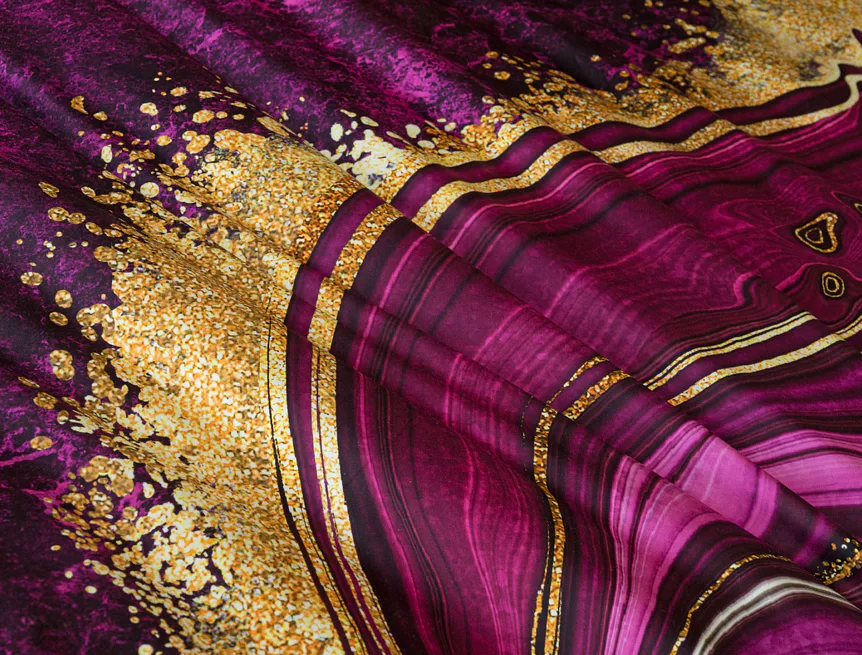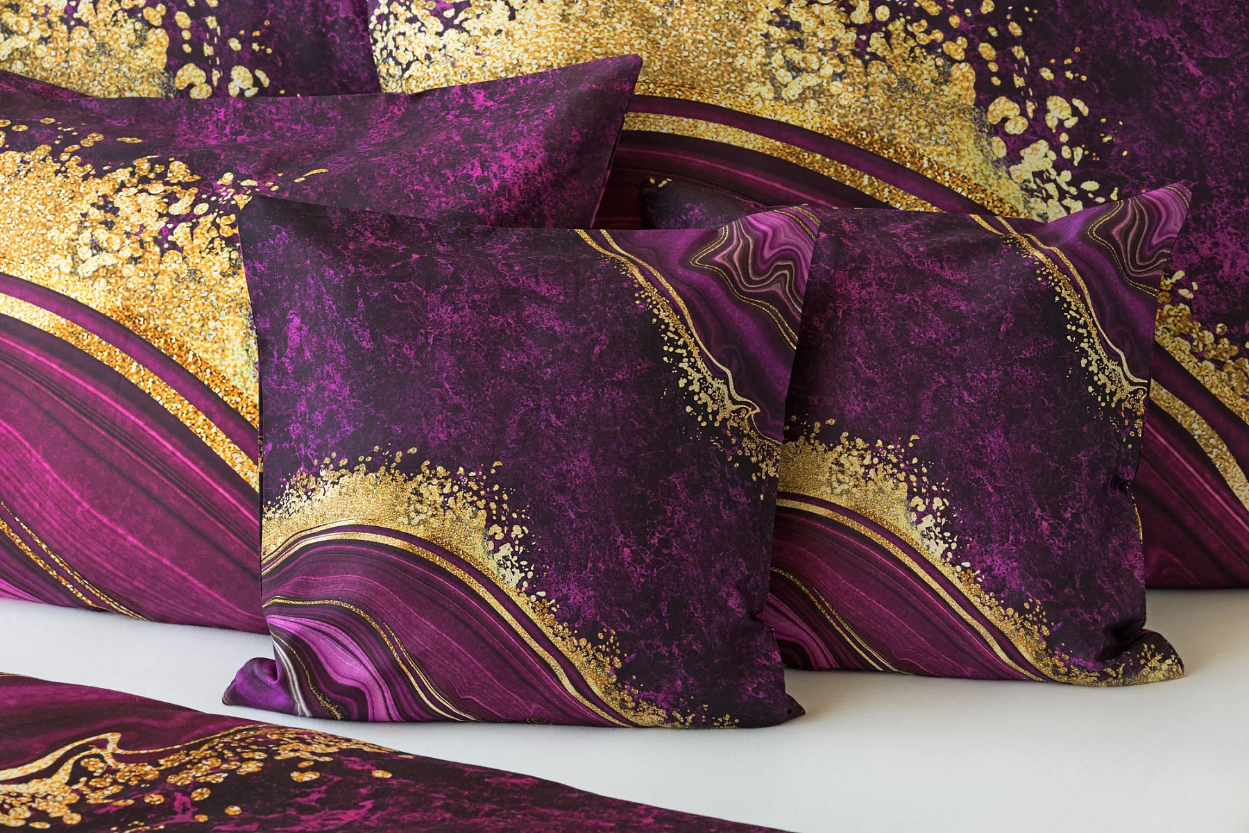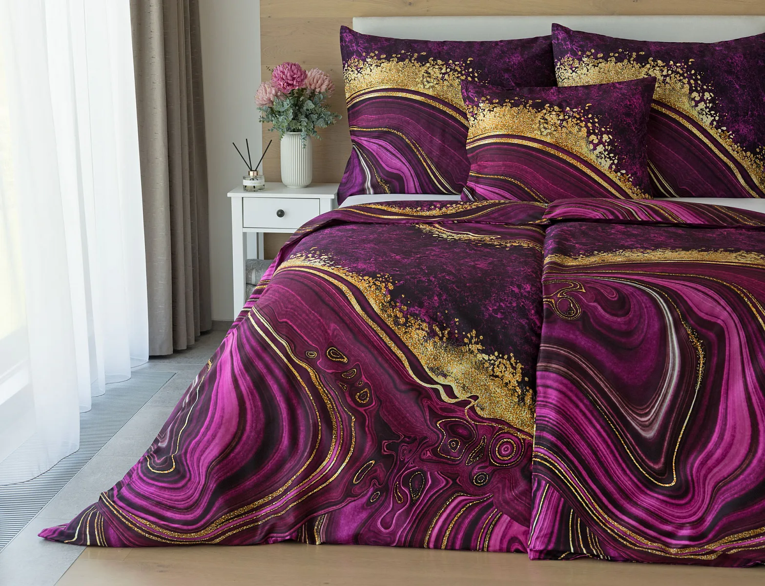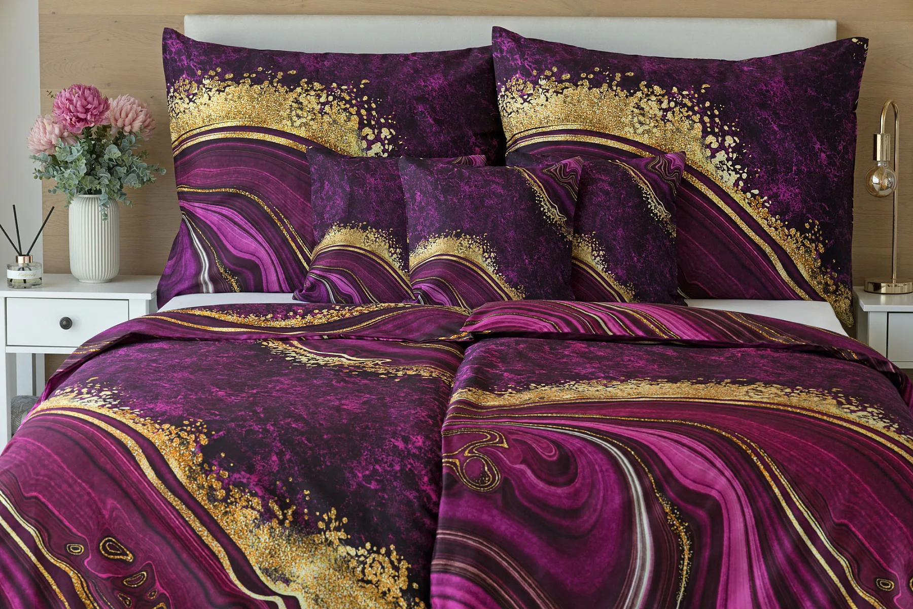 Obměna velmi oblíbeného modrého povlečení Iris, ložní set Ramada, potěší všechny milovníky zářivě růžových tónů. Abstraktnímu vzoru dominují odstíny malinově růžové, fuchsiové a ostře fialové barvy, které v abstraktním vzoru zdobí zlatavé prvky.