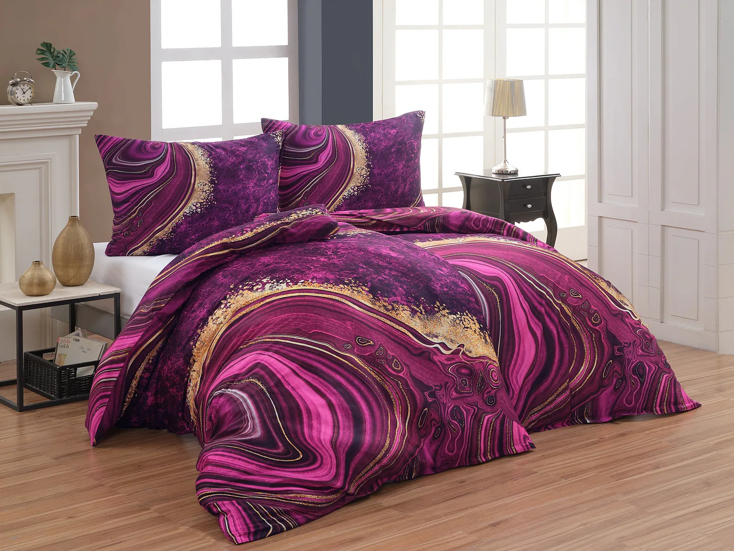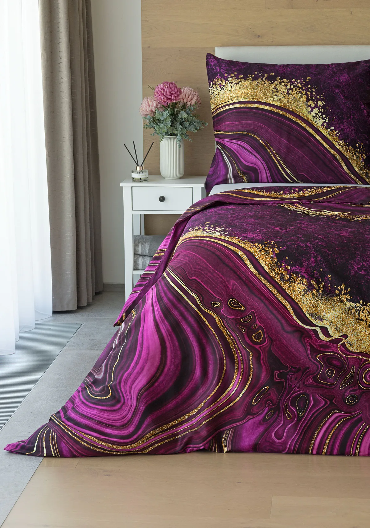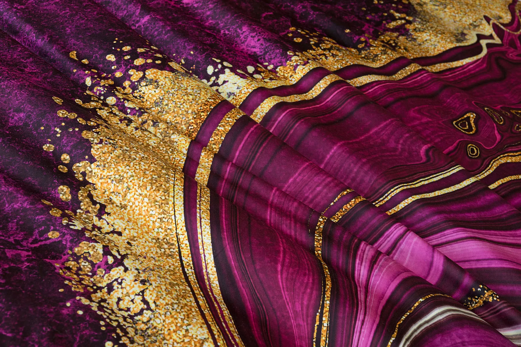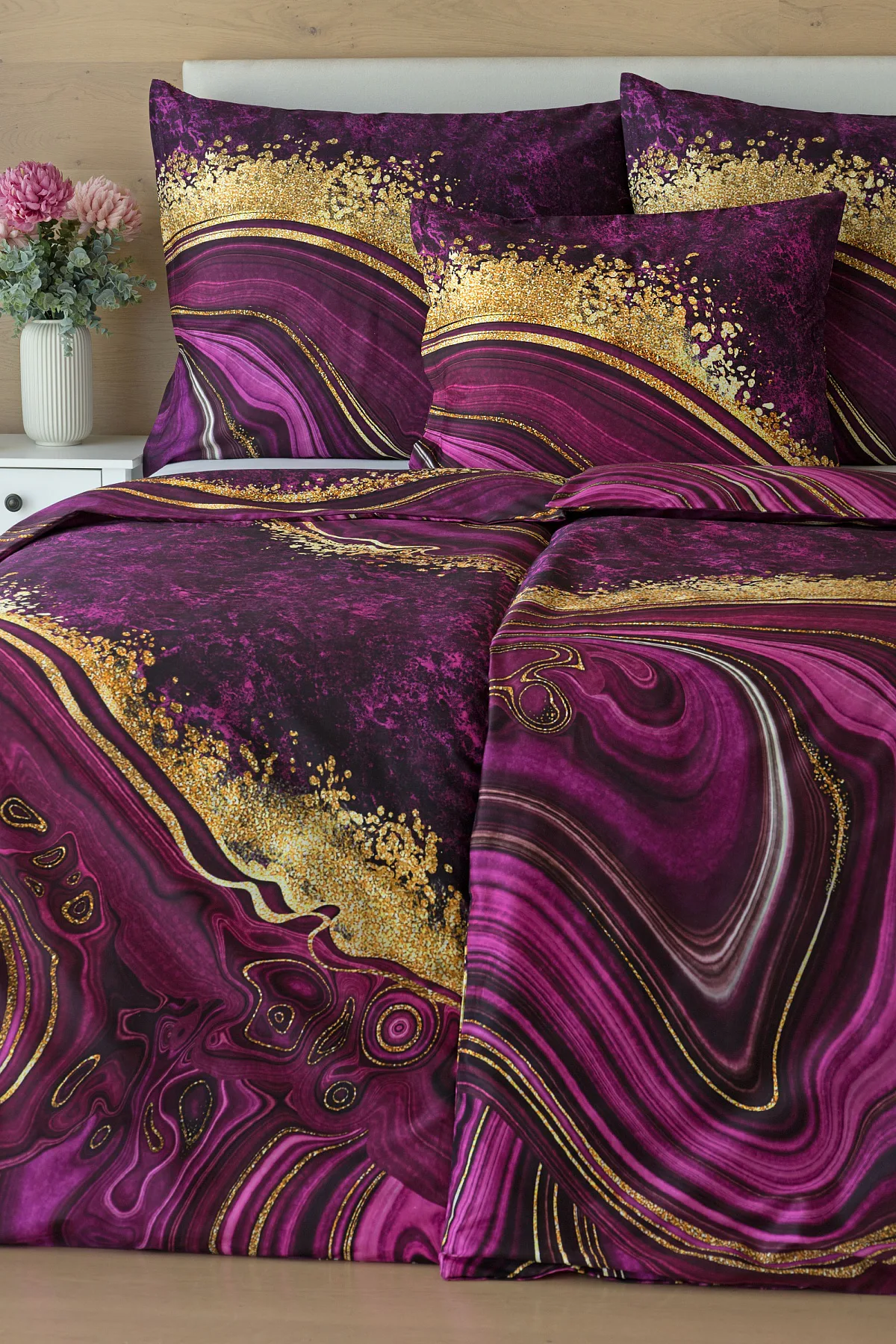 Obměna velmi oblíbeného modrého povlečení Iris, ložní set Ramada, potěší všechny milovníky zářivě růžových tónů. Abstraktnímu vzoru dominují odstíny malinově růžové, fuchsiové a ostře fialové barvy, které v abstraktním vzoru zdobí zlatavé prvky.