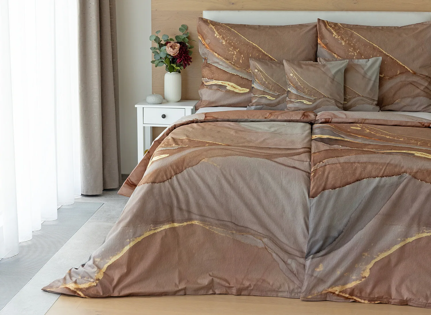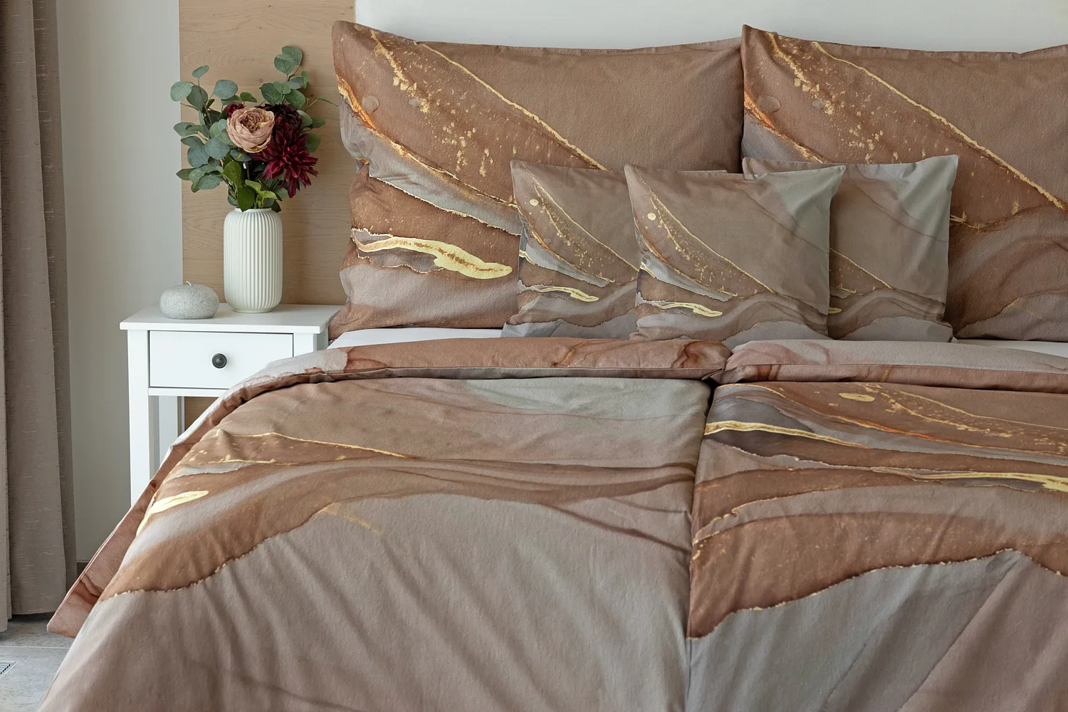 Bavlněné povlečení Riana vnese do vaší ložnice jedinečný styl a eleganci. Abstraktní vzor kombinuje paletu hnědých a šedohnědých tónů protnutých zlatavou linkou. Povlečení je vyrobeno ze 100% prvotřídní bavlny a přináší nejen estetickou hodnotu, ale i výjimečný komfort.