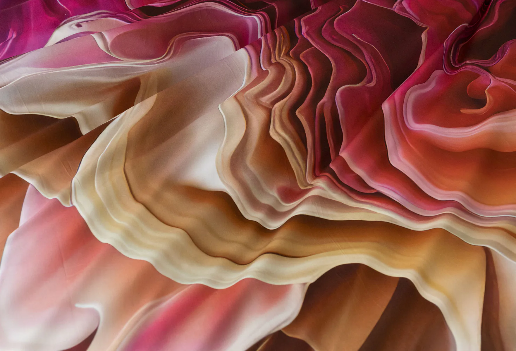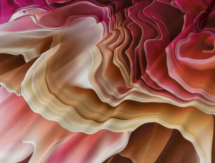 Celá paleta růžových tónů dominuje tomuto autorskému digitálně zpracovanému motivu. Romantickou kompozici doplňují odstíny béžové a meruňkové barvy. Nejmodernější digitální tisk zajišťuje