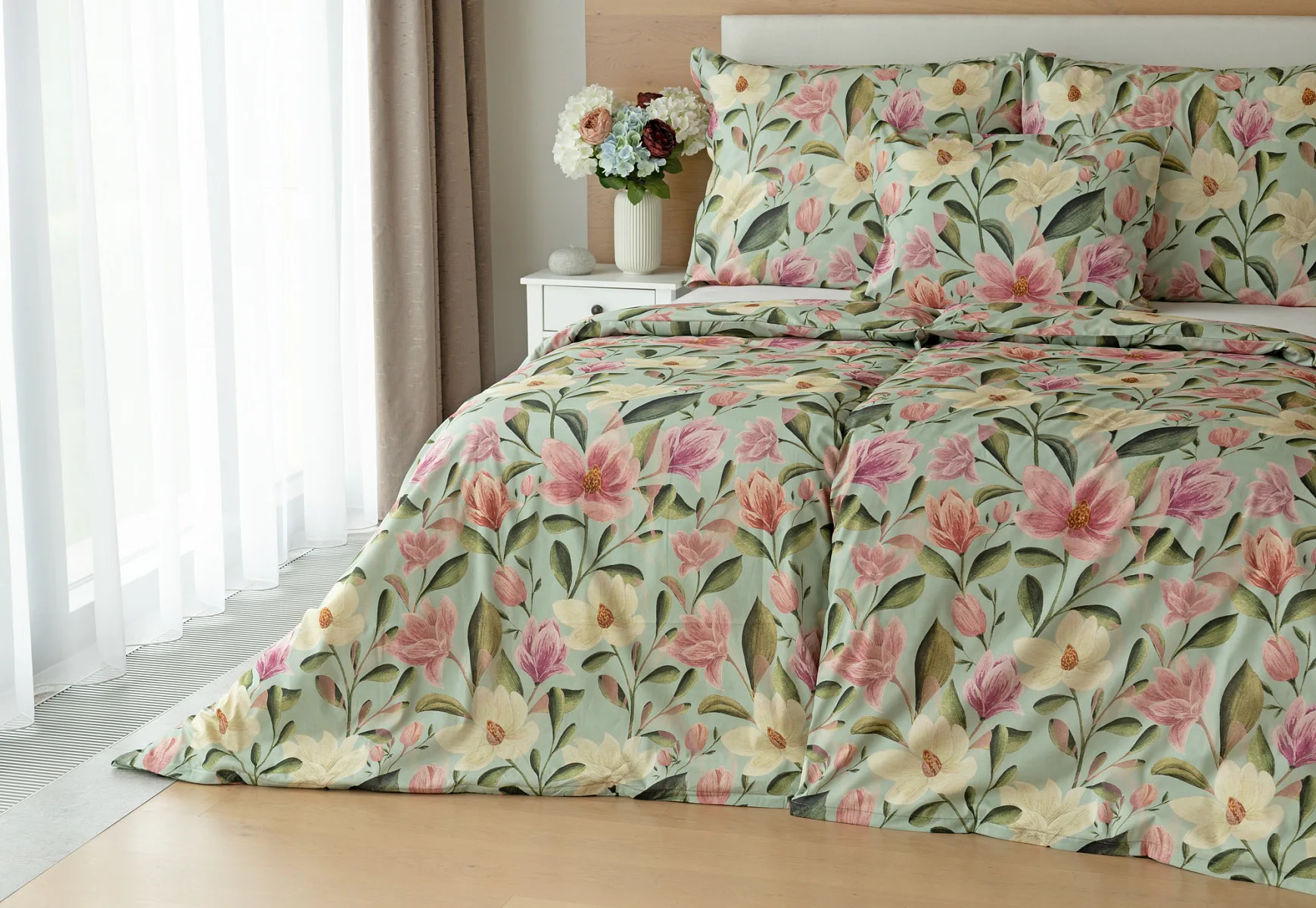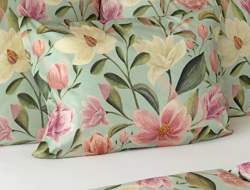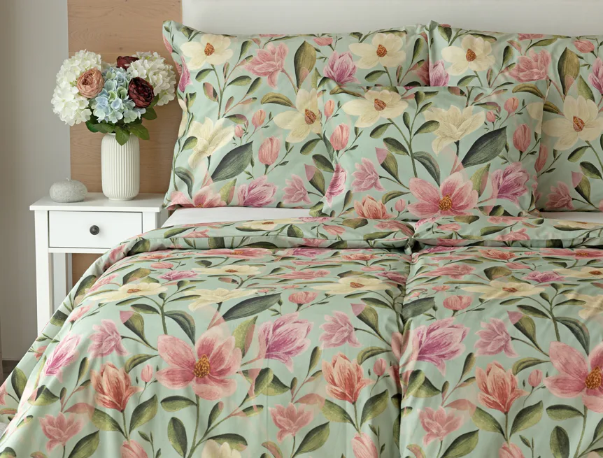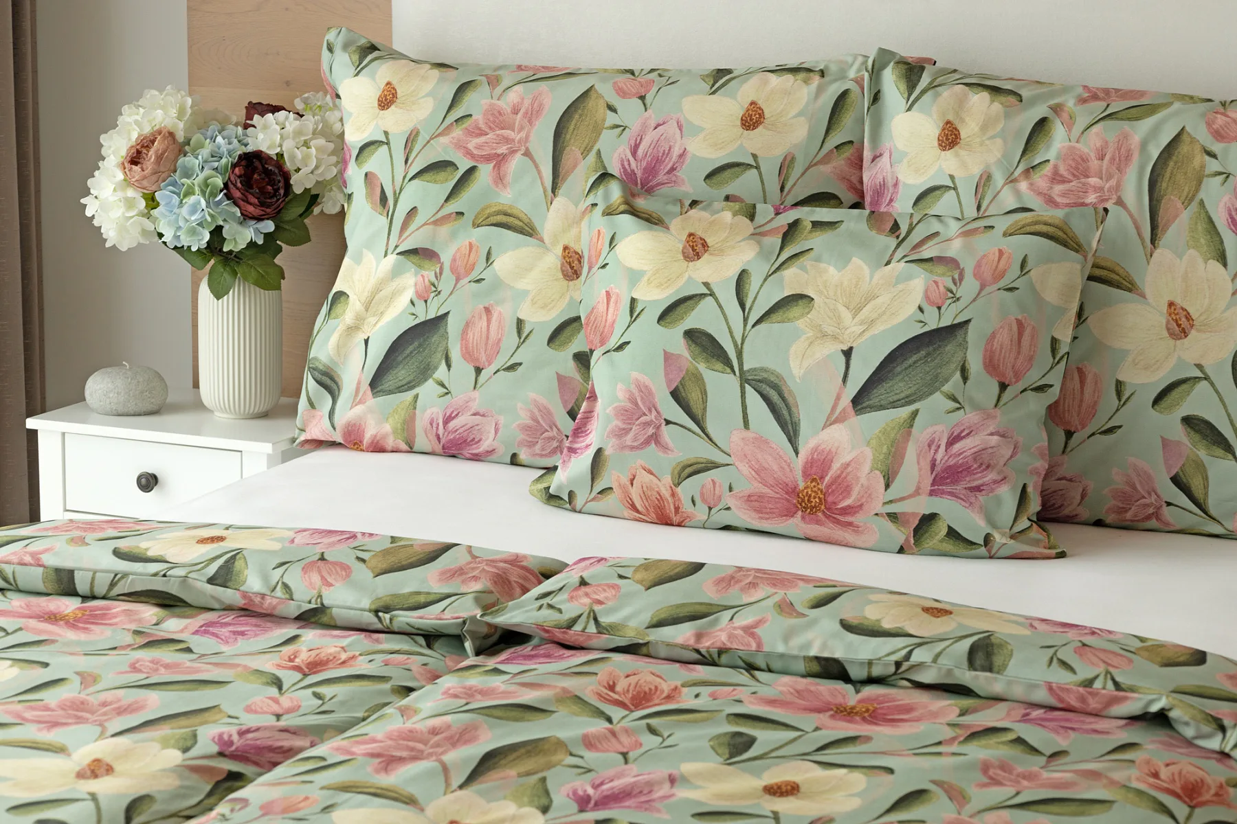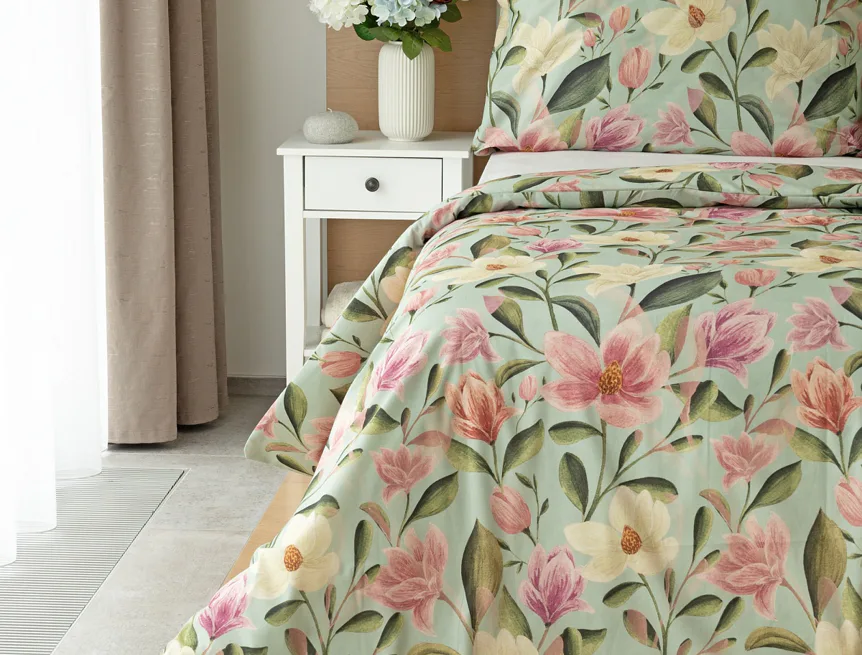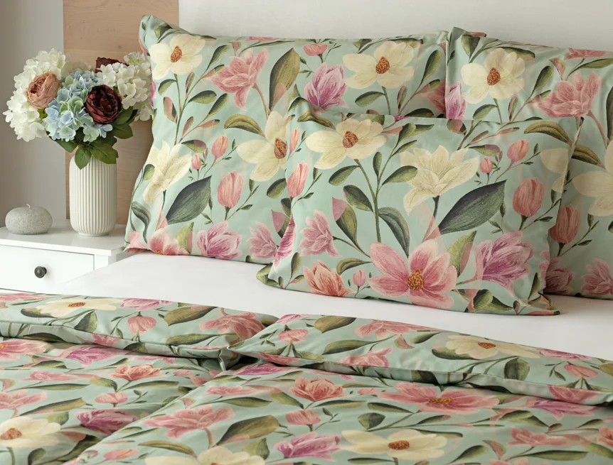 Bavlněné ložní povlečení Silestin vás okouzlí svěží kombinací barev. Mentolově zelený podklad dává vyniknout výrazným květům v paletě béžových a růžových tónů. Atraktivní florální motiv podtrhují stonkové listy v temně zelené barvě.
