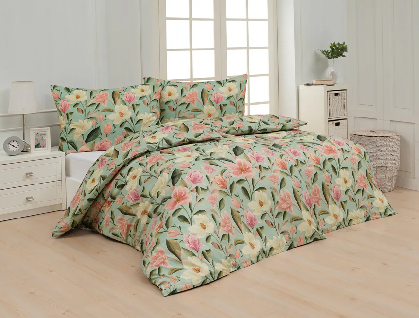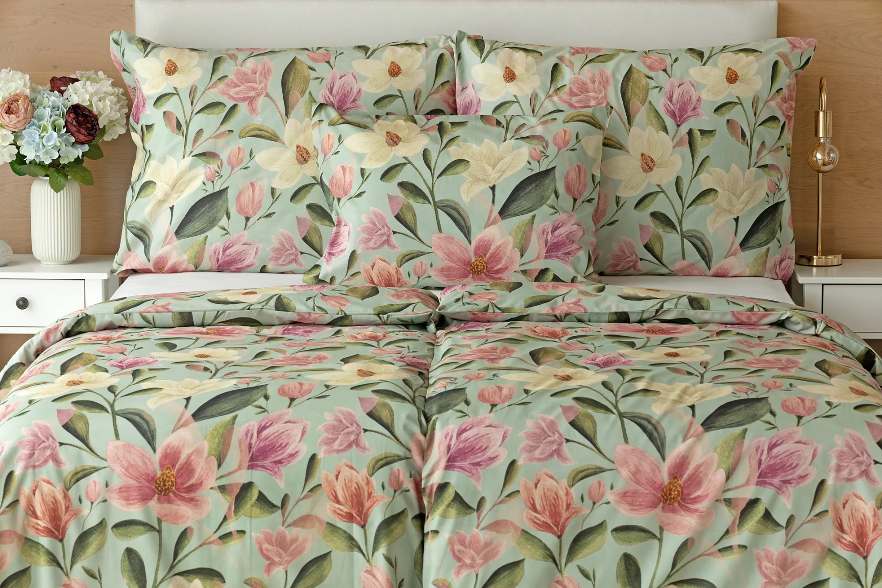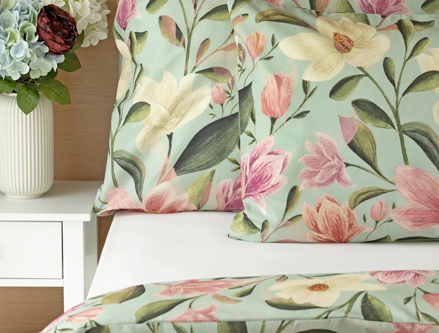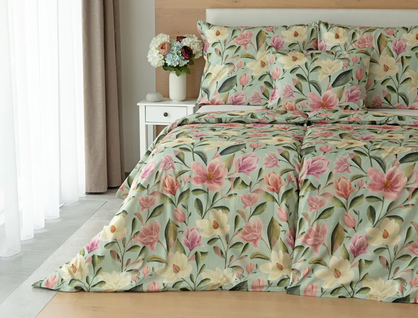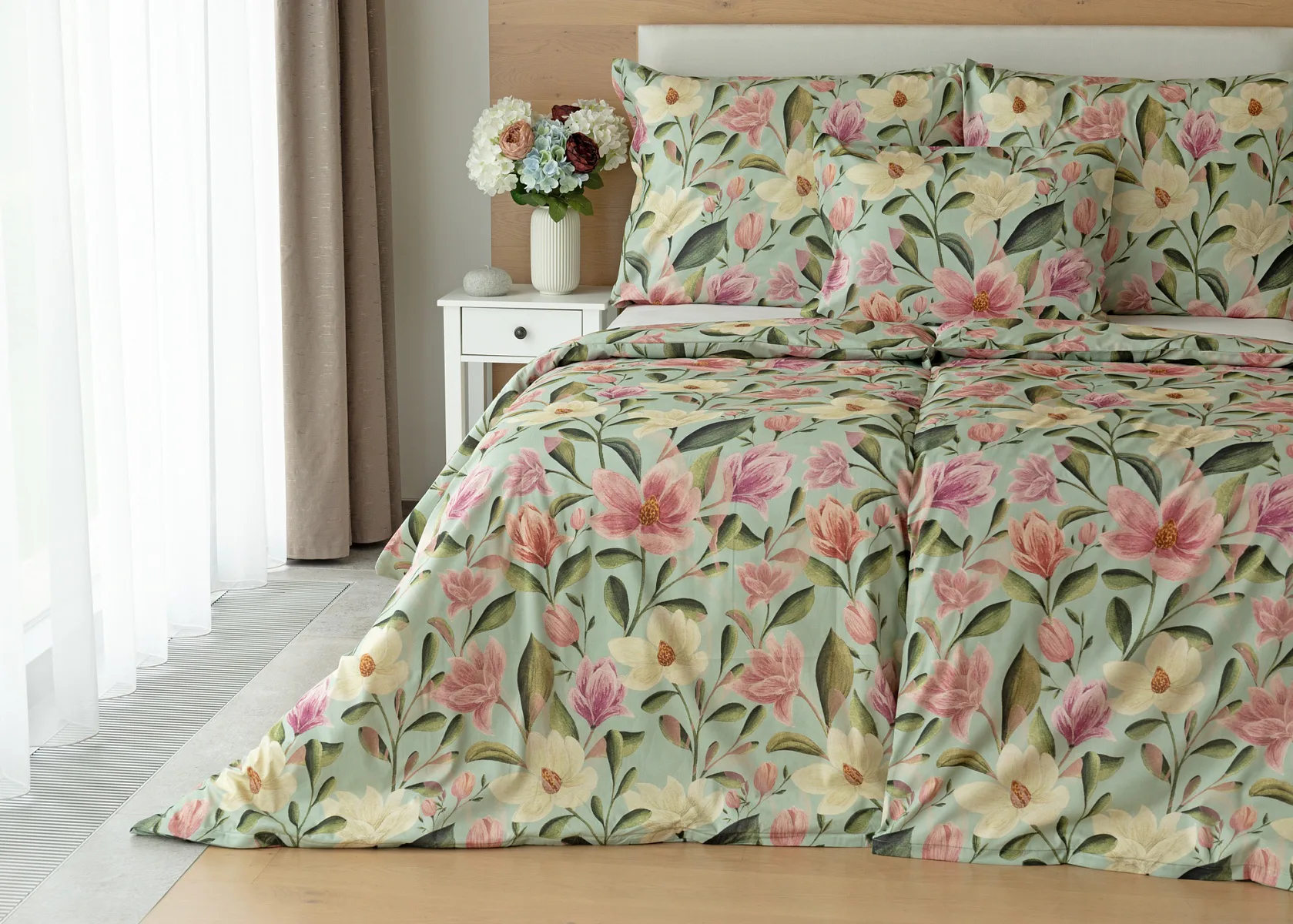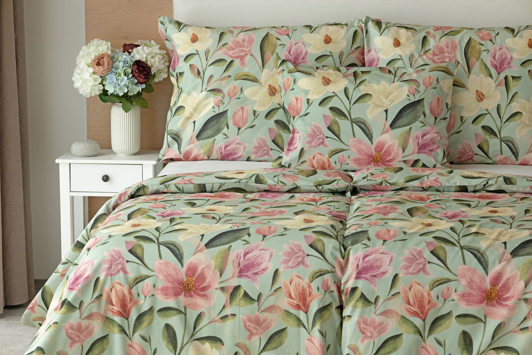 Bavlněné ložní povlečení Silestin vás okouzlí svěží kombinací barev. Mentolově zelený podklad dává vyniknout výrazným květům v paletě béžových a růžových tónů. Atraktivní florální motiv podtrhují stonkové listy v temně zelené barvě.