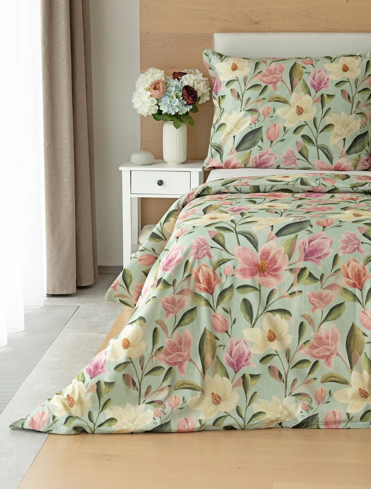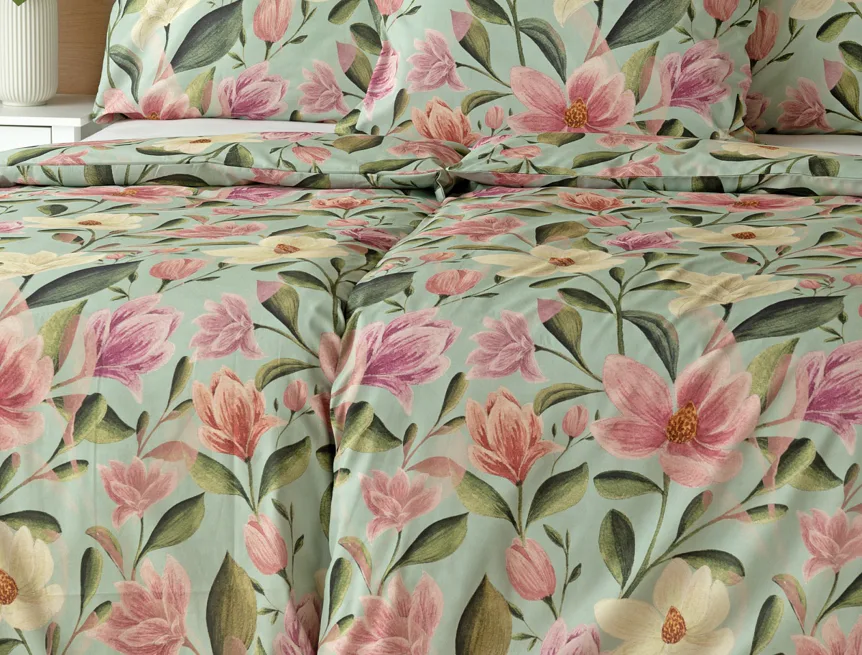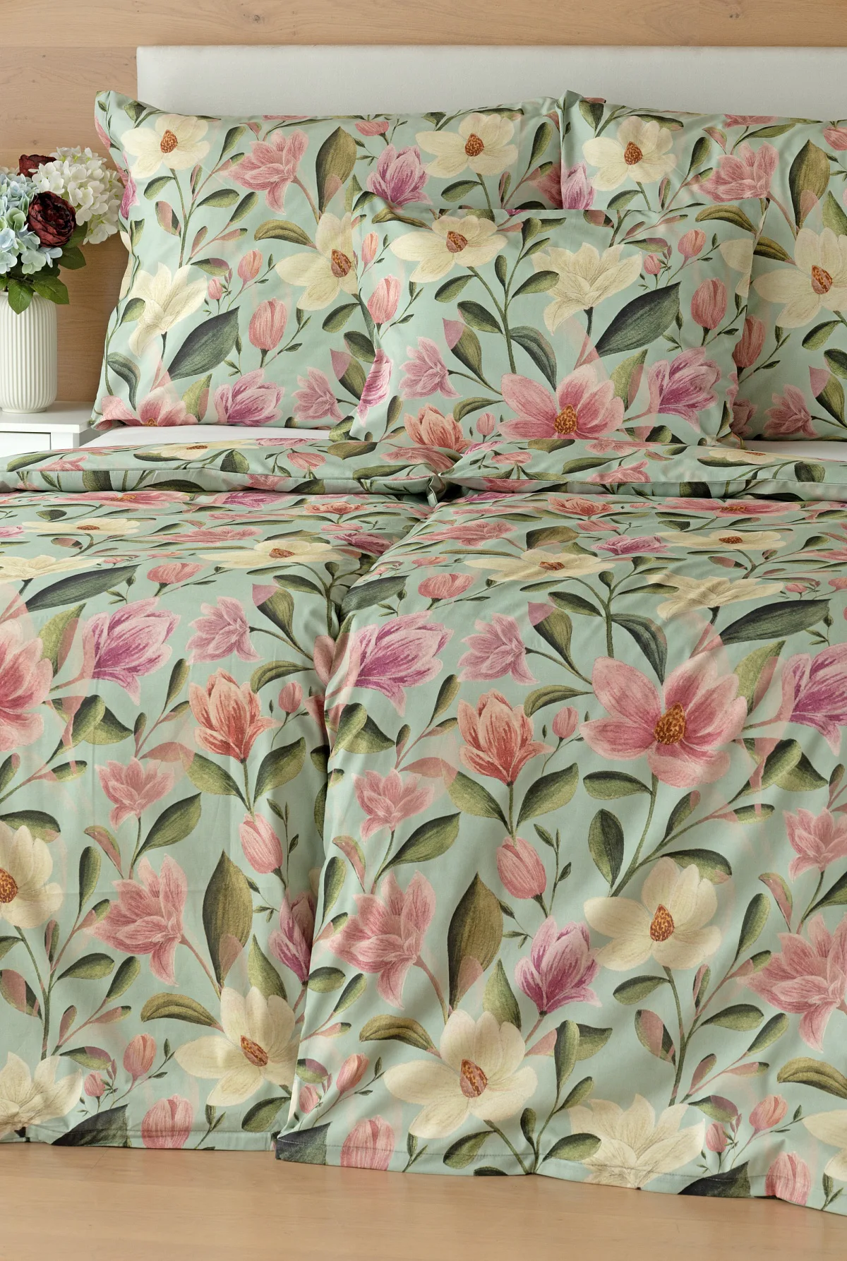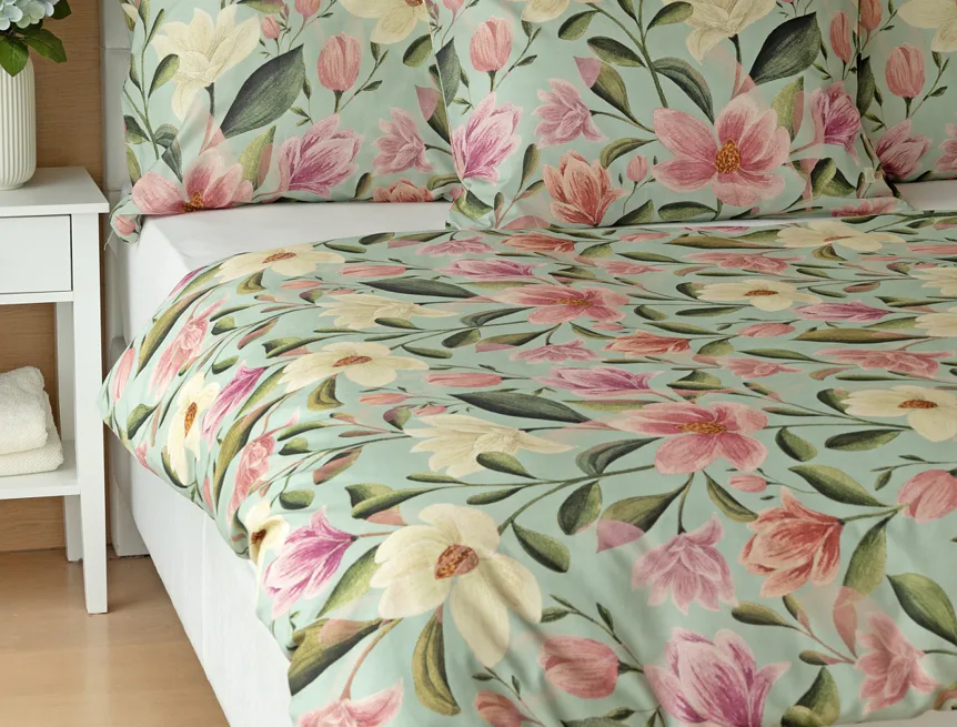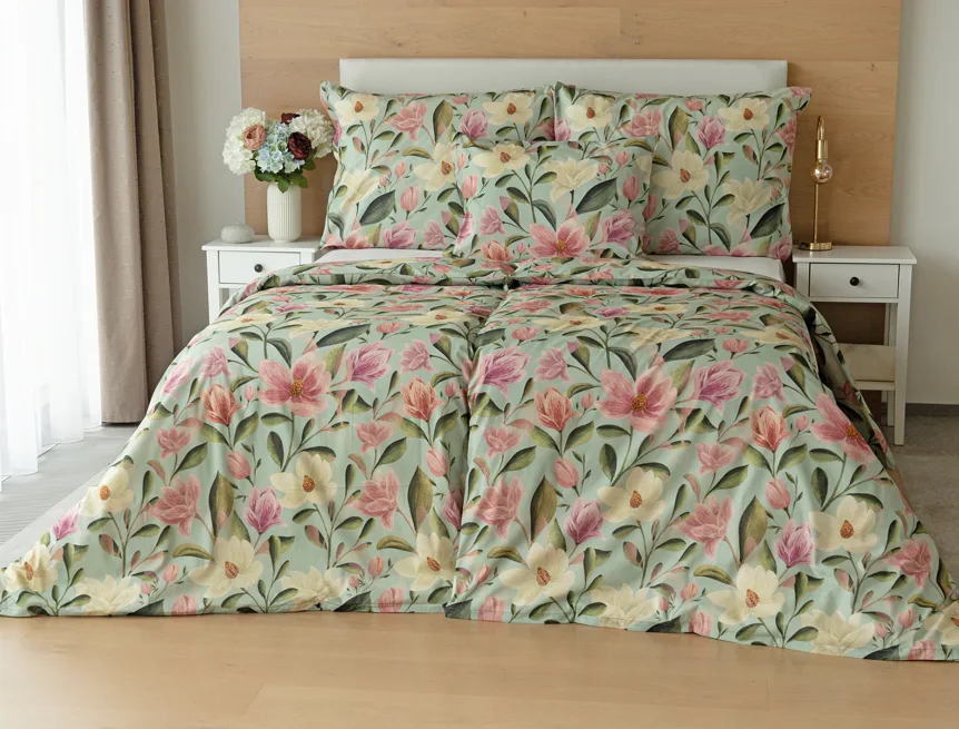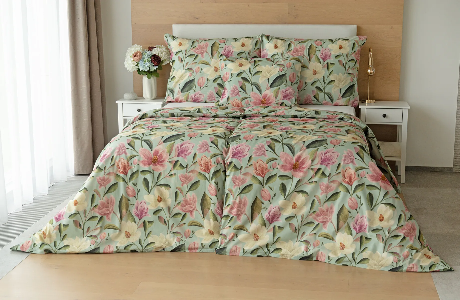 Bavlněné ložní povlečení Silestin vás okouzlí svěží kombinací barev. Mentolově zelený podklad dává vyniknout výrazným květům v paletě béžových a růžových tónů. Atraktivní florální motiv podtrhují stonkové listy v temně zelené barvě.