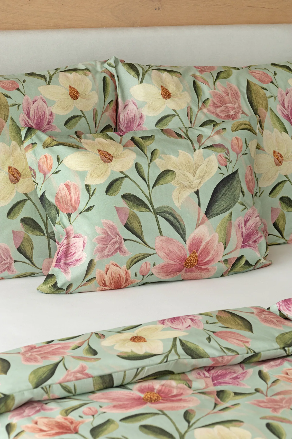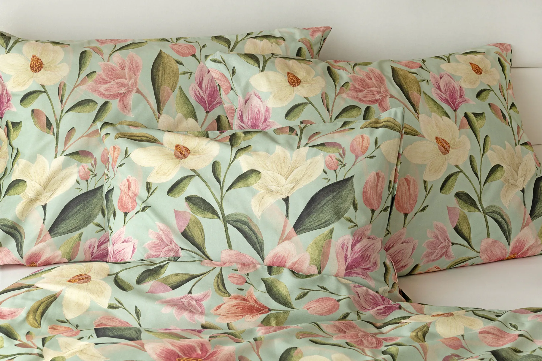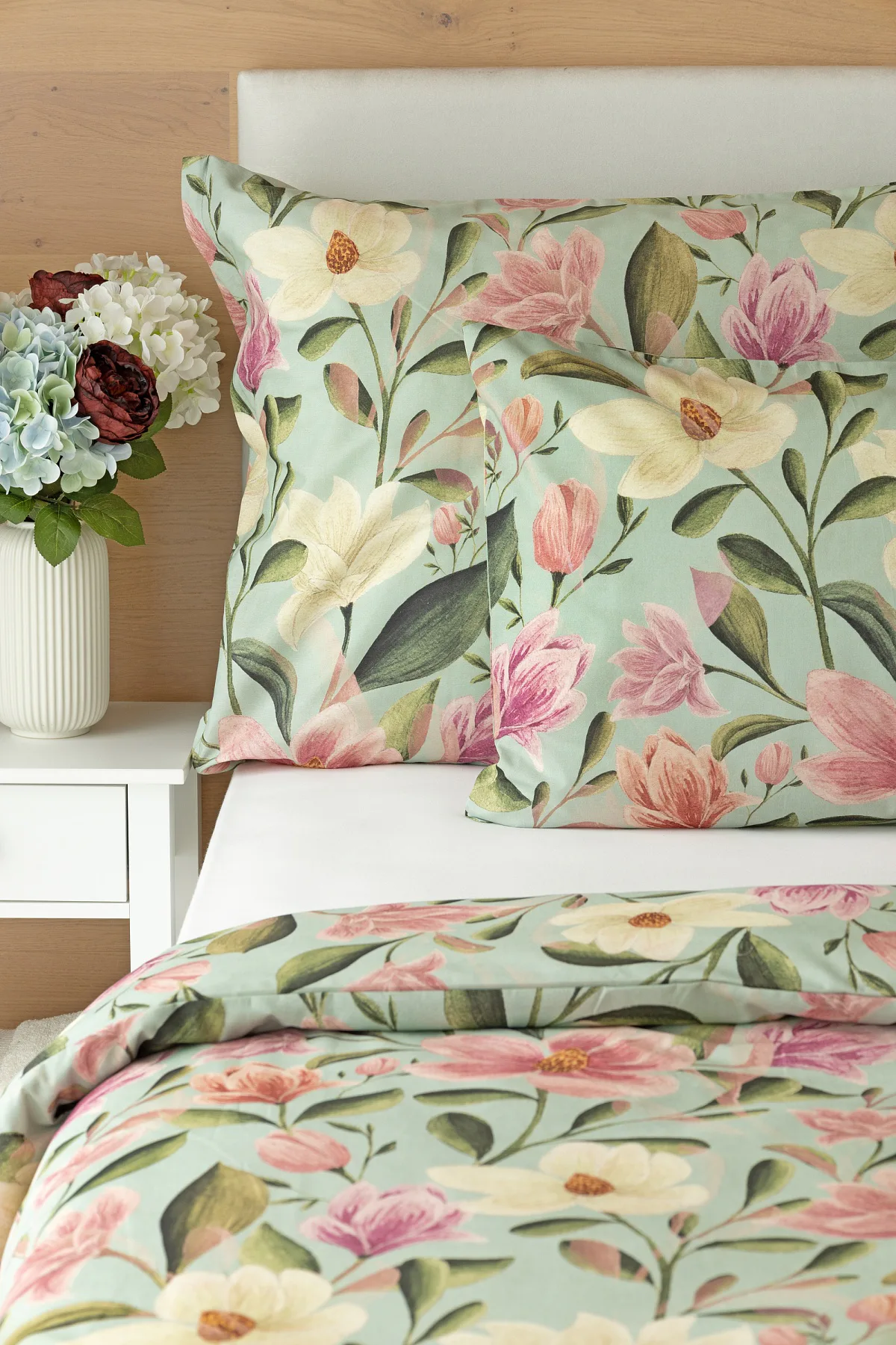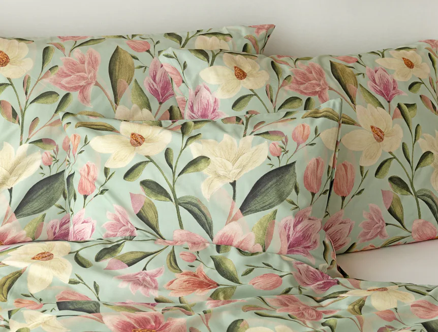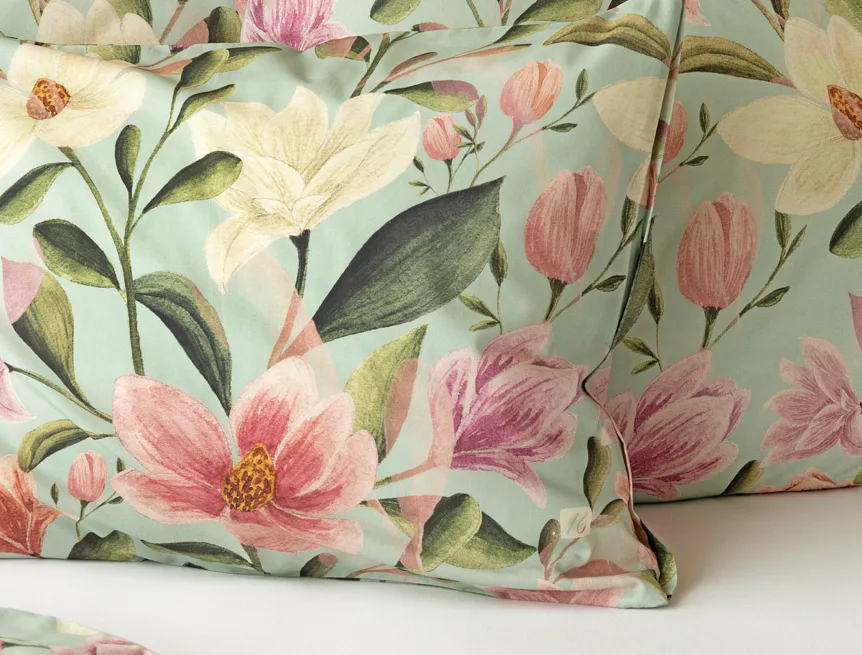 Bavlněné ložní povlečení Silestin vás okouzlí svěží kombinací barev. Mentolově zelený podklad dává vyniknout výrazným květům v paletě béžových a růžových tónů. Atraktivní florální motiv podtrhují stonkové listy v temně zelené barvě.