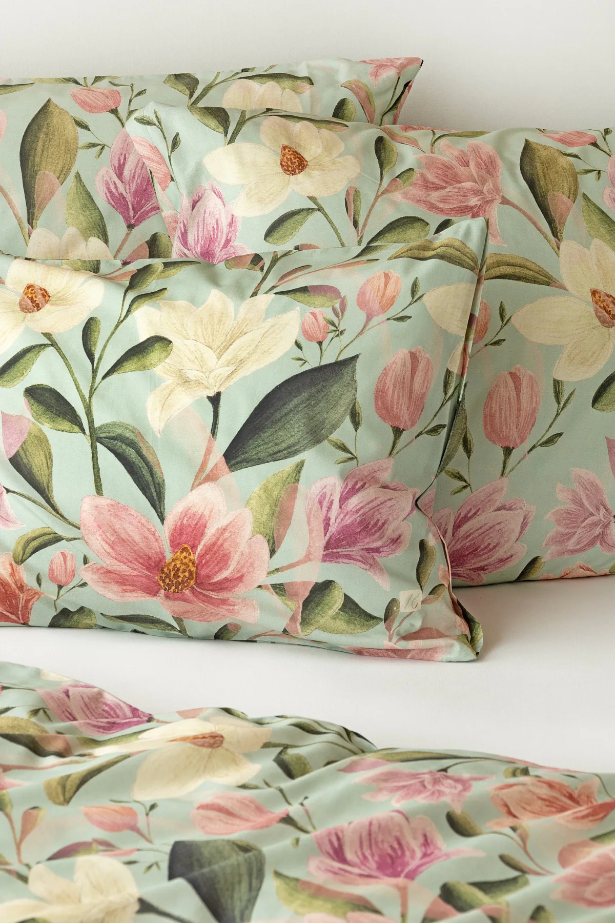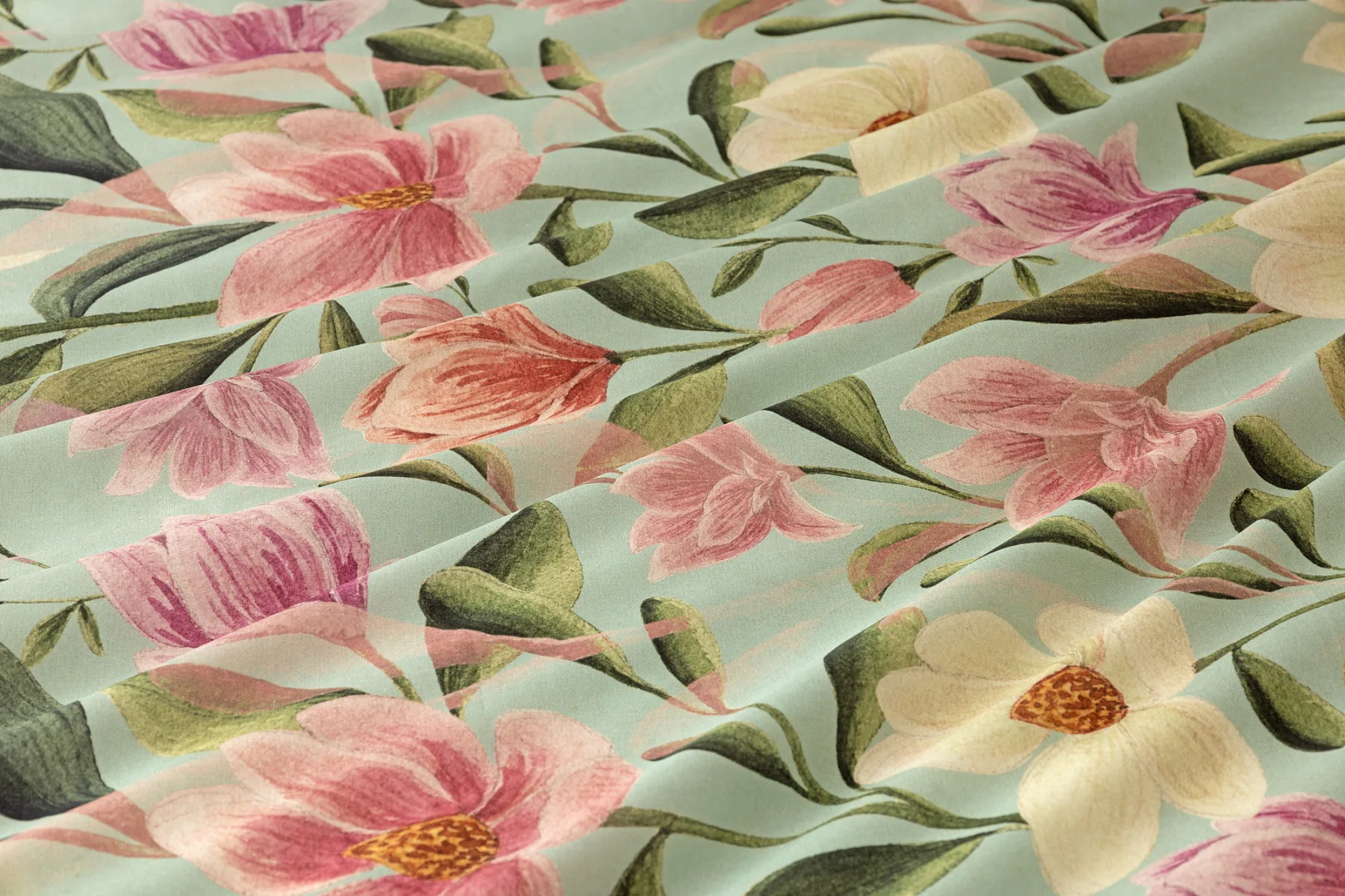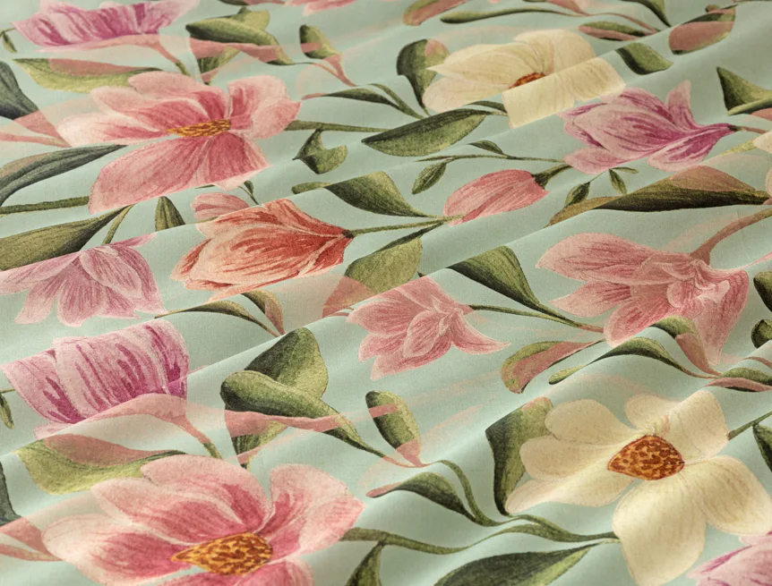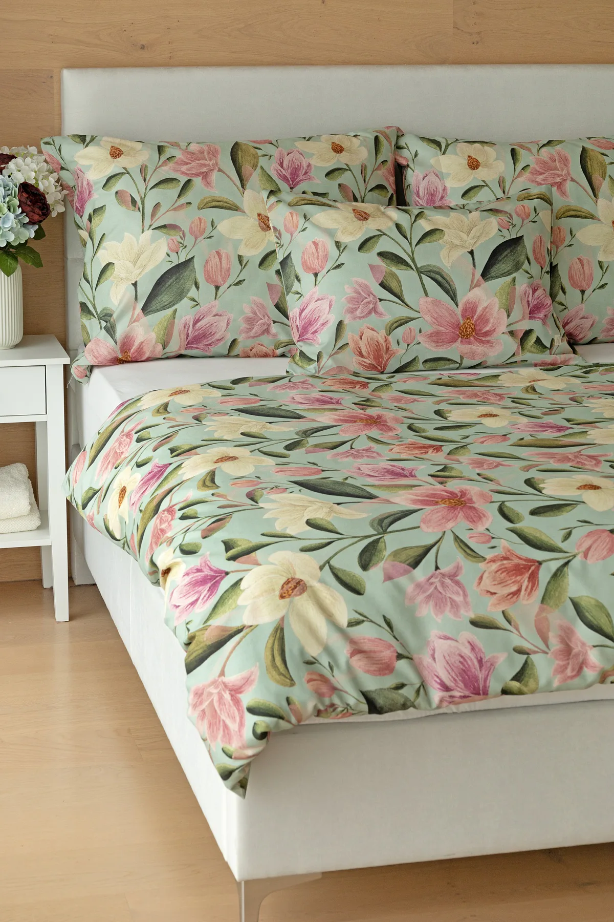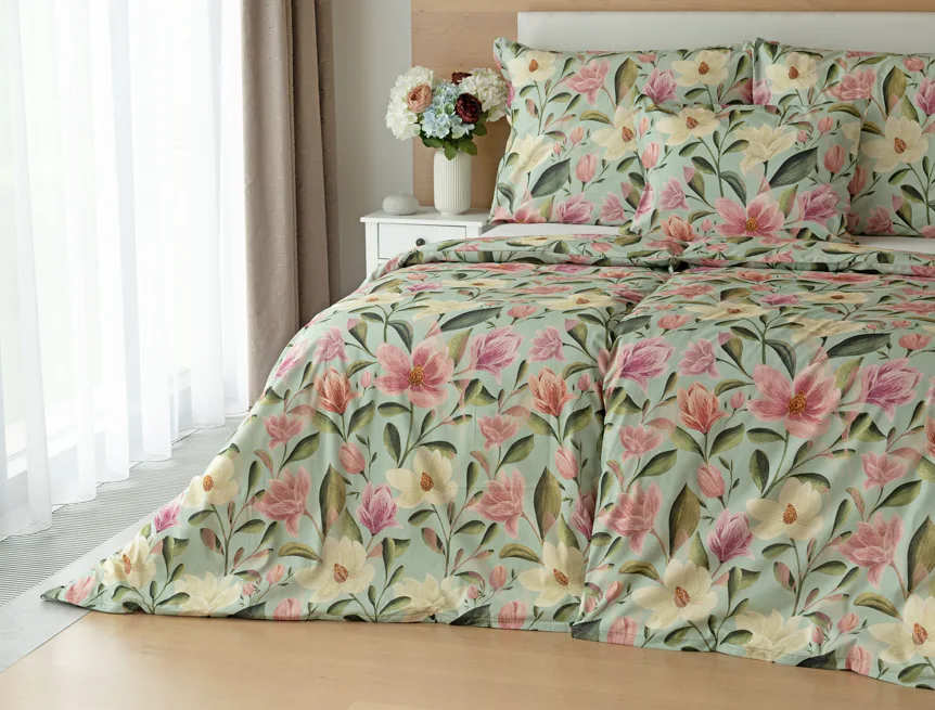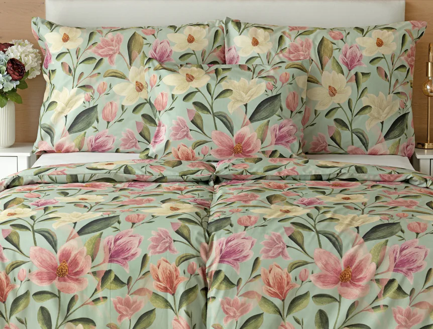 Bavlněné ložní povlečení Silestin vás okouzlí svěží kombinací barev. Mentolově zelený podklad dává vyniknout výrazným květům v paletě béžových a růžových tónů. Atraktivní florální motiv podtrhují stonkové listy v temně zelené barvě.