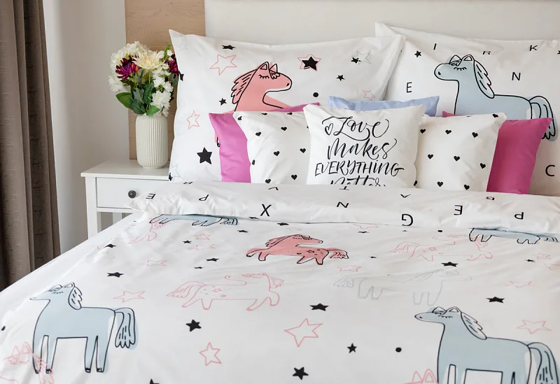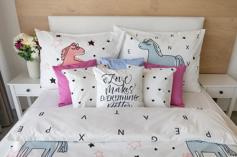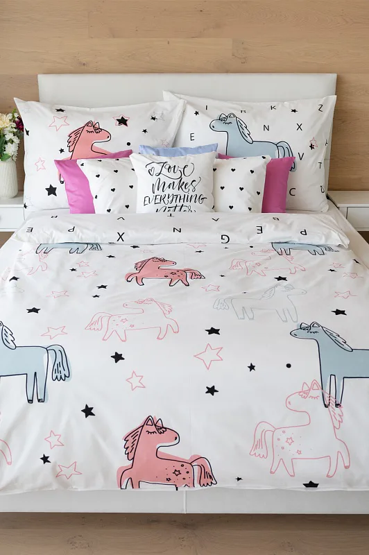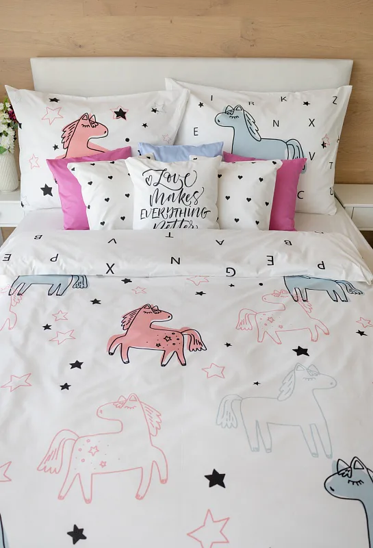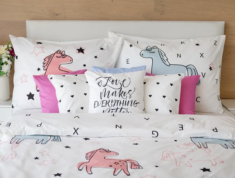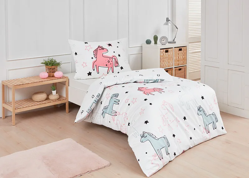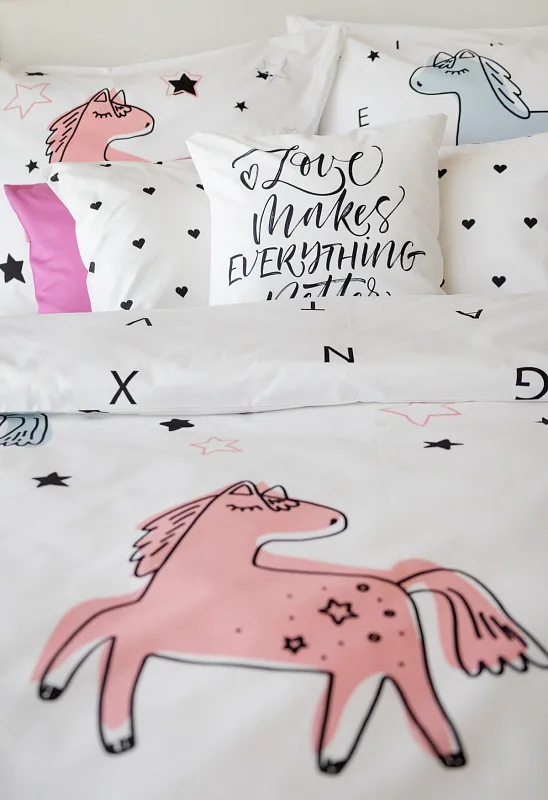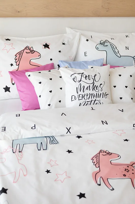 Dětské bavlněné povlečení Sweet Ponny podnítí svou jednoduchostí dětskou fantazii. Ručně malované poníky doplňují na vrchní straně přikrývky a polštáře barevné a černé hvězdičky. Spodní strana povlaku na polštář zachycuje modrého poníka s písmenky, stejně tak spodní strana přikrývky je po celé ploše poseta černými písmenky, jak je částečně vyobrazeno na ilustrační fotografii.