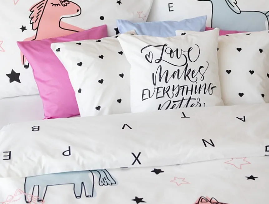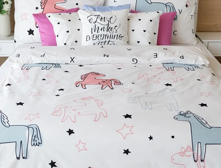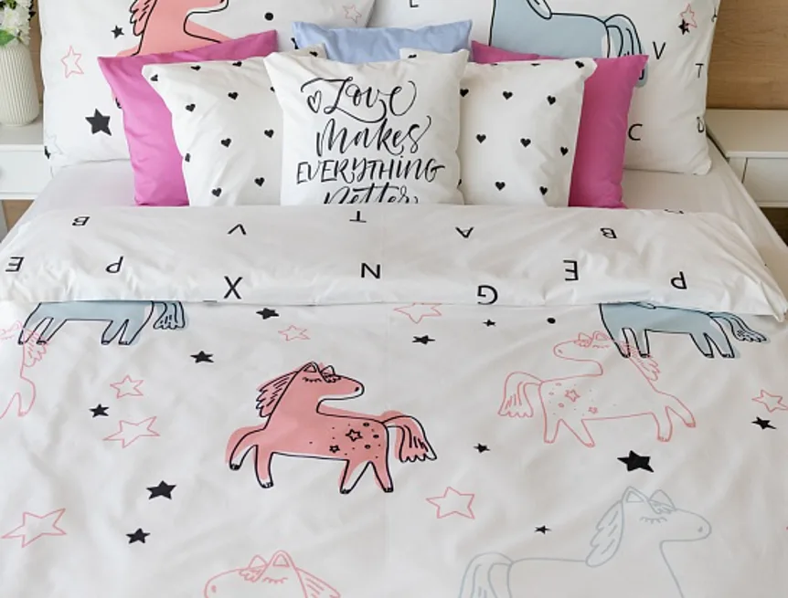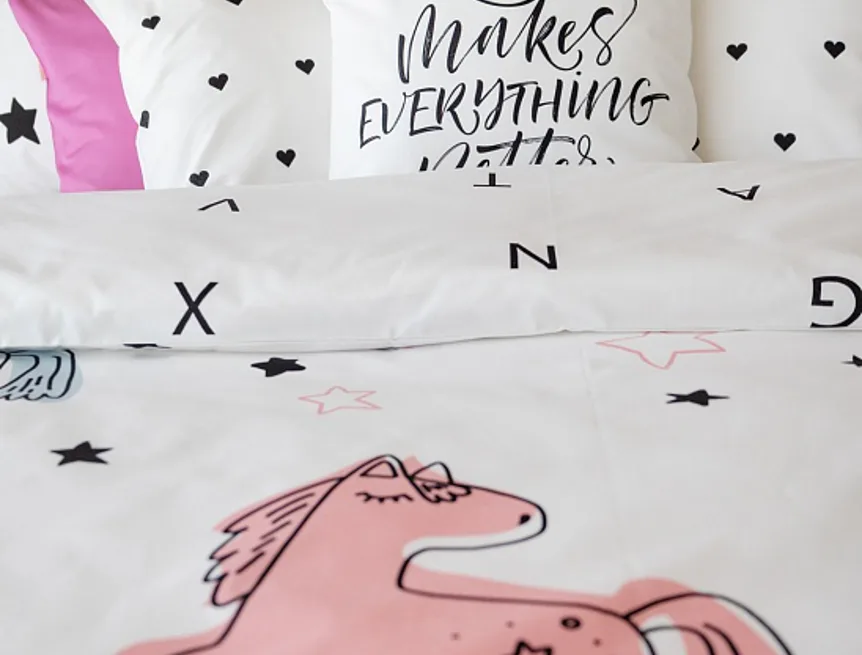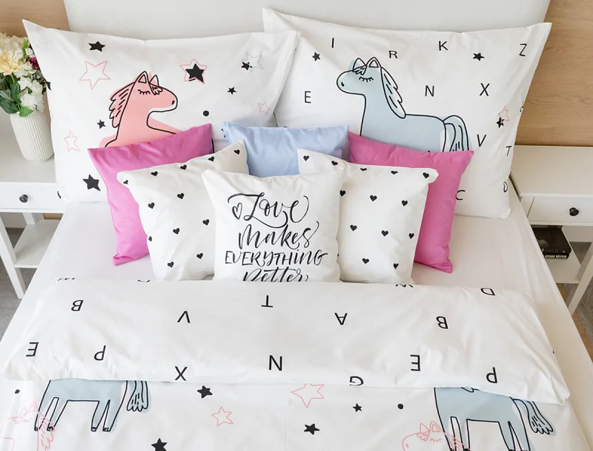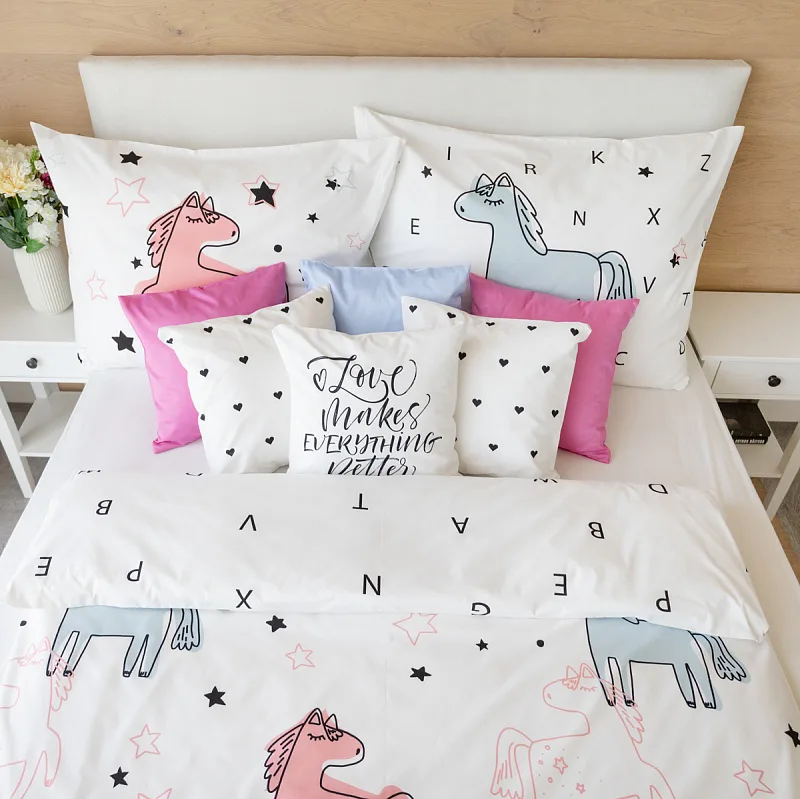 Dětské bavlněné povlečení Sweet Ponny podnítí svou jednoduchostí dětskou fantazii. Ručně malované poníky doplňují na vrchní straně přikrývky a polštáře barevné a černé hvězdičky. Spodní strana povlaku na polštář zachycuje modrého poníka s písmenky, stejně tak spodní strana přikrývky je po celé ploše poseta černými písmenky, jak je částečně vyobrazeno na ilustrační fotografii.