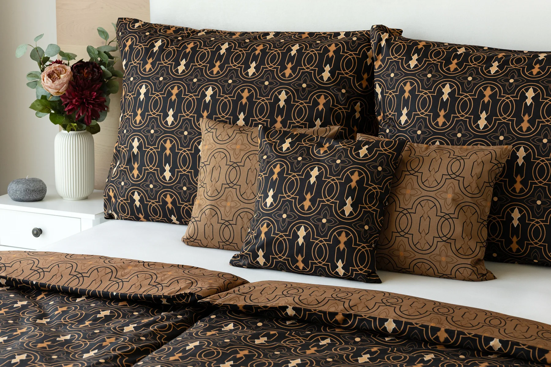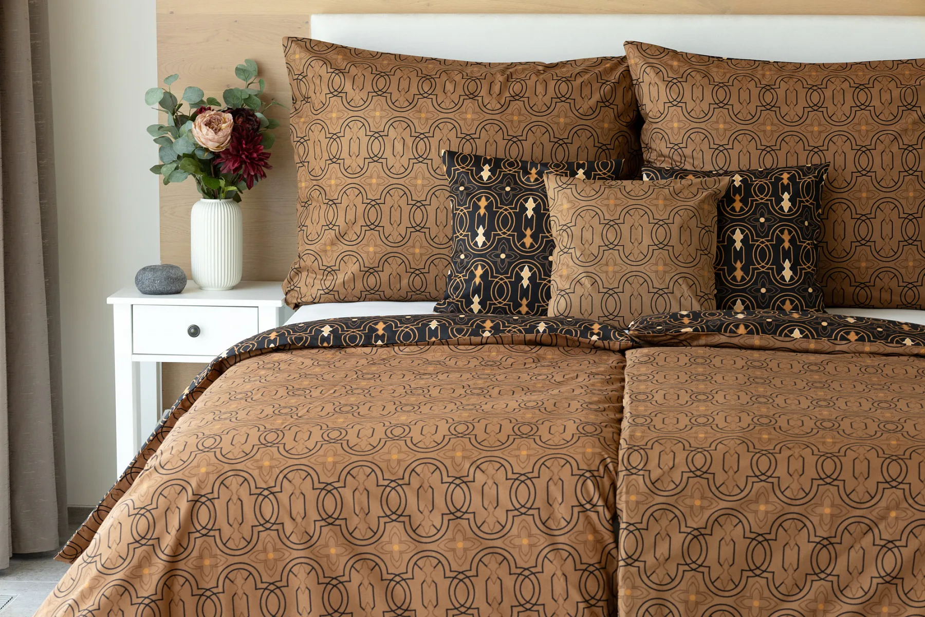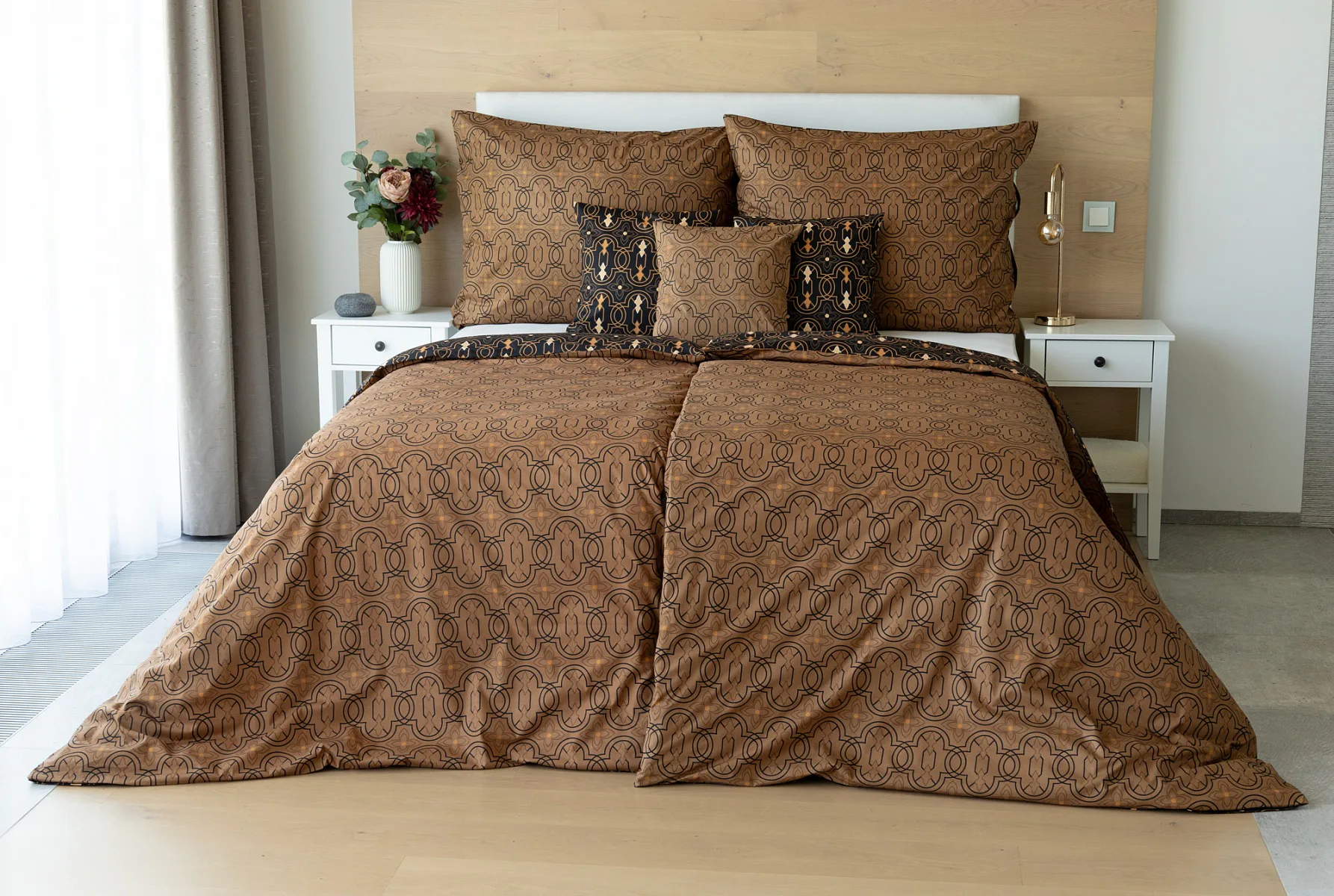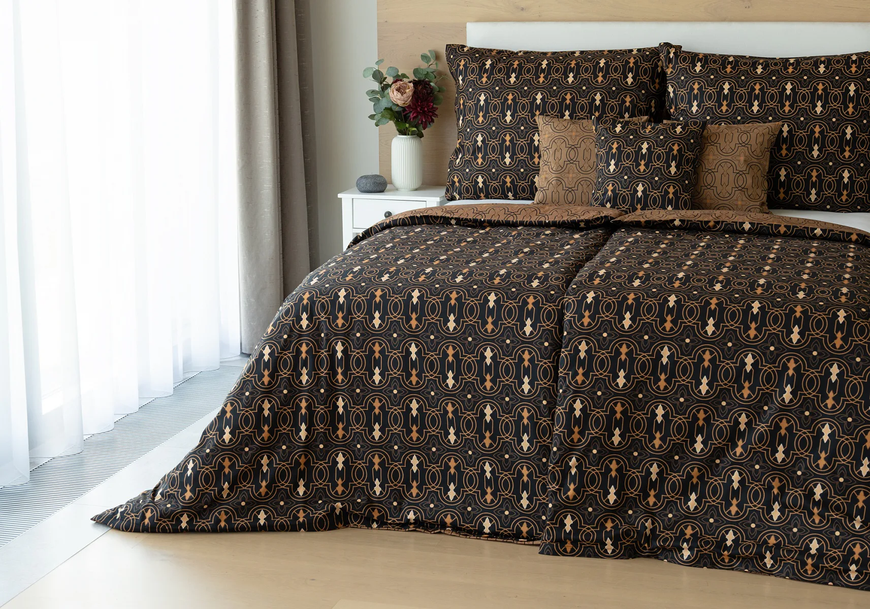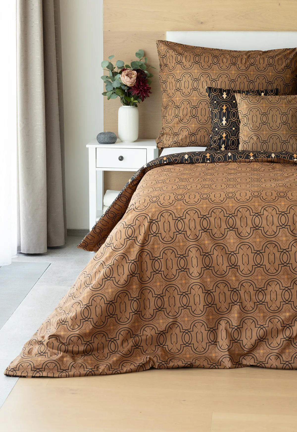 Povlečení Thalaso je stvořené pro milovníky luxusu a elegance. Nechte se hýčkat hřejivými odstíny nugátu v kombinaci s černou a originálním art deco motivem.