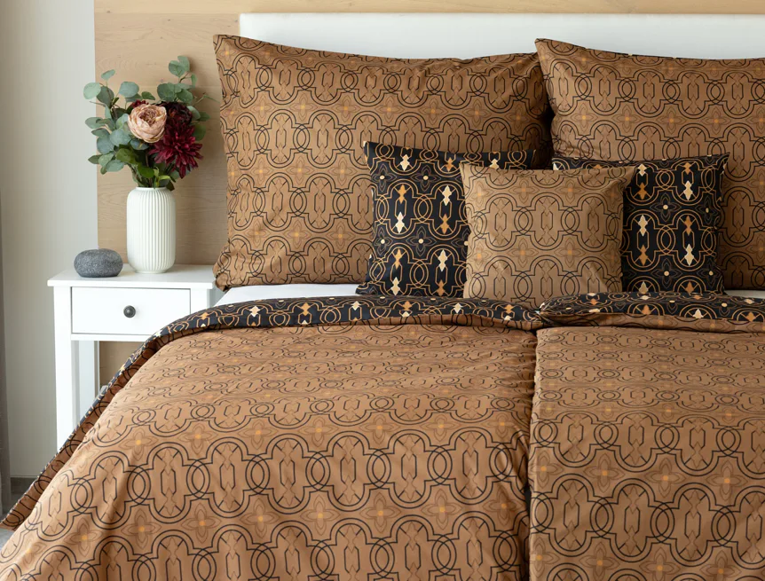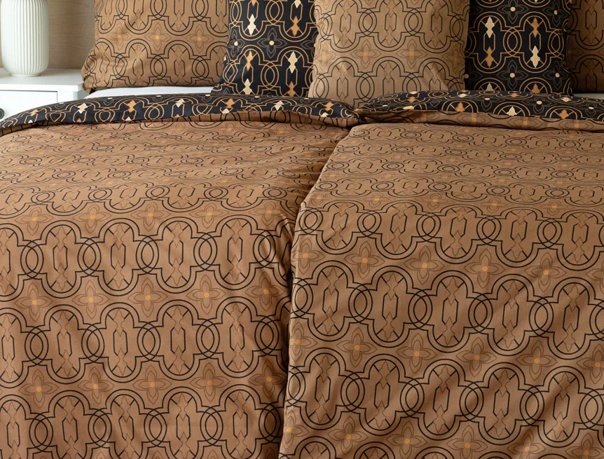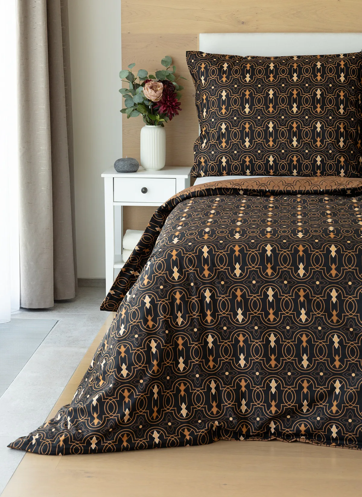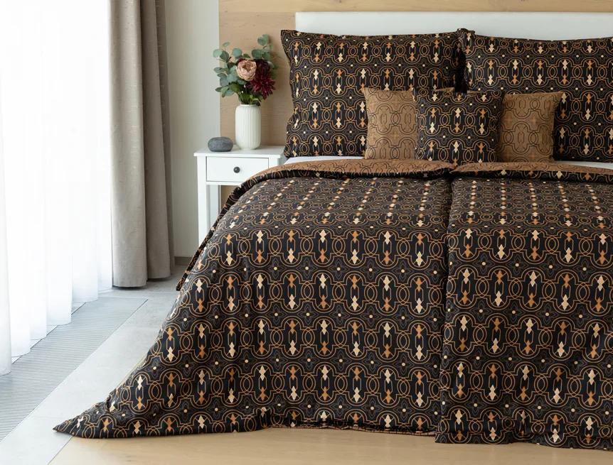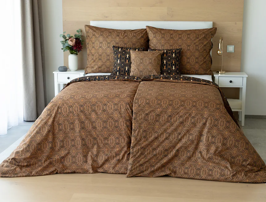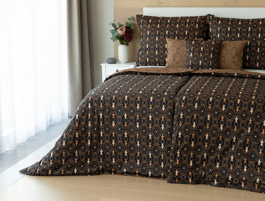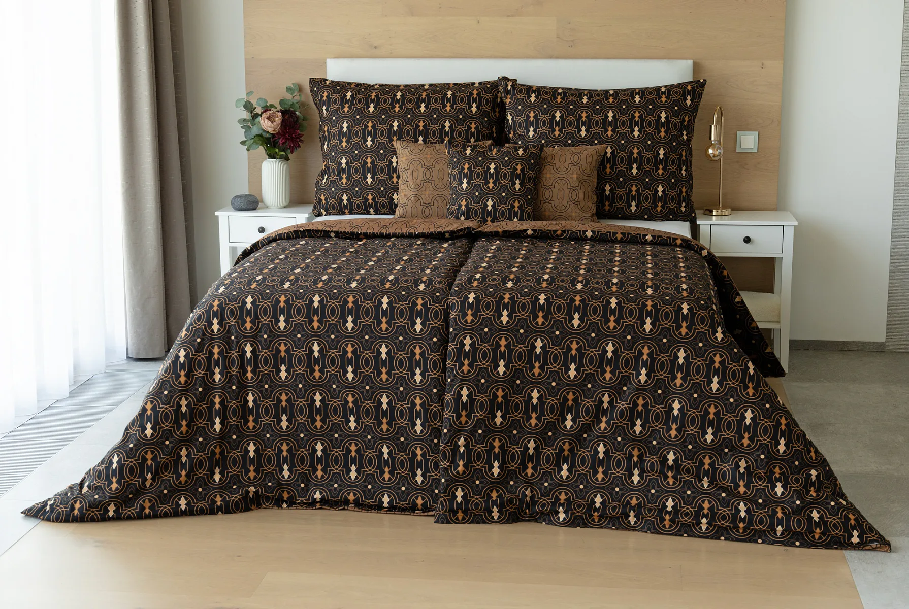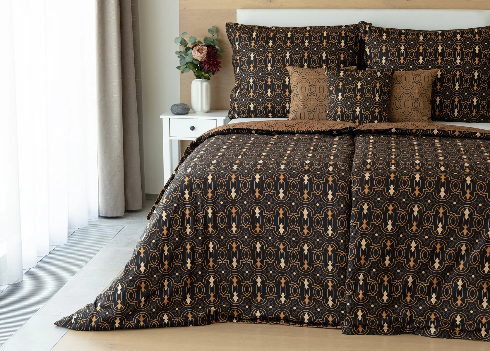 Povlečení Thalaso je stvořené pro milovníky luxusu a elegance. Nechte se hýčkat hřejivými odstíny nugátu v kombinaci s černou a originálním art deco motivem.