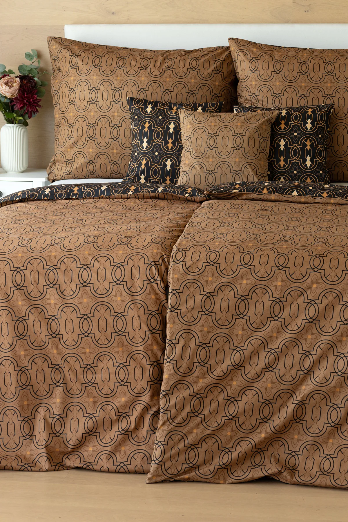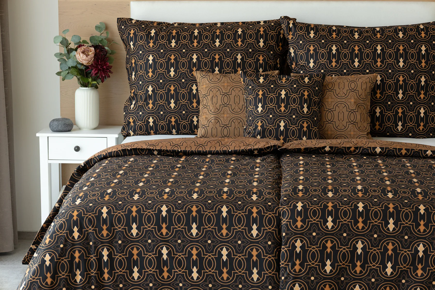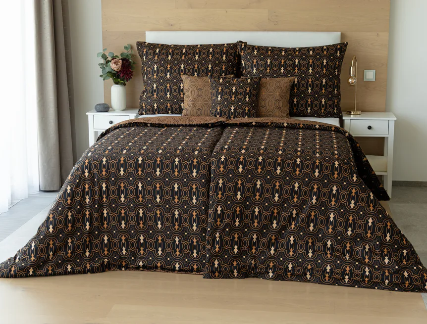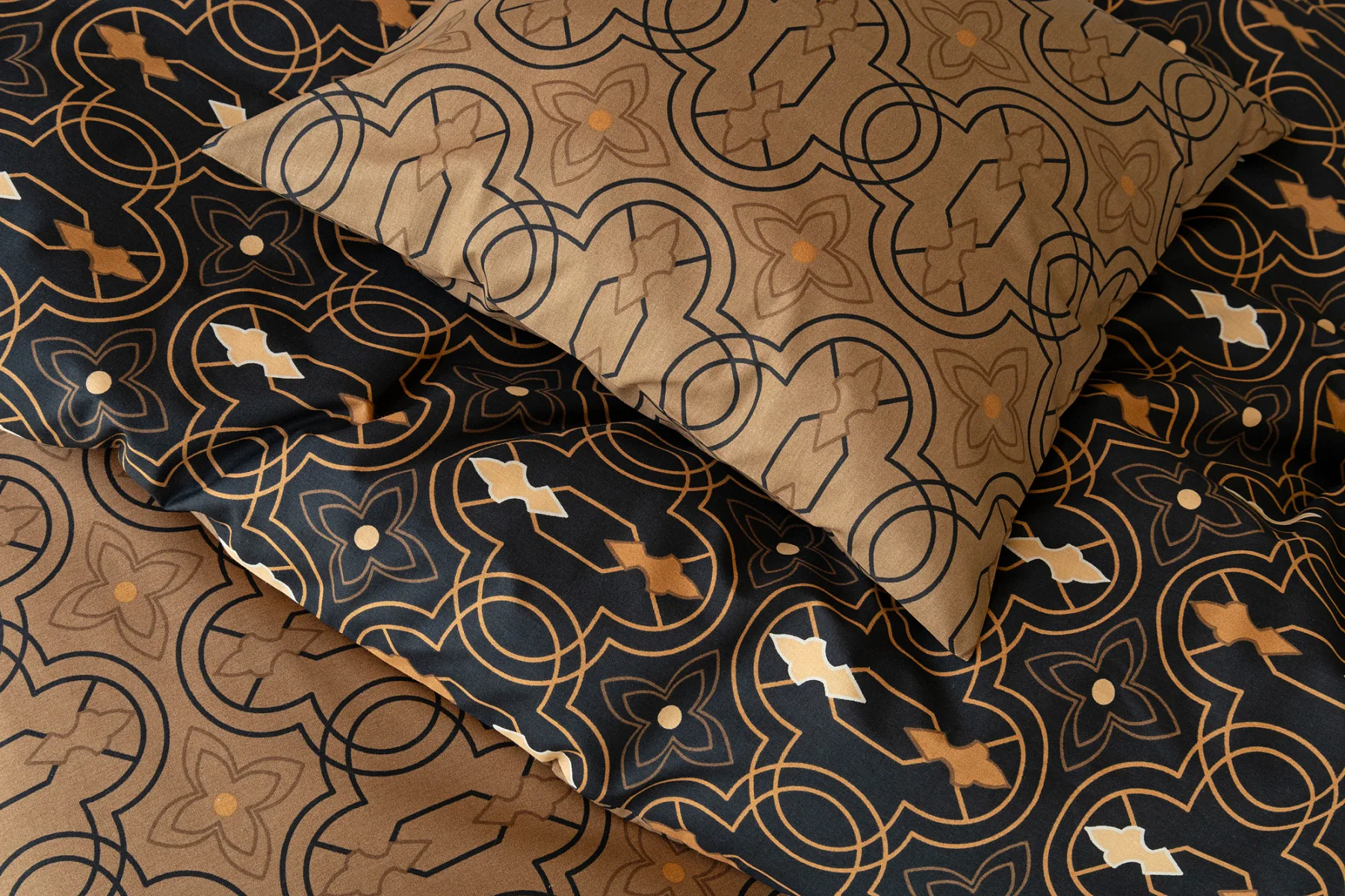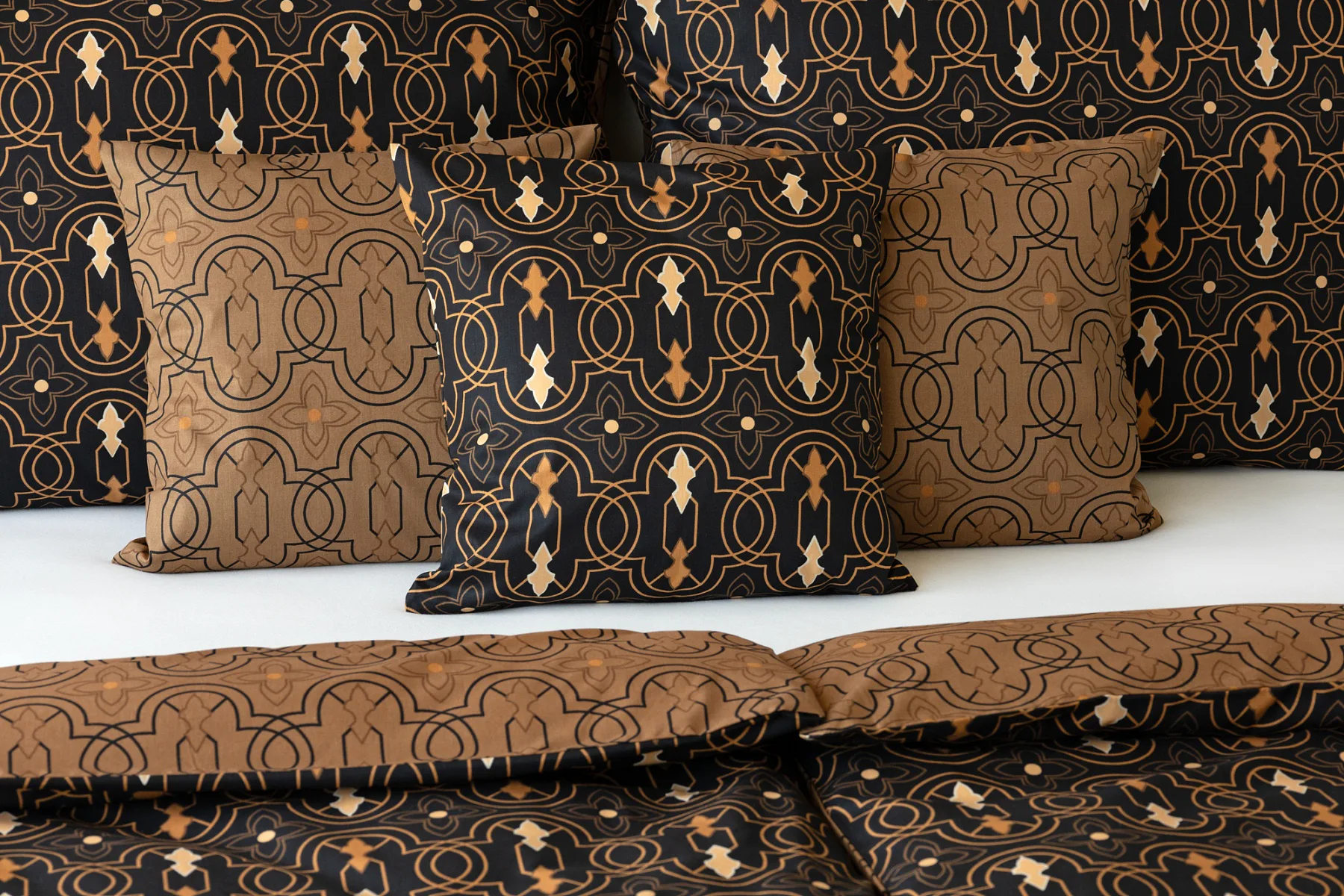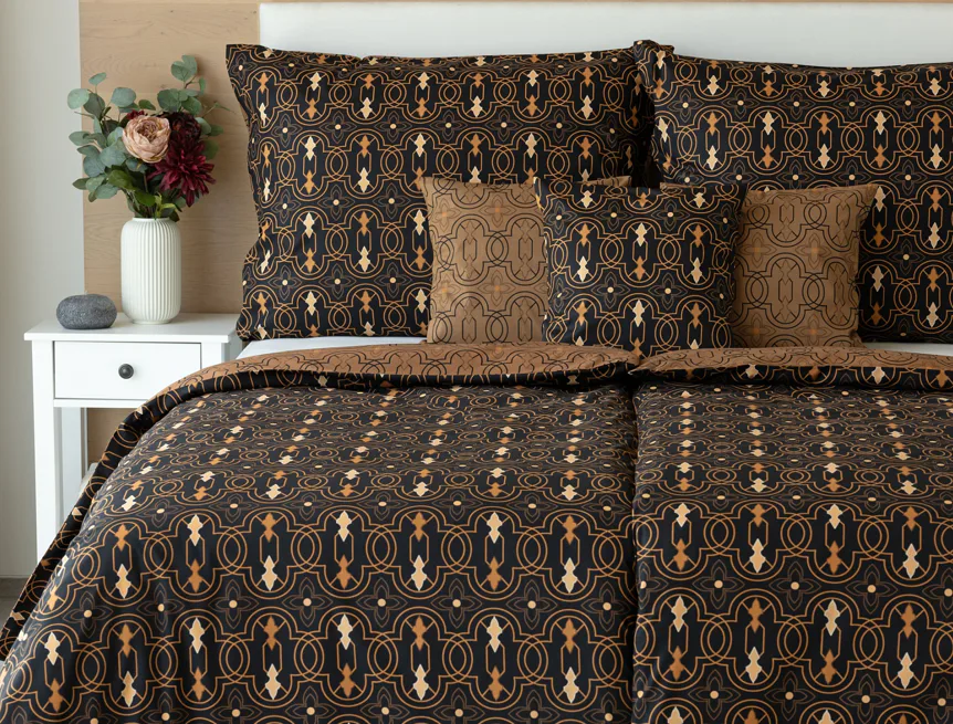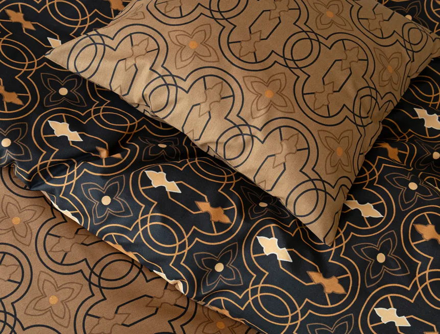 Povlečení Thalaso je stvořené pro milovníky luxusu a elegance. Nechte se hýčkat hřejivými odstíny nugátu v kombinaci s černou a originálním art deco motivem.