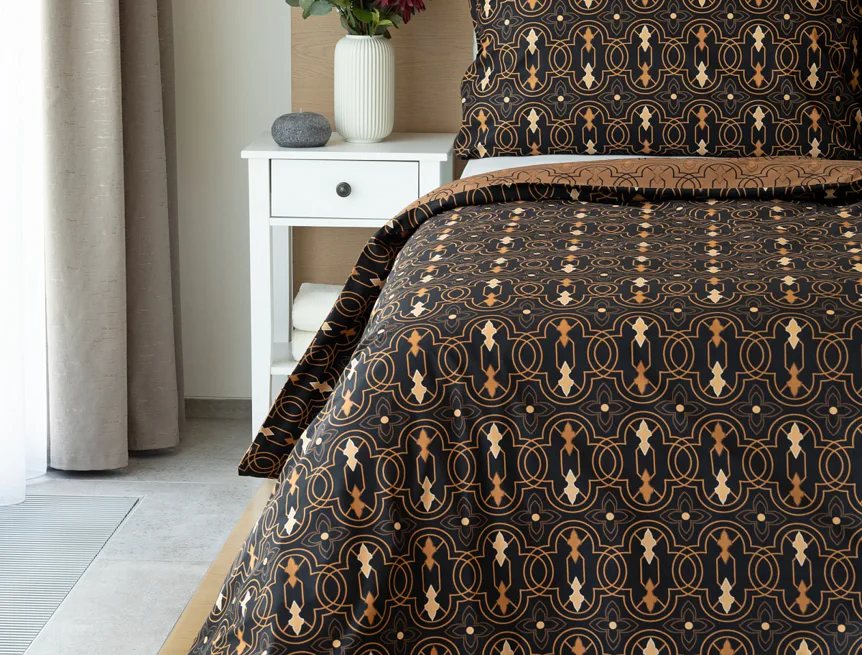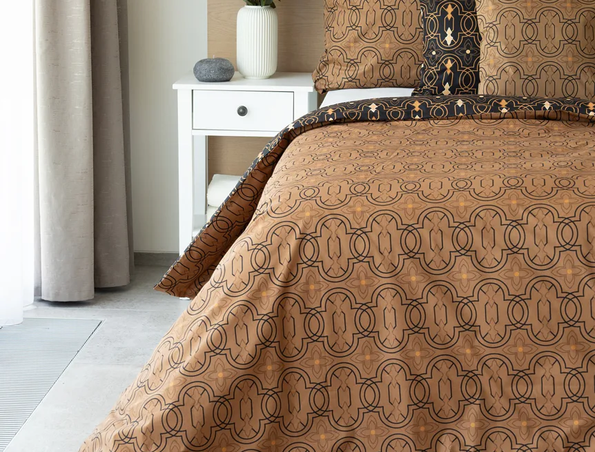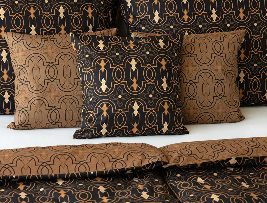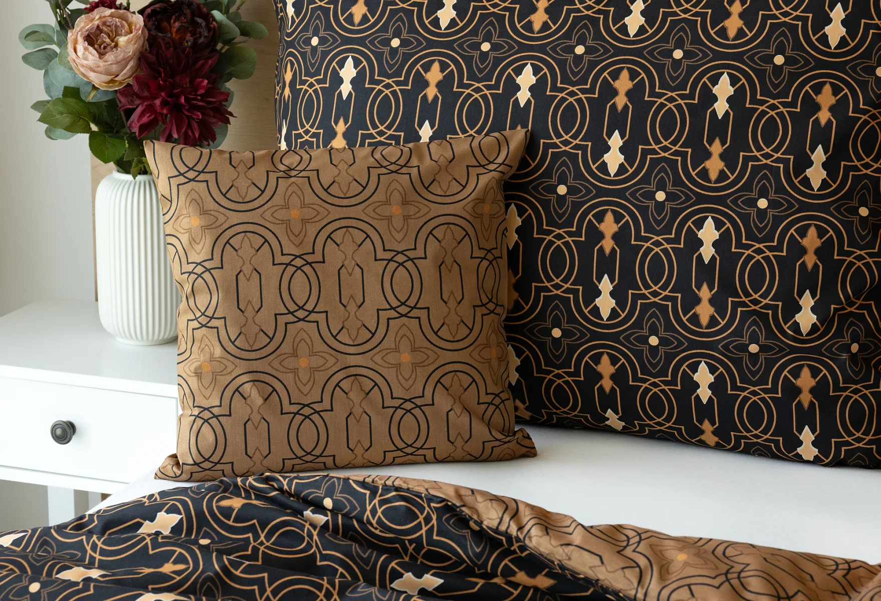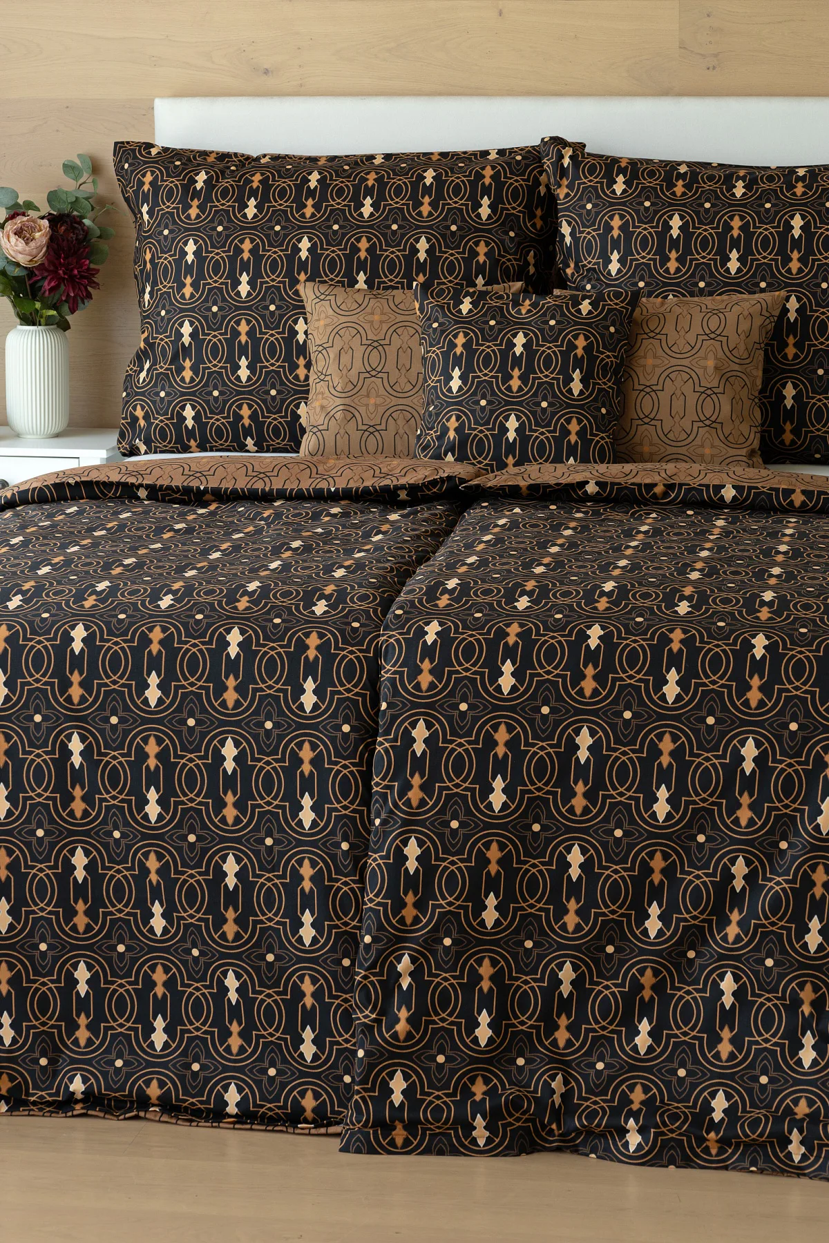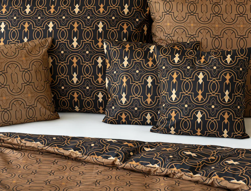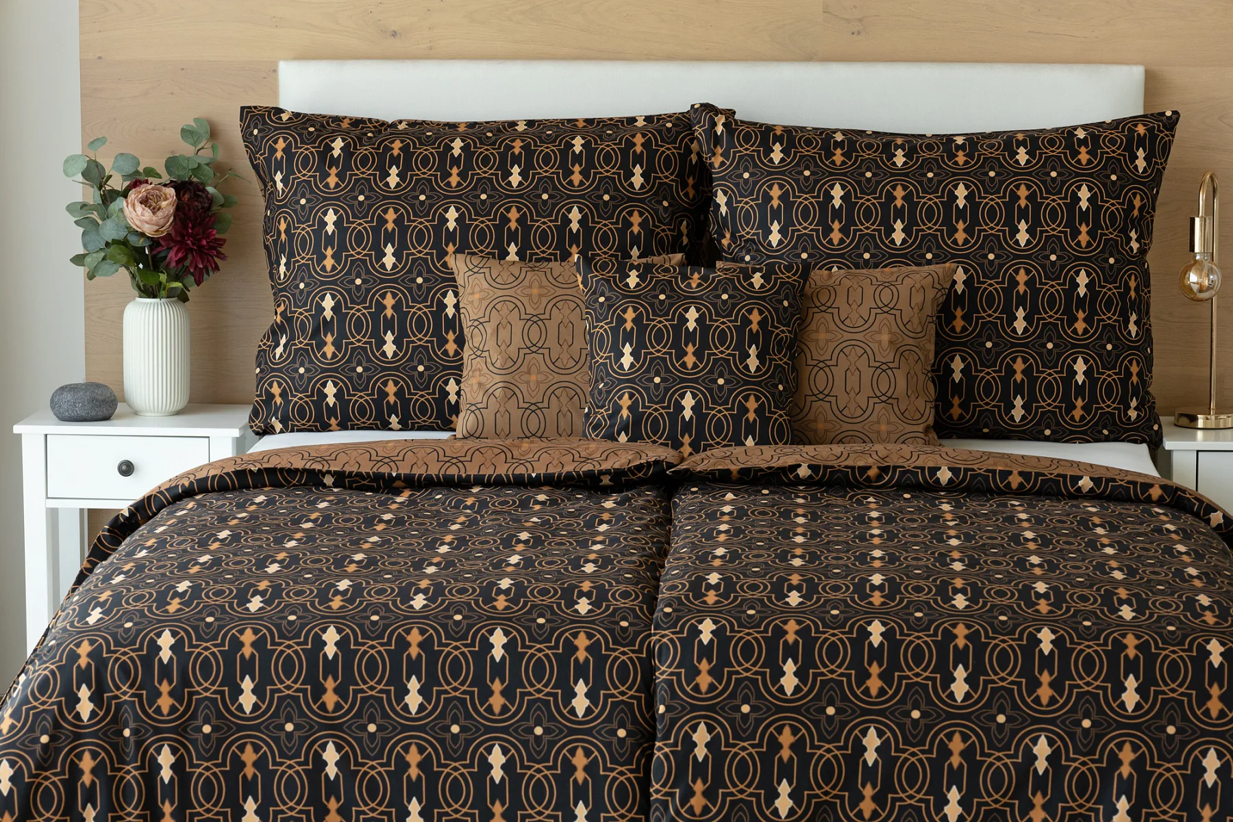 Povlečení Thalaso je stvořené pro milovníky luxusu a elegance. Nechte se hýčkat hřejivými odstíny nugátu v kombinaci s černou a originálním art deco motivem.