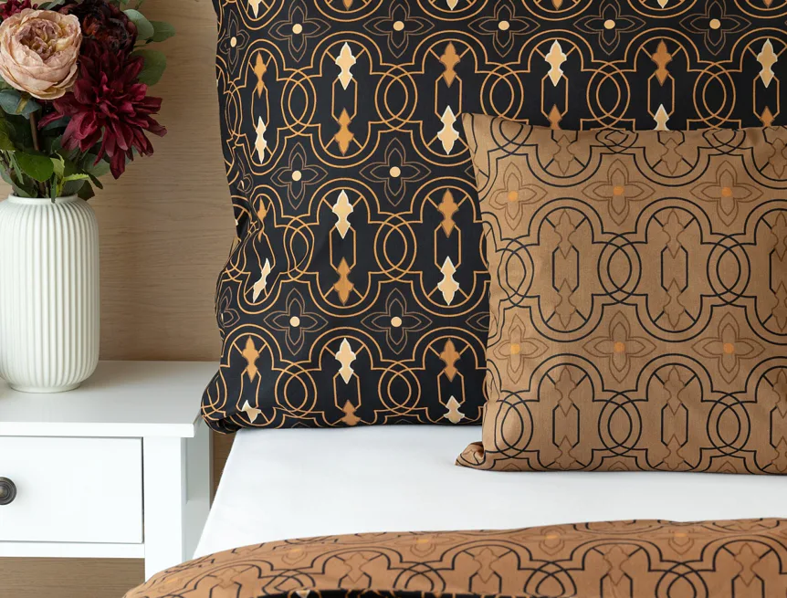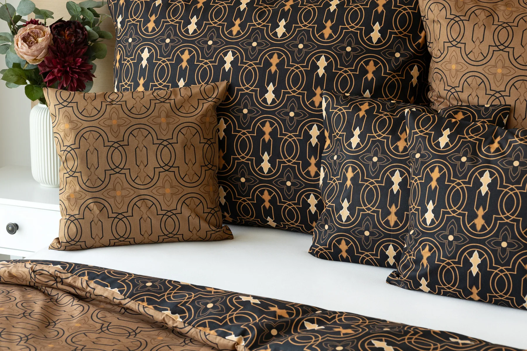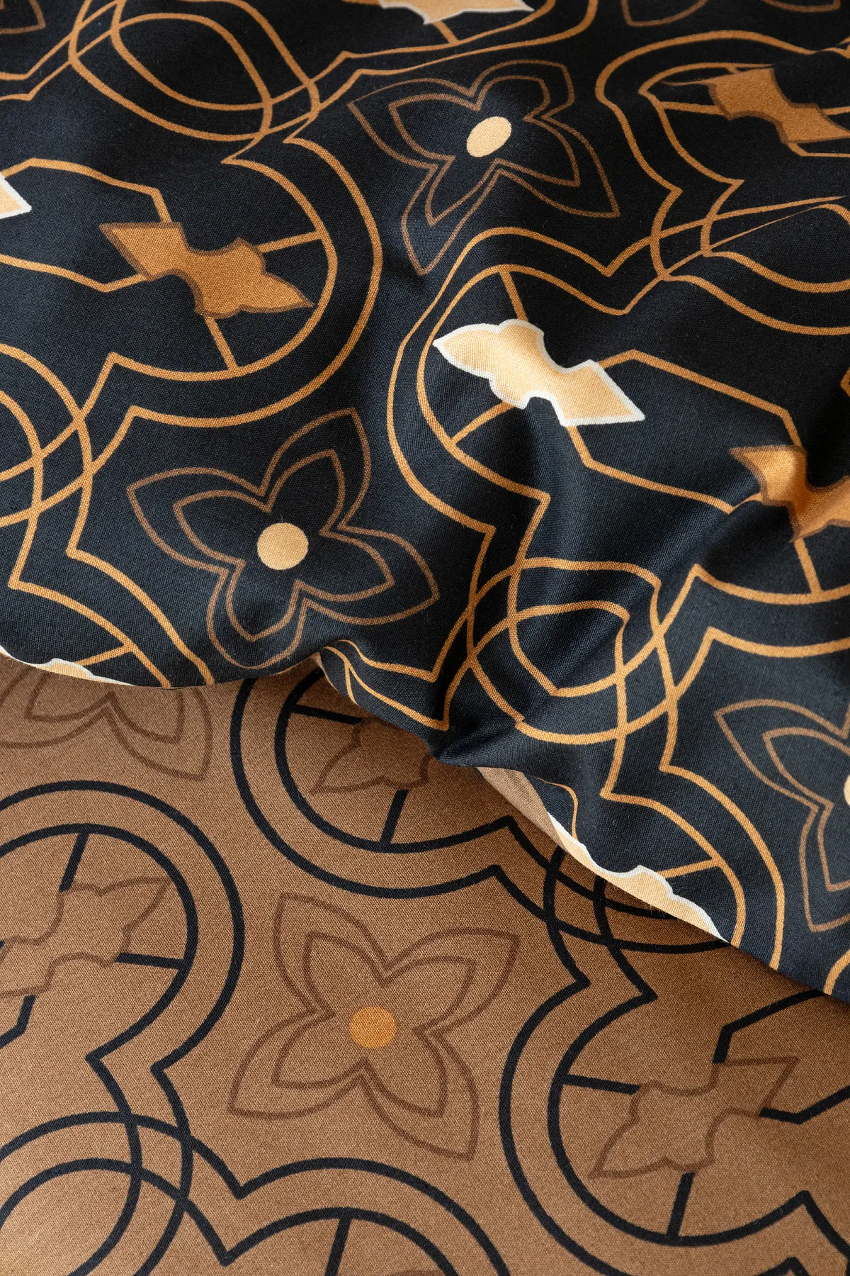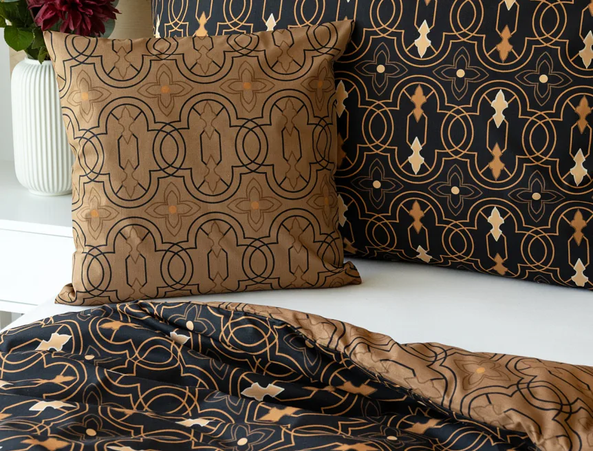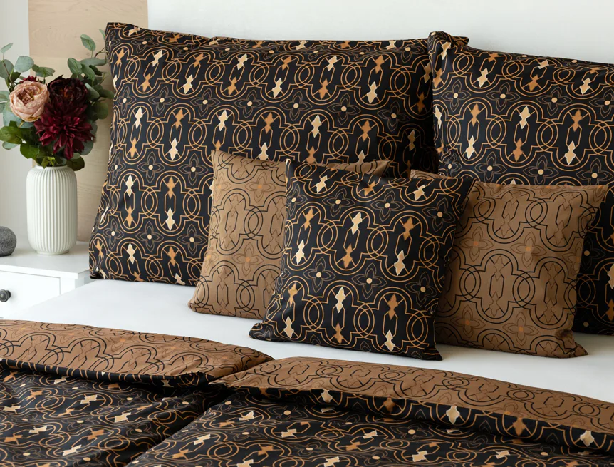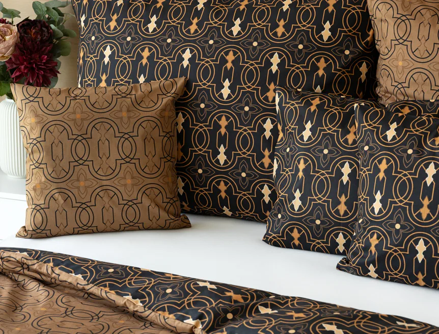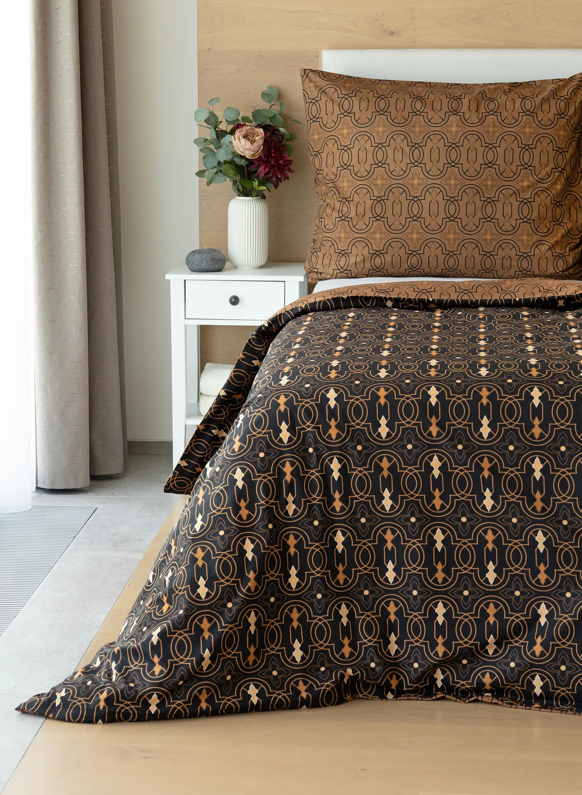 Povlečení Thalaso je stvořené pro milovníky luxusu a elegance. Nechte se hýčkat hřejivými odstíny nugátu v kombinaci s černou a originálním art deco motivem.