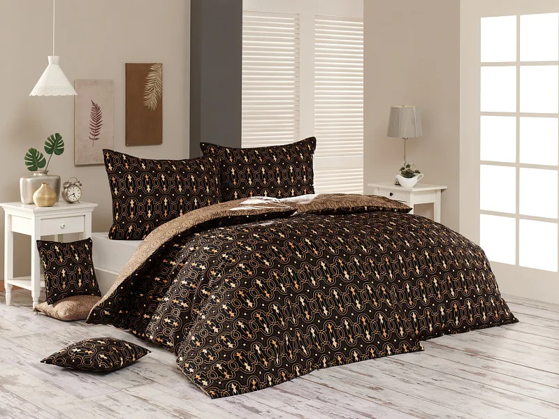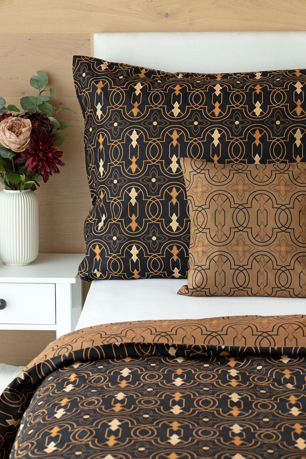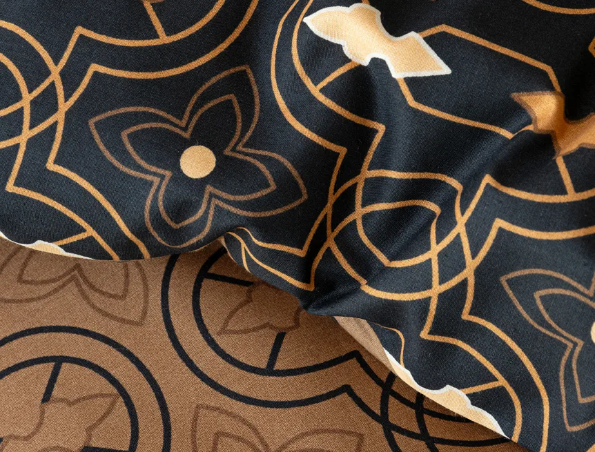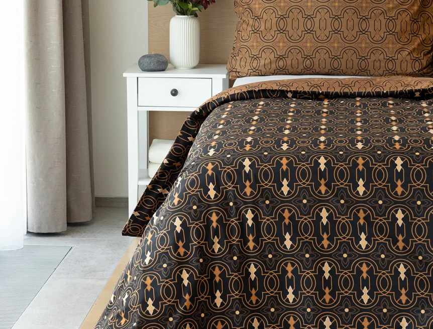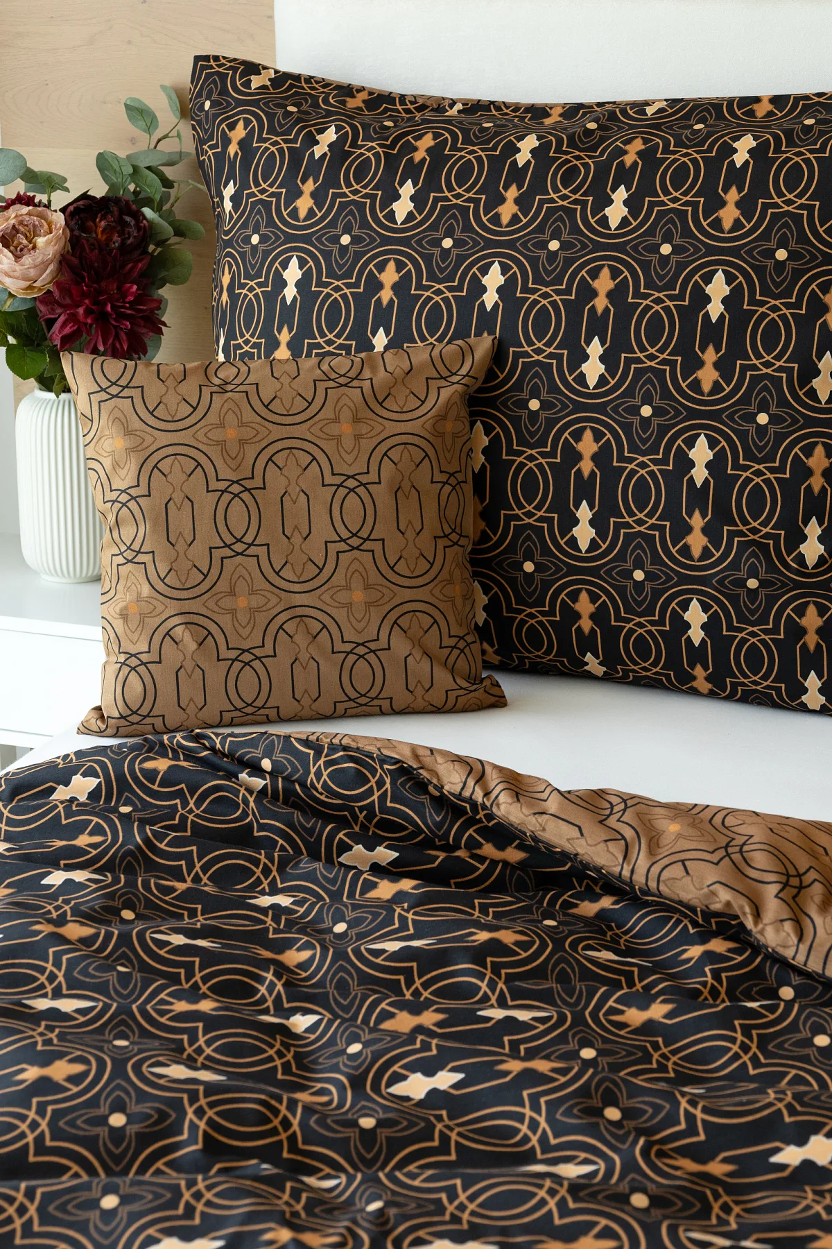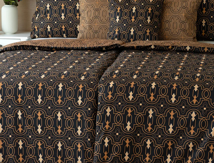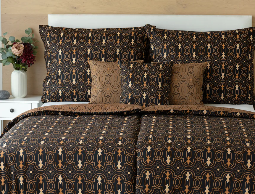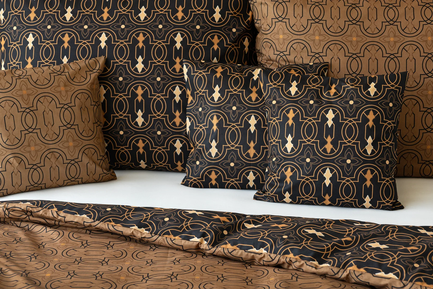 Povlečení Thalaso je stvořené pro milovníky luxusu a elegance. Nechte se hýčkat hřejivými odstíny nugátu v kombinaci s černou a originálním art deco motivem.