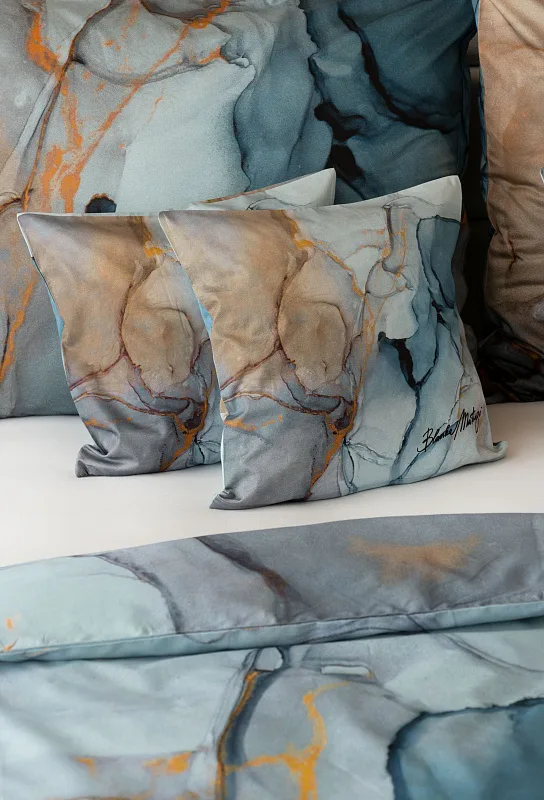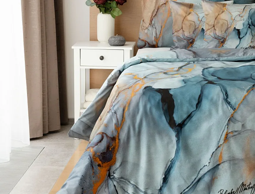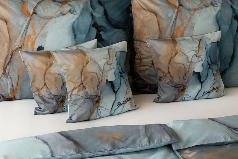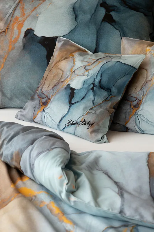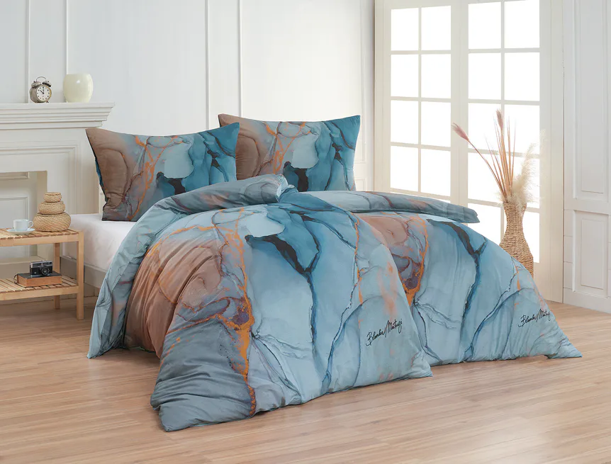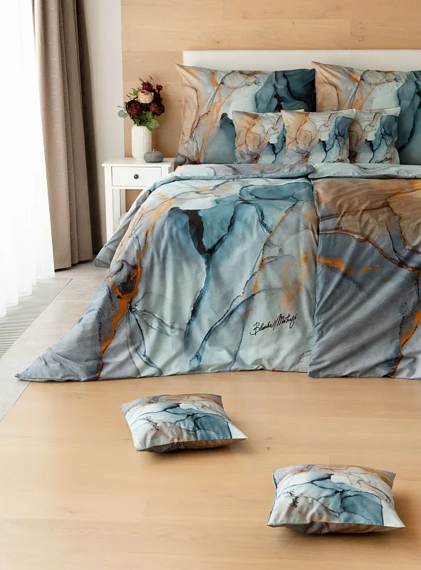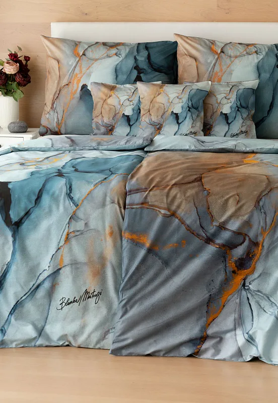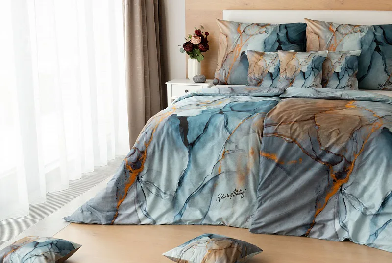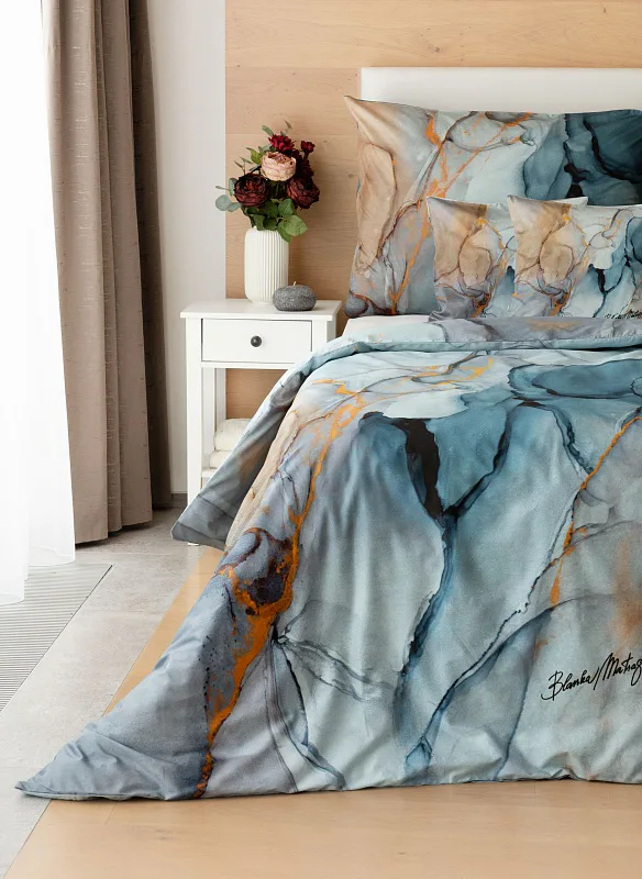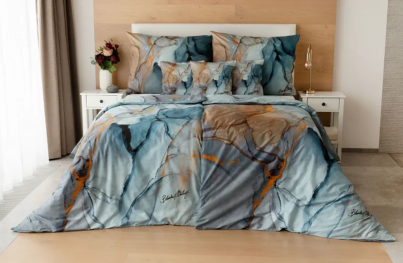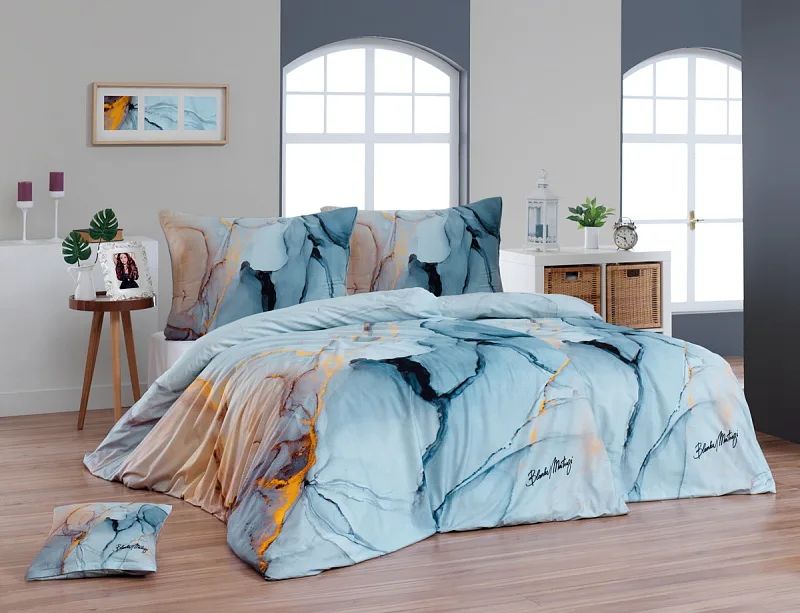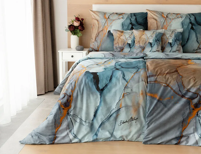 Povlečení Trip se stane nepřehlédnutelným solitérem každé moderní ložnice. Uměleckému vzoru vévodí harmonická paleta modrých tónů - od blankytné až po odstíny půlnoční oblohy. Důmyslnou strukturu designového vzoru podtrhují zemité zlatohnědé odstíny.