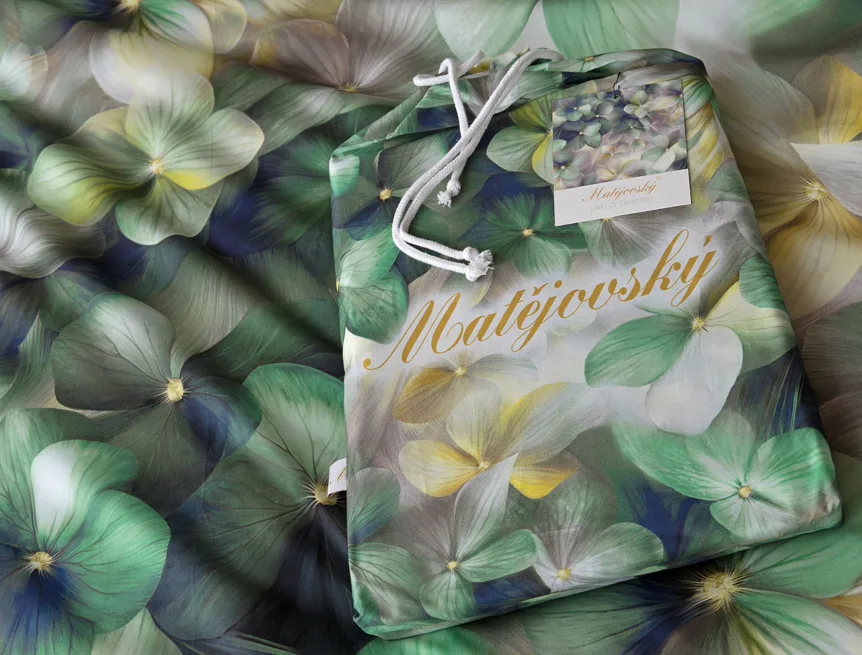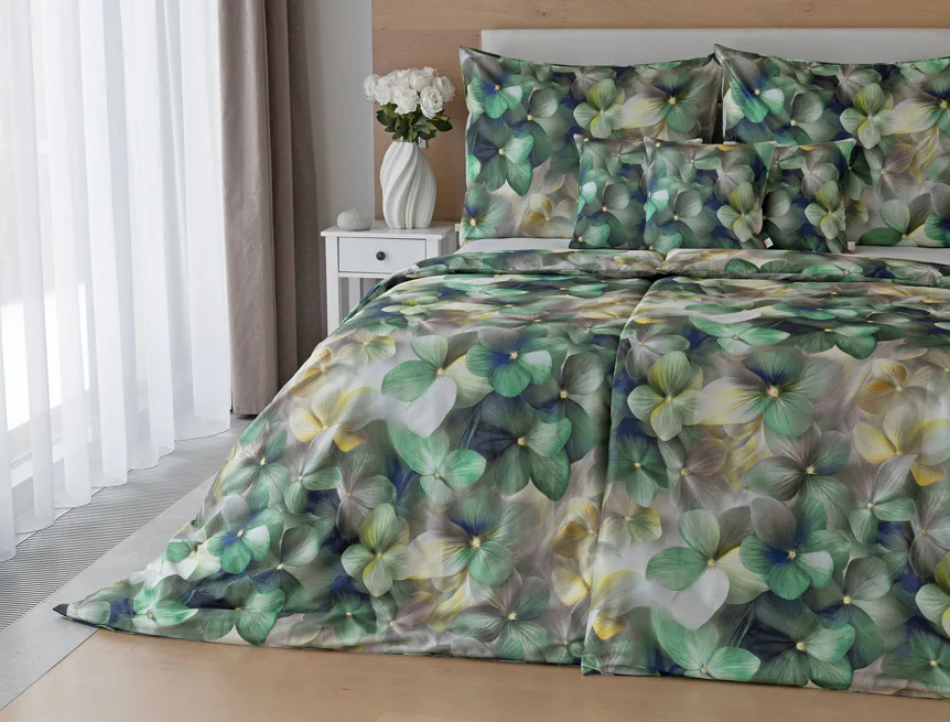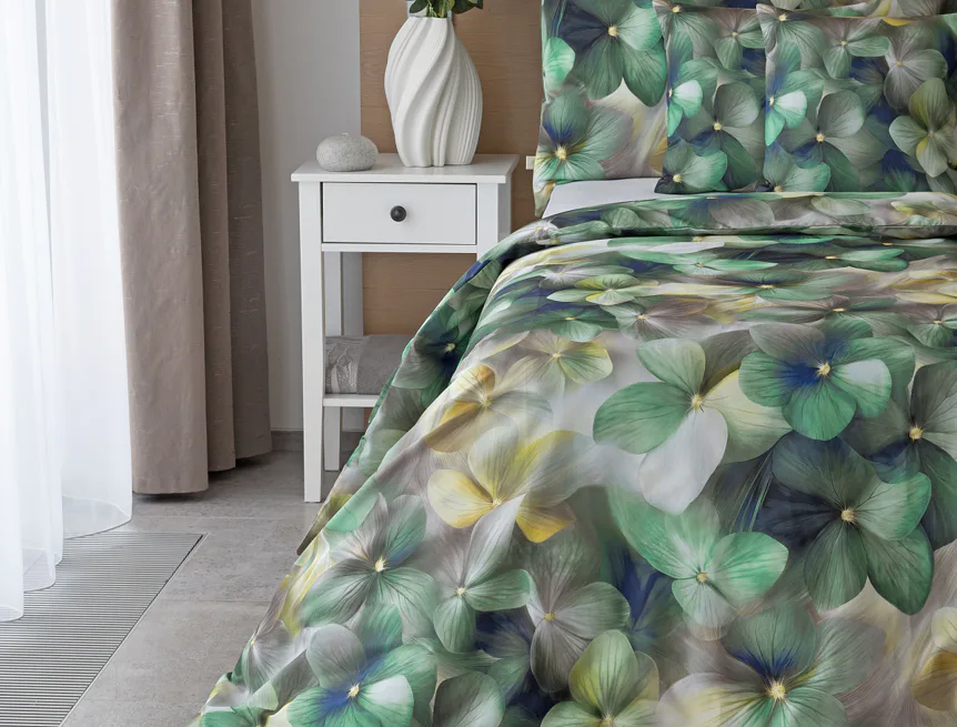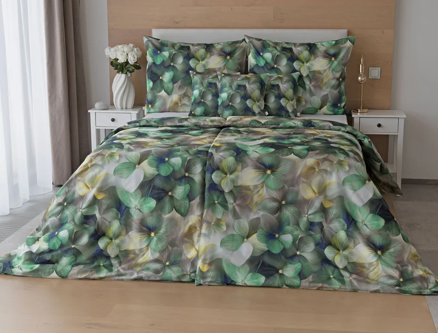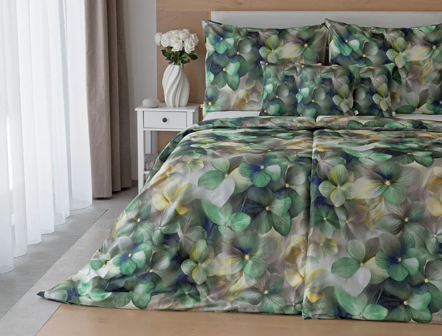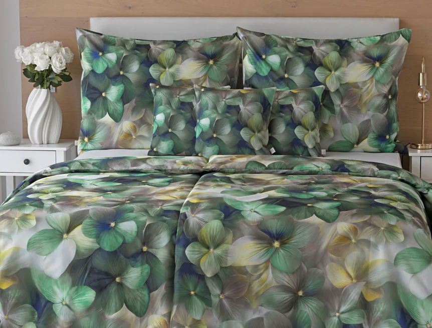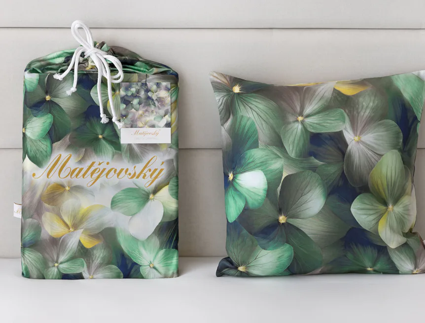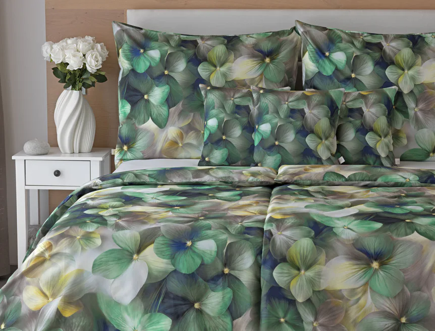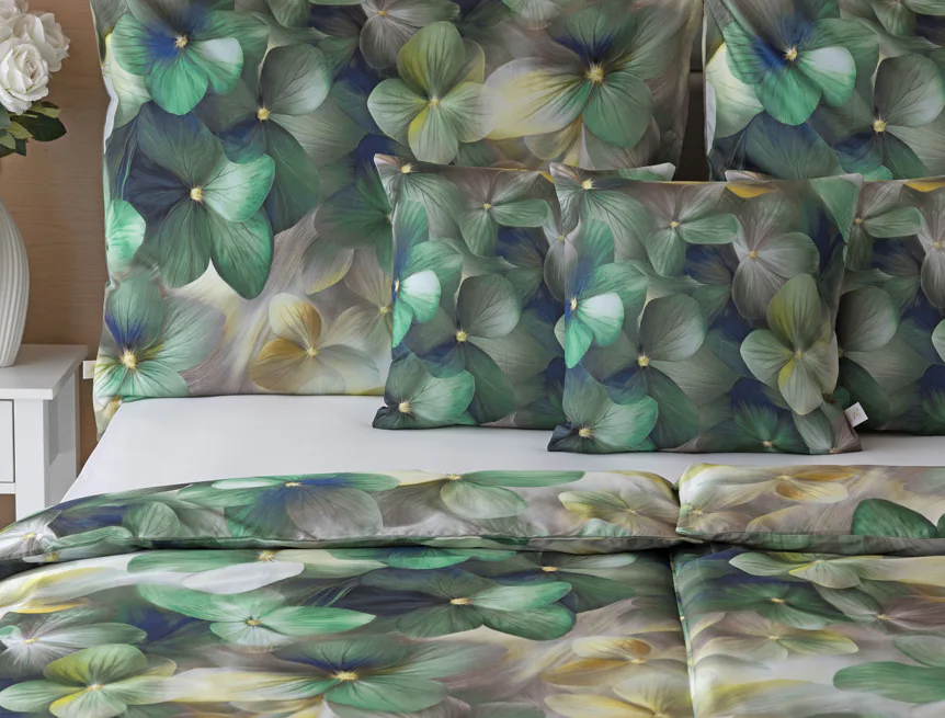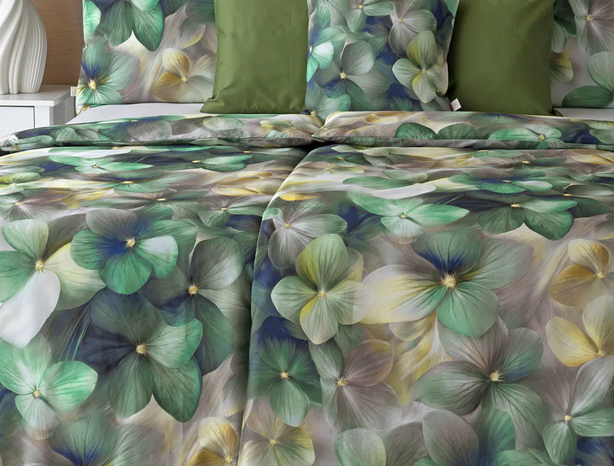 Tento výrazný květinový vzor je tvořen hustou kompozicí květů, které se překrývají a vytvářejí bohatý, dekorativní dojem. Dominují syté zelené tóny doplněné o jemné krémové, šedé a zlatavé akcenty, díky nimž působí dezén živě, ale stále elegantně. Povlak na polštář i na přikrývku je z obou stran stejný, vrchní stranu povlaku na polštář zdobí malé logo "M" v pravém dolním rohu. Povlečení je opatřeno komfortním zipovým uzávěrem