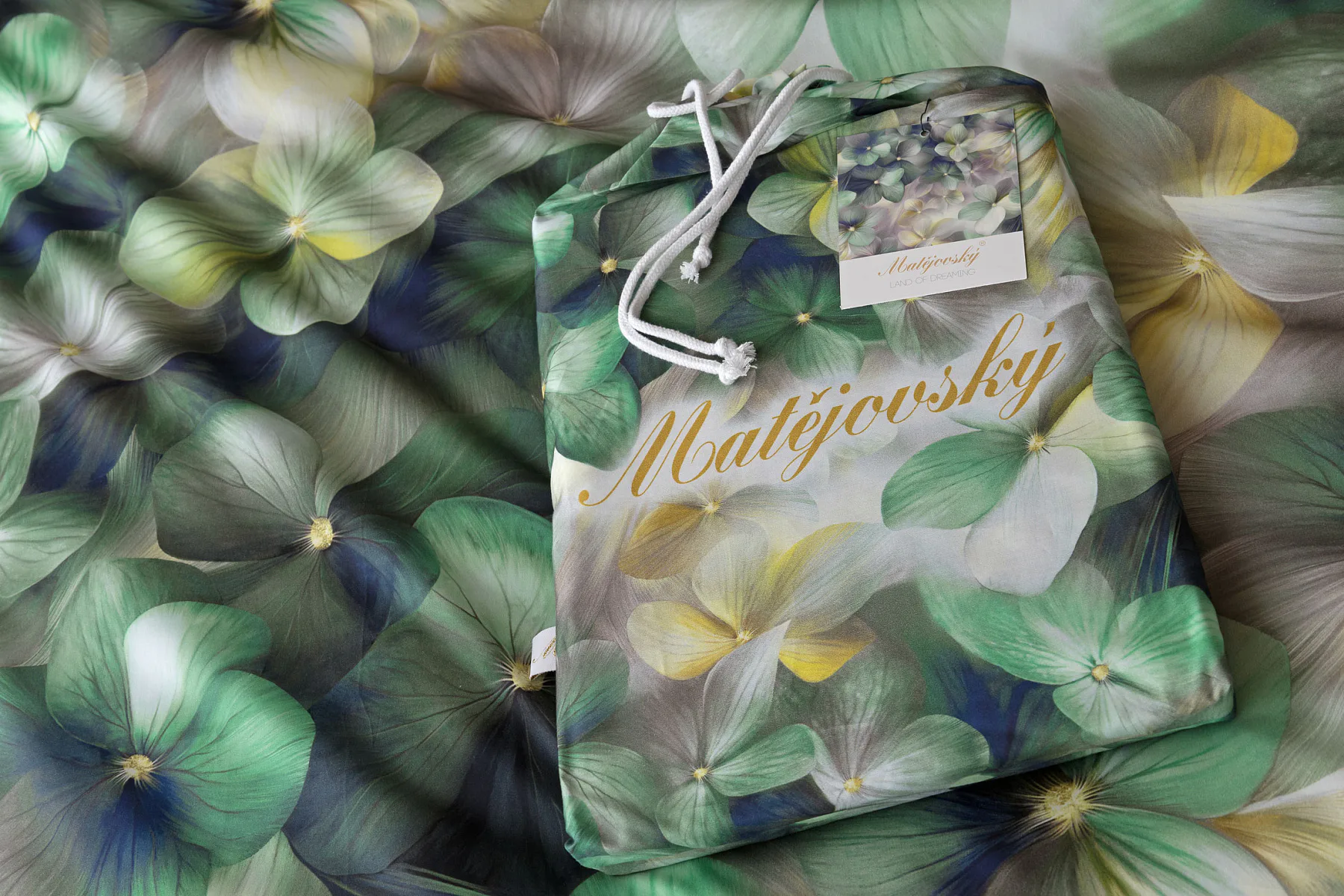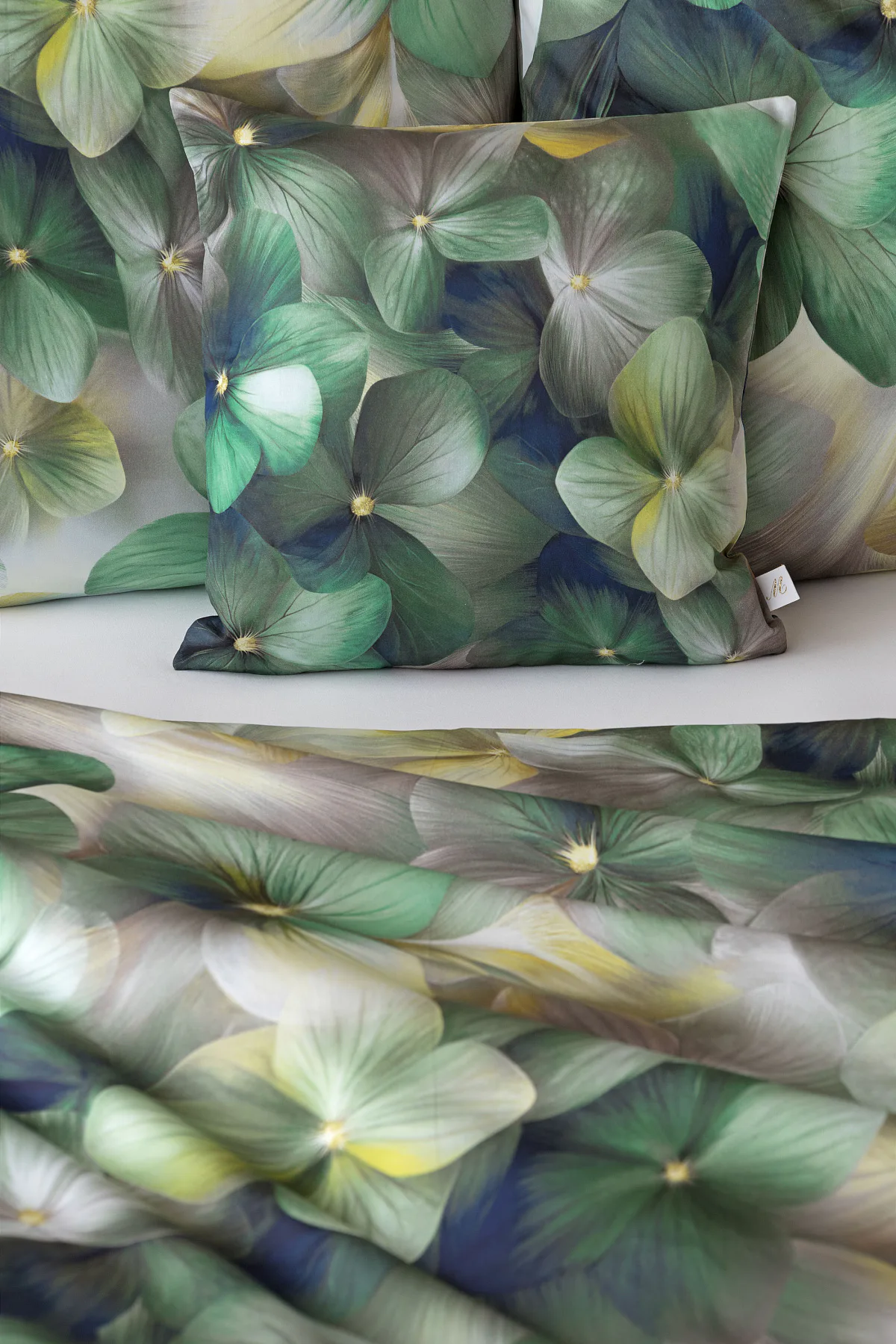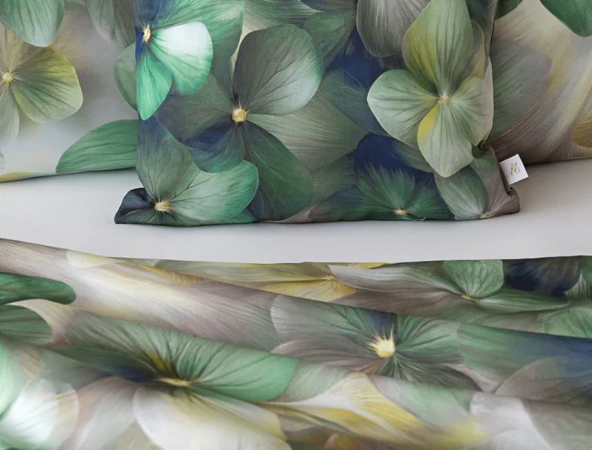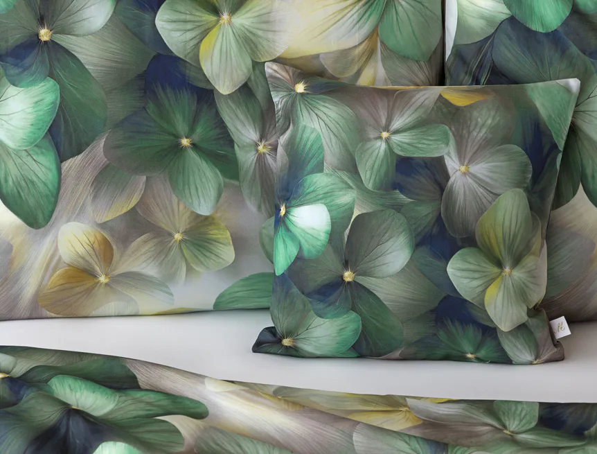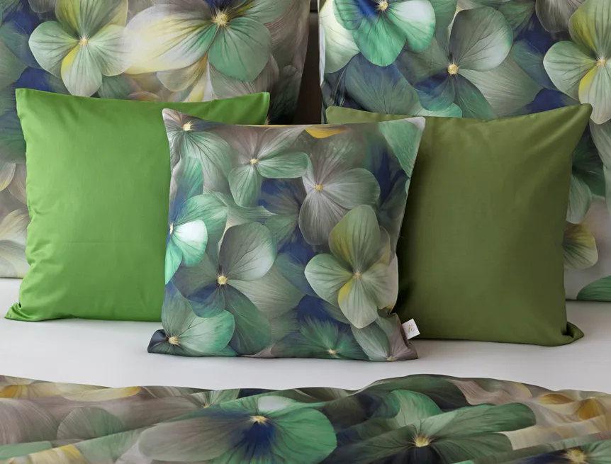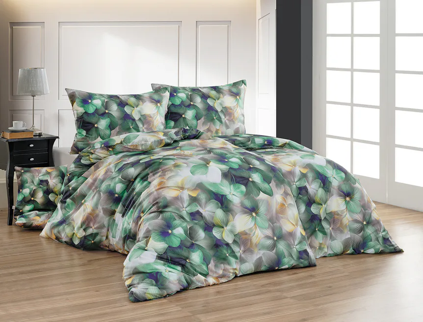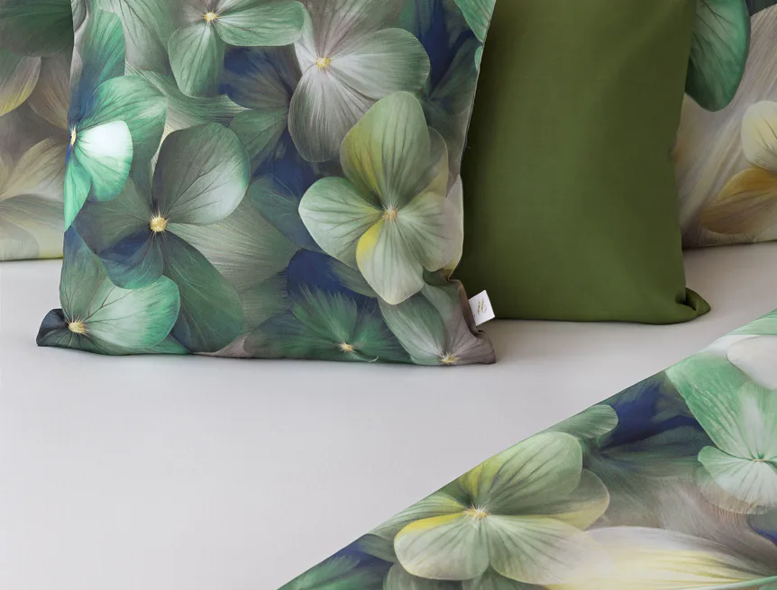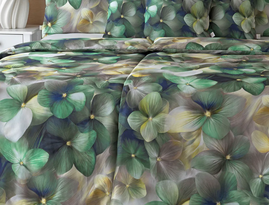 Tento výrazný květinový vzor je tvořen hustou kompozicí květů, které se překrývají a vytvářejí bohatý, dekorativní dojem. Dominují syté zelené tóny doplněné o jemné krémové, šedé a zlatavé akcenty, díky nimž působí dezén živě, ale stále elegantně. Povlak na polštář i na přikrývku je z obou stran stejný, vrchní stranu povlaku na polštář zdobí malé logo "M" v pravém dolním rohu. Povlečení je opatřeno komfortním zipovým uzávěrem