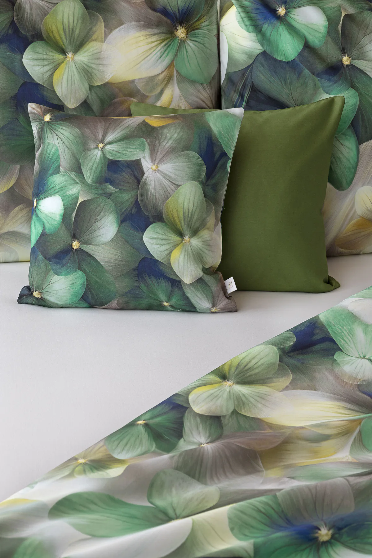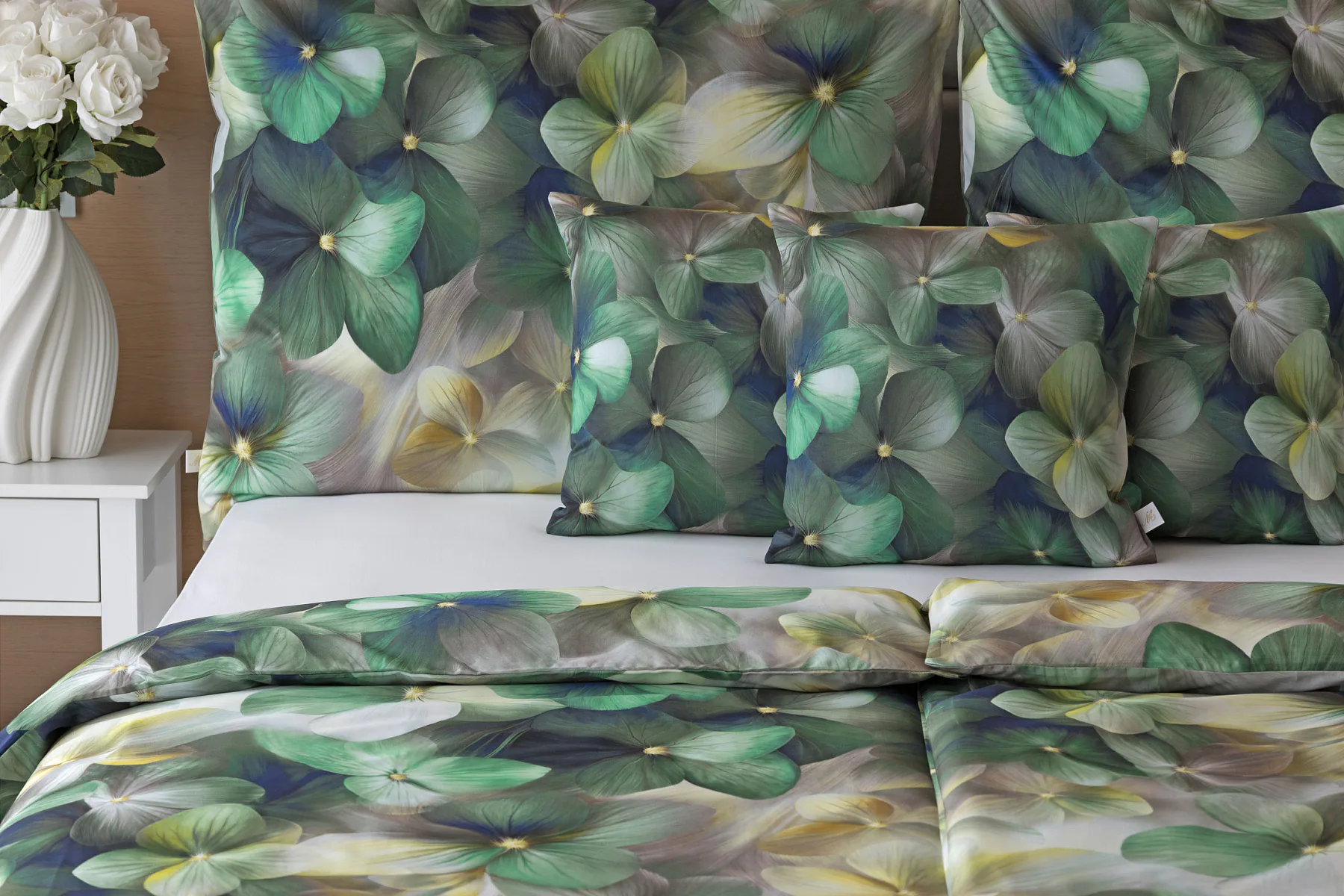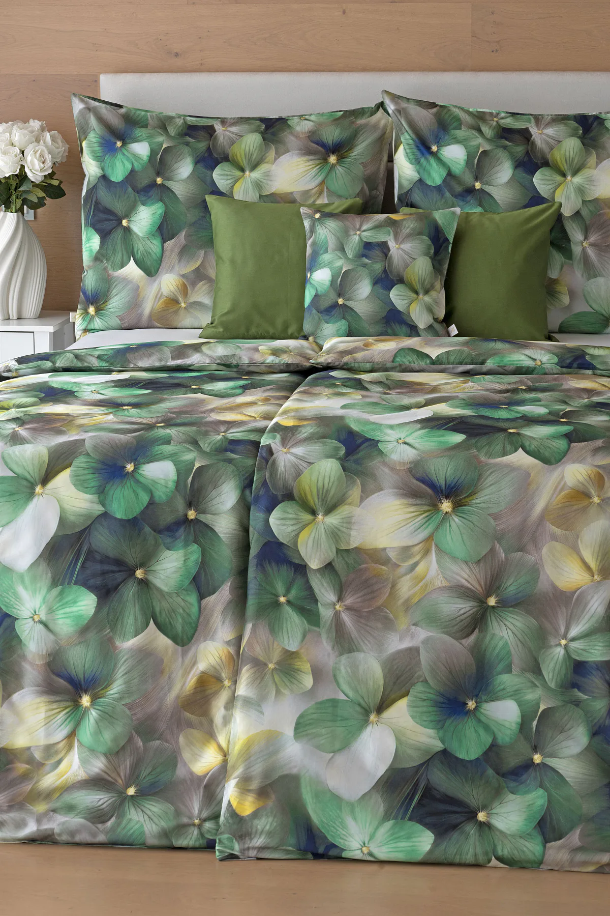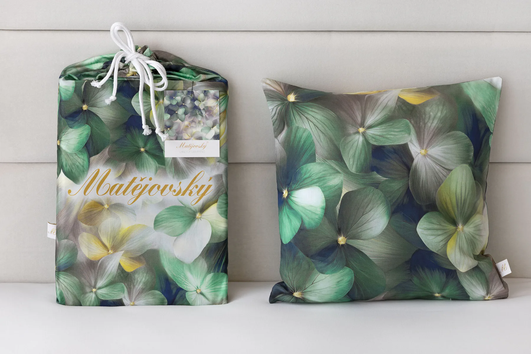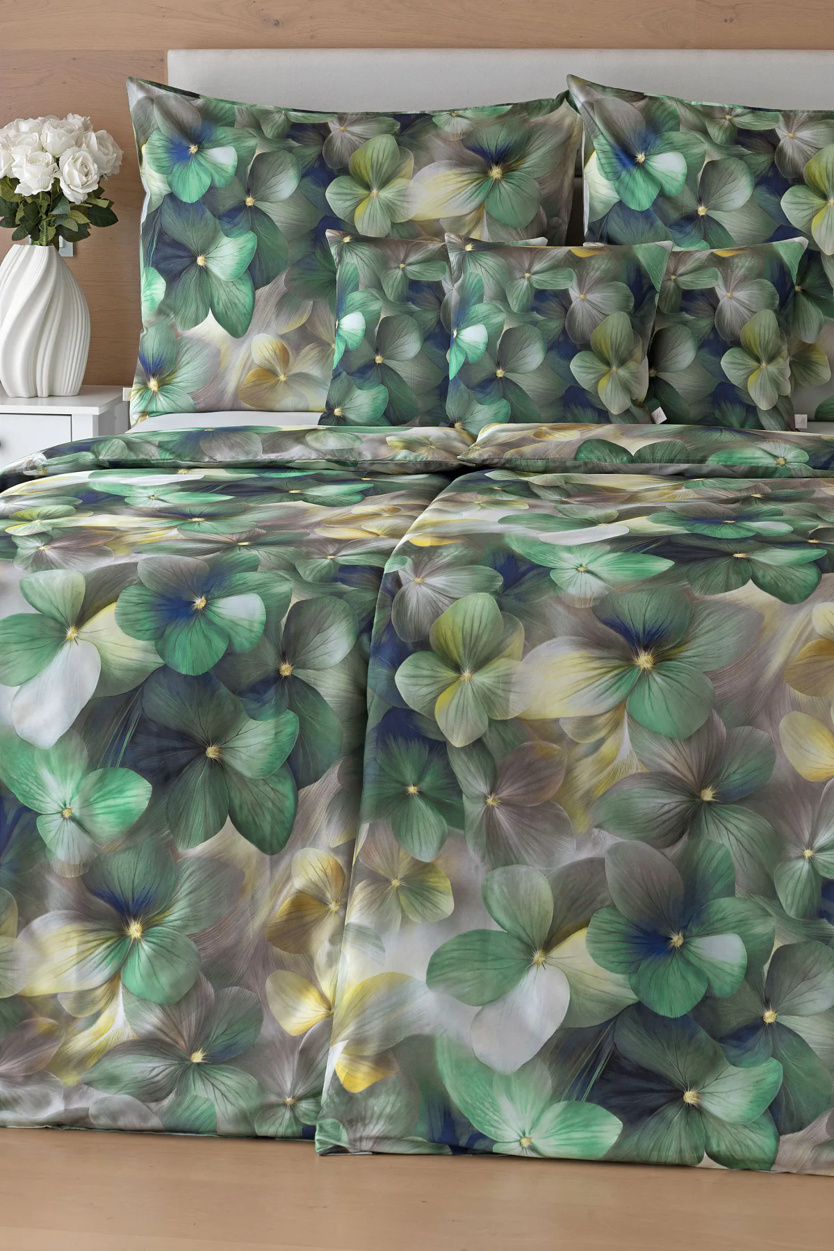 Tento výrazný květinový vzor je tvořen hustou kompozicí květů, které se překrývají a vytvářejí bohatý, dekorativní dojem. Dominují syté zelené tóny doplněné o jemné krémové, šedé a zlatavé akcenty, díky nimž působí dezén živě, ale stále elegantně. Povlak na polštář i na přikrývku je z obou stran stejný, vrchní stranu povlaku na polštář zdobí malé logo "M" v pravém dolním rohu. Povlečení je opatřeno komfortním zipovým uzávěrem