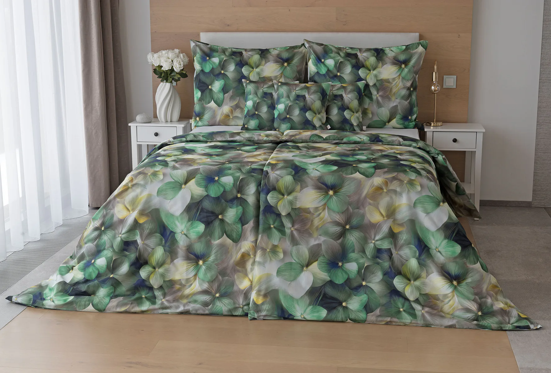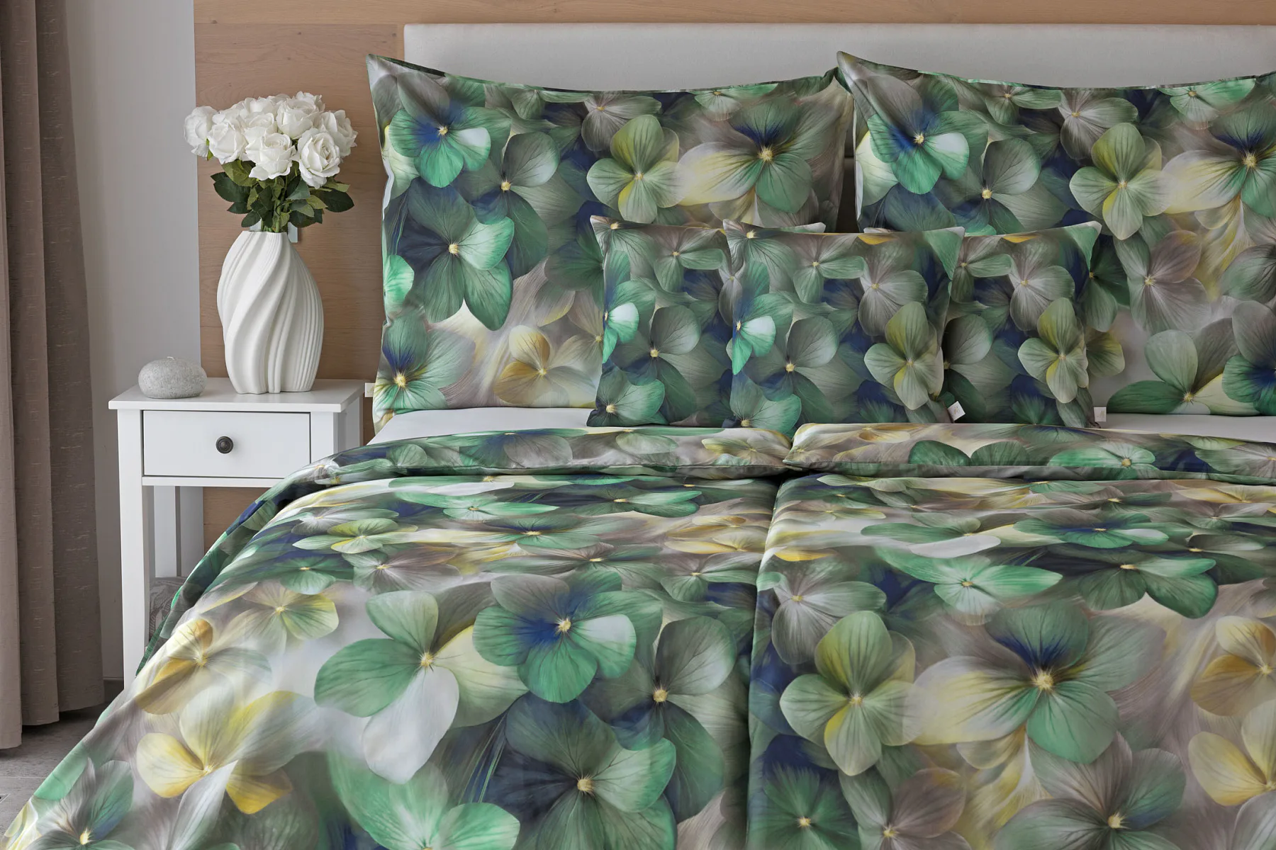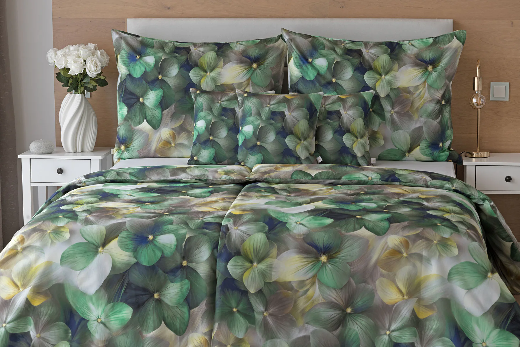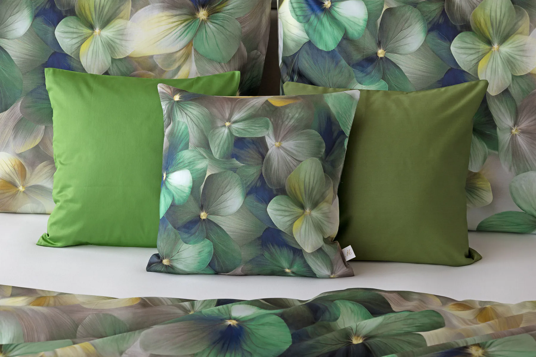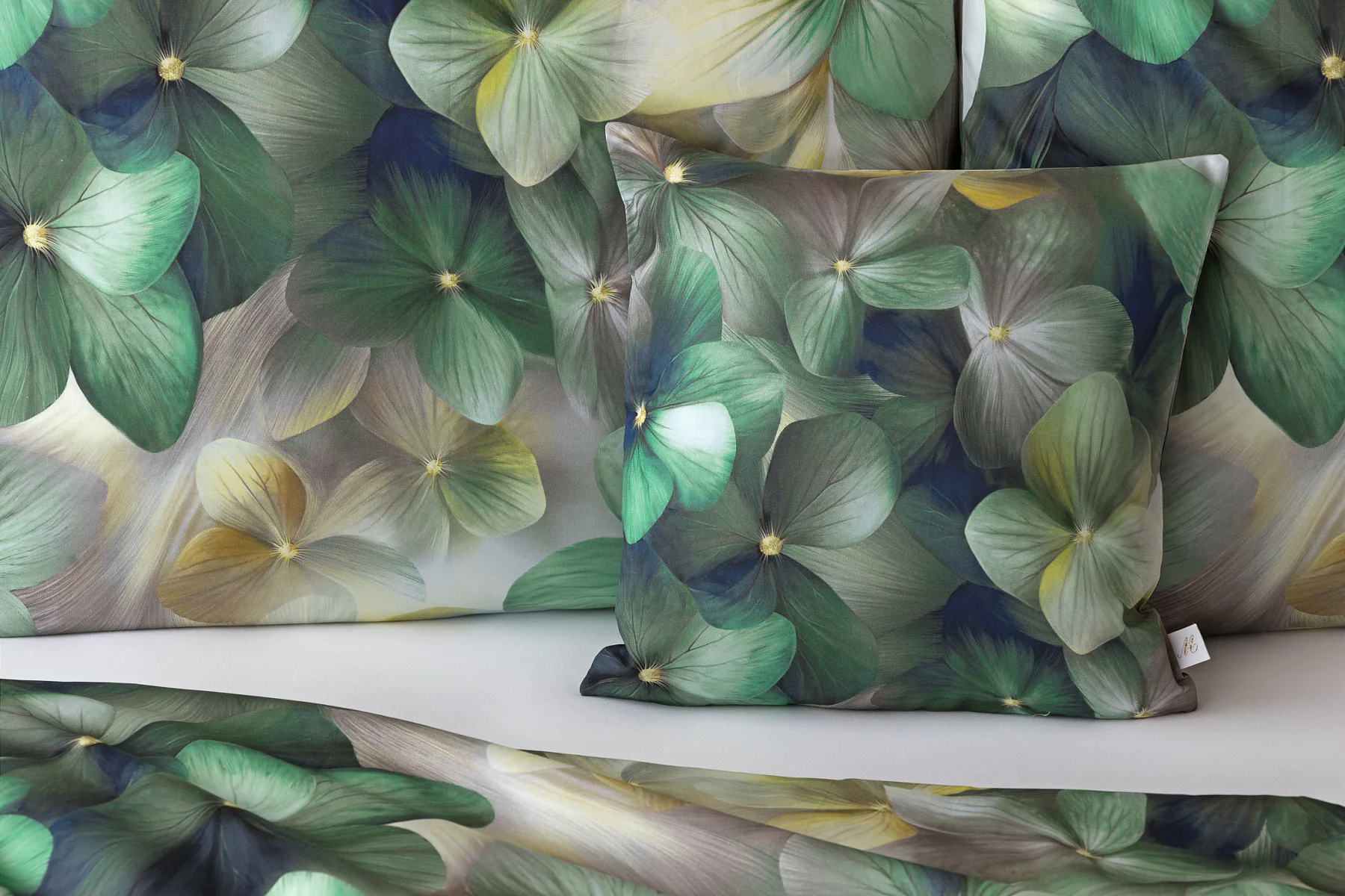 Tento výrazný květinový vzor je tvořen hustou kompozicí květů, které se překrývají a vytvářejí bohatý, dekorativní dojem. Dominují syté zelené tóny doplněné o jemné krémové, šedé a zlatavé akcenty, díky nimž působí dezén živě, ale stále elegantně. Povlak na polštář i na přikrývku je z obou stran stejný, vrchní stranu povlaku na polštář zdobí malé logo "M" v pravém dolním rohu. Povlečení je opatřeno komfortním zipovým uzávěrem