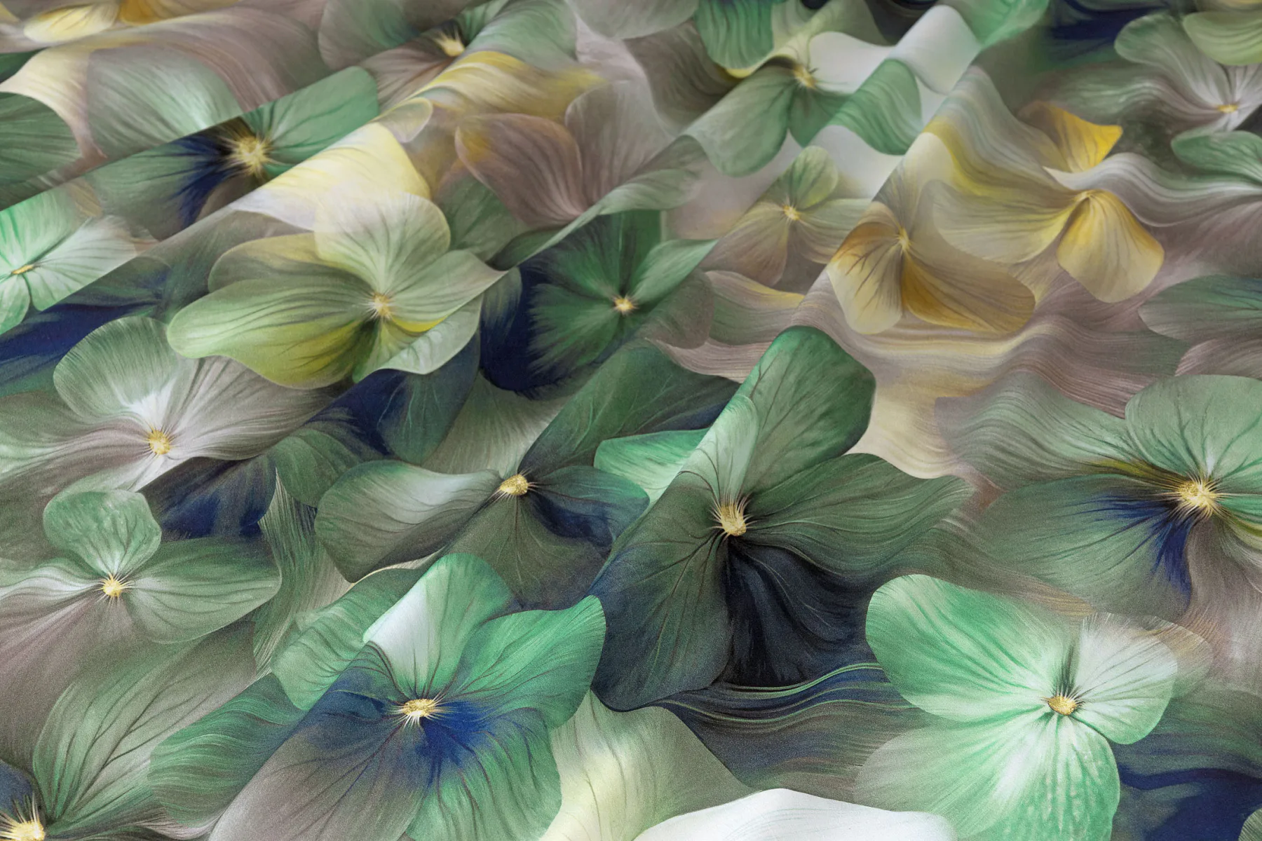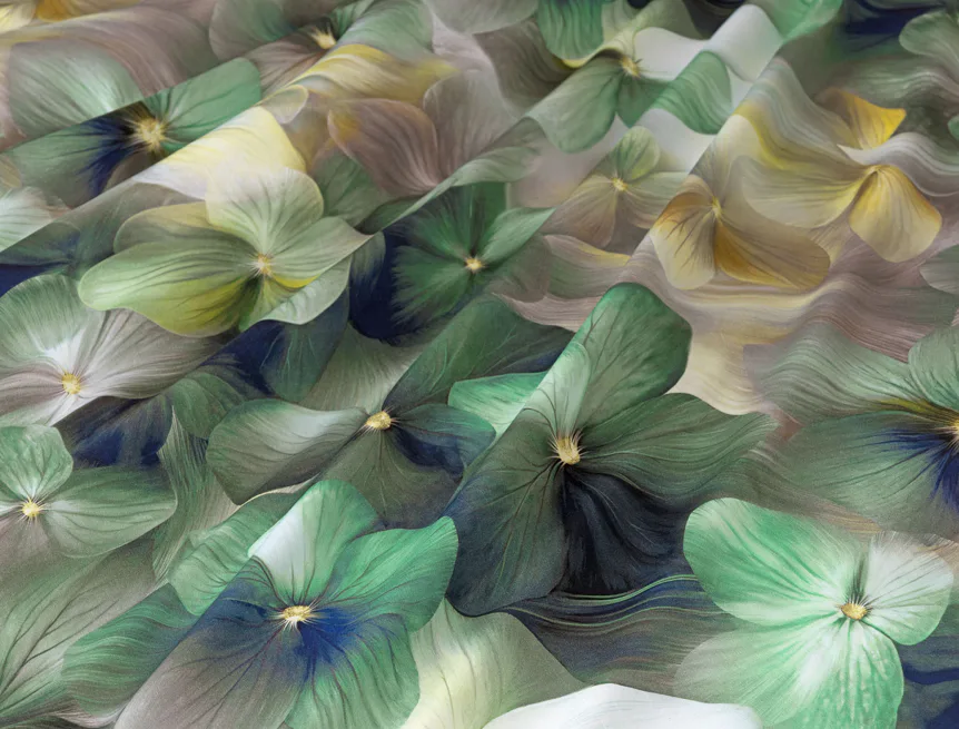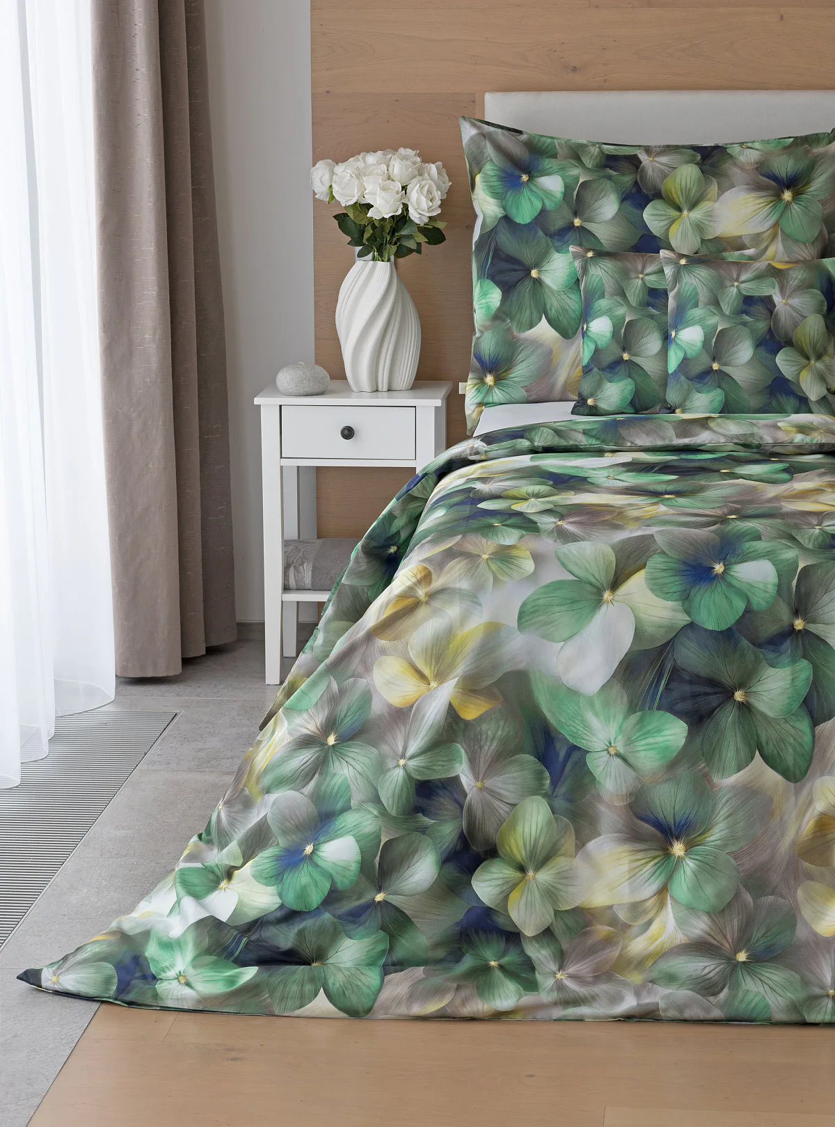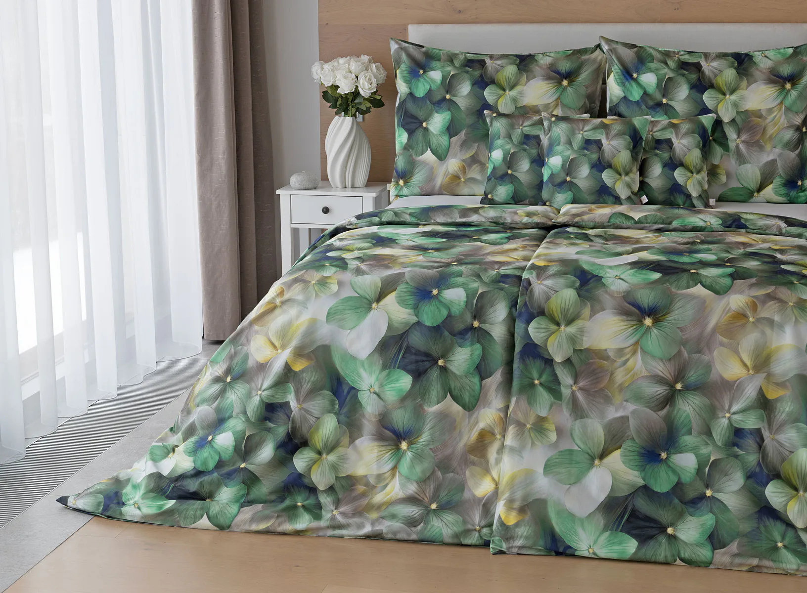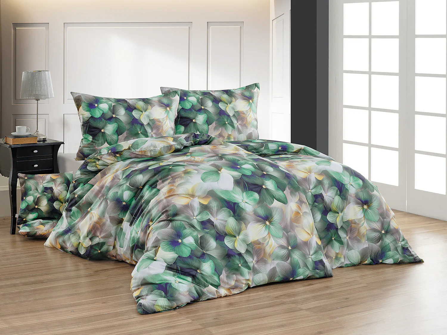 Tento výrazný květinový vzor je tvořen hustou kompozicí květů, které se překrývají a vytvářejí bohatý, dekorativní dojem. Dominují syté zelené tóny doplněné o jemné krémové, šedé a zlatavé akcenty, díky nimž působí dezén živě, ale stále elegantně. Povlak na polštář i na přikrývku je z obou stran stejný, vrchní stranu povlaku na polštář zdobí malé logo "M" v pravém dolním rohu. Povlečení je opatřeno komfortním zipovým uzávěrem