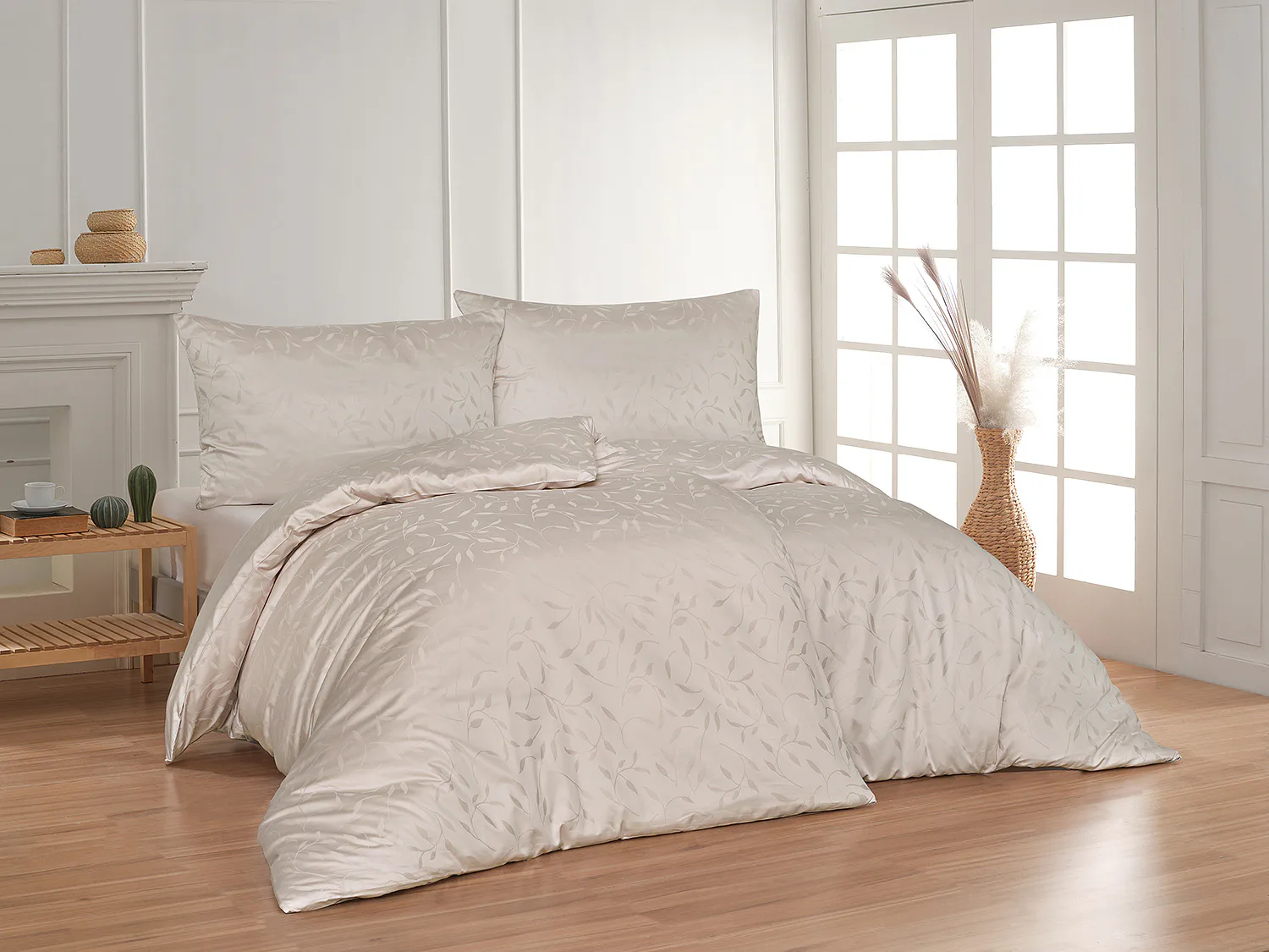 Tato synonyma vystihují žakárové damaškové povlečení VICTORIA s decentním florálním vzorem. Přirozený lesk a jemné vytkané lístky se dokonale snoubí se světlým odstínem taupe hnědé barvy.