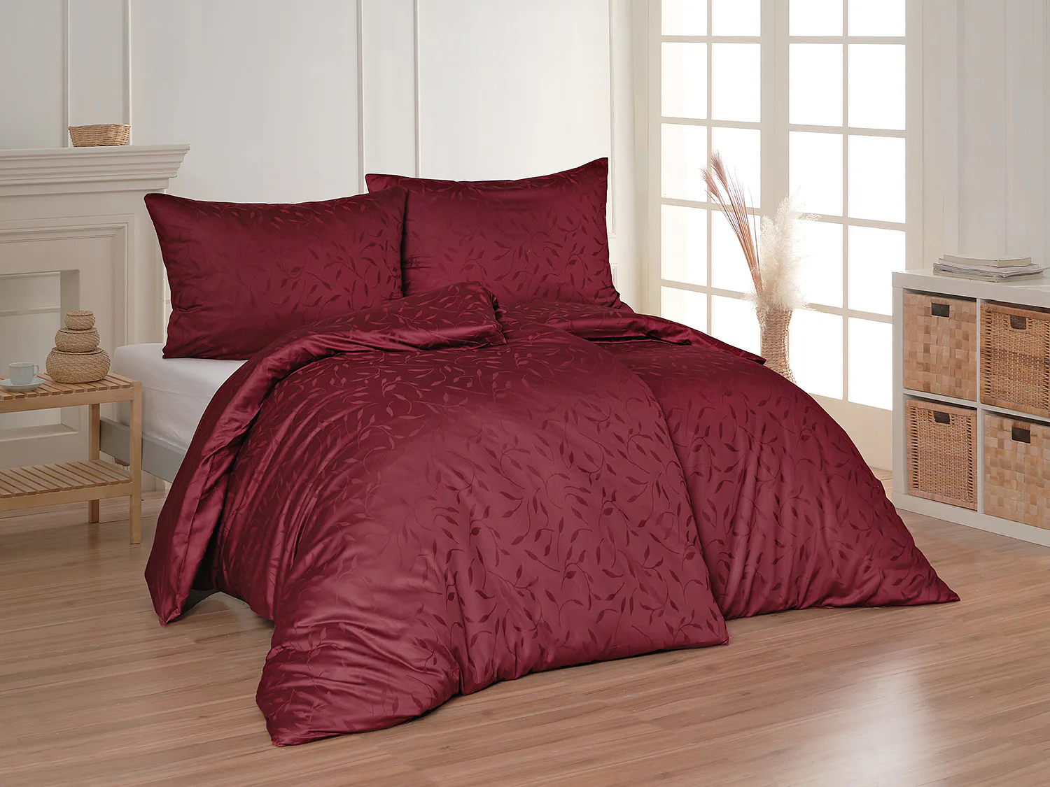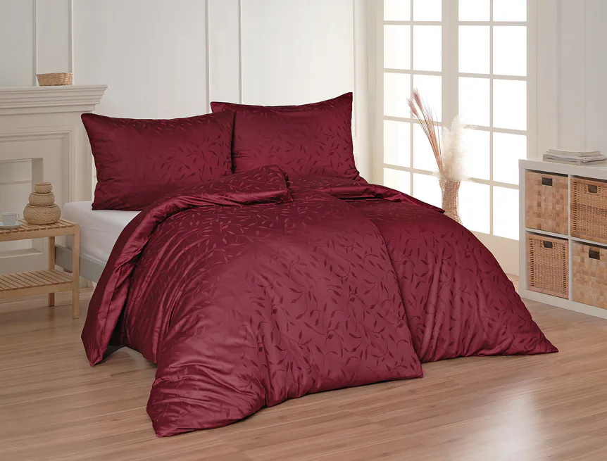 Tato synonyma vystihují žakárové damaškové povlečení VICTORIA s decentním florálním vzorem. Přirozený lesk a jemné vytkané lístky se dokonale snoubí se zářivým vínovým odstínem.