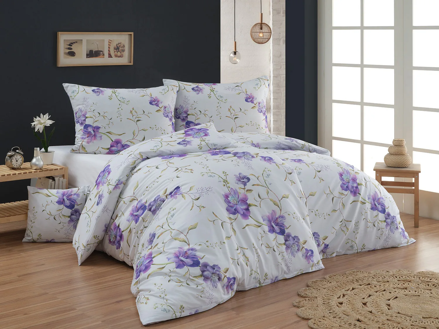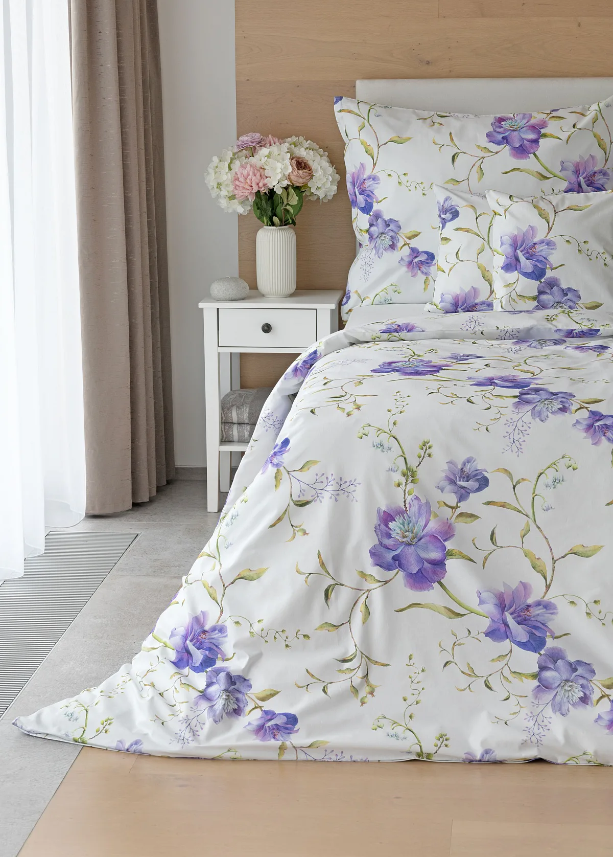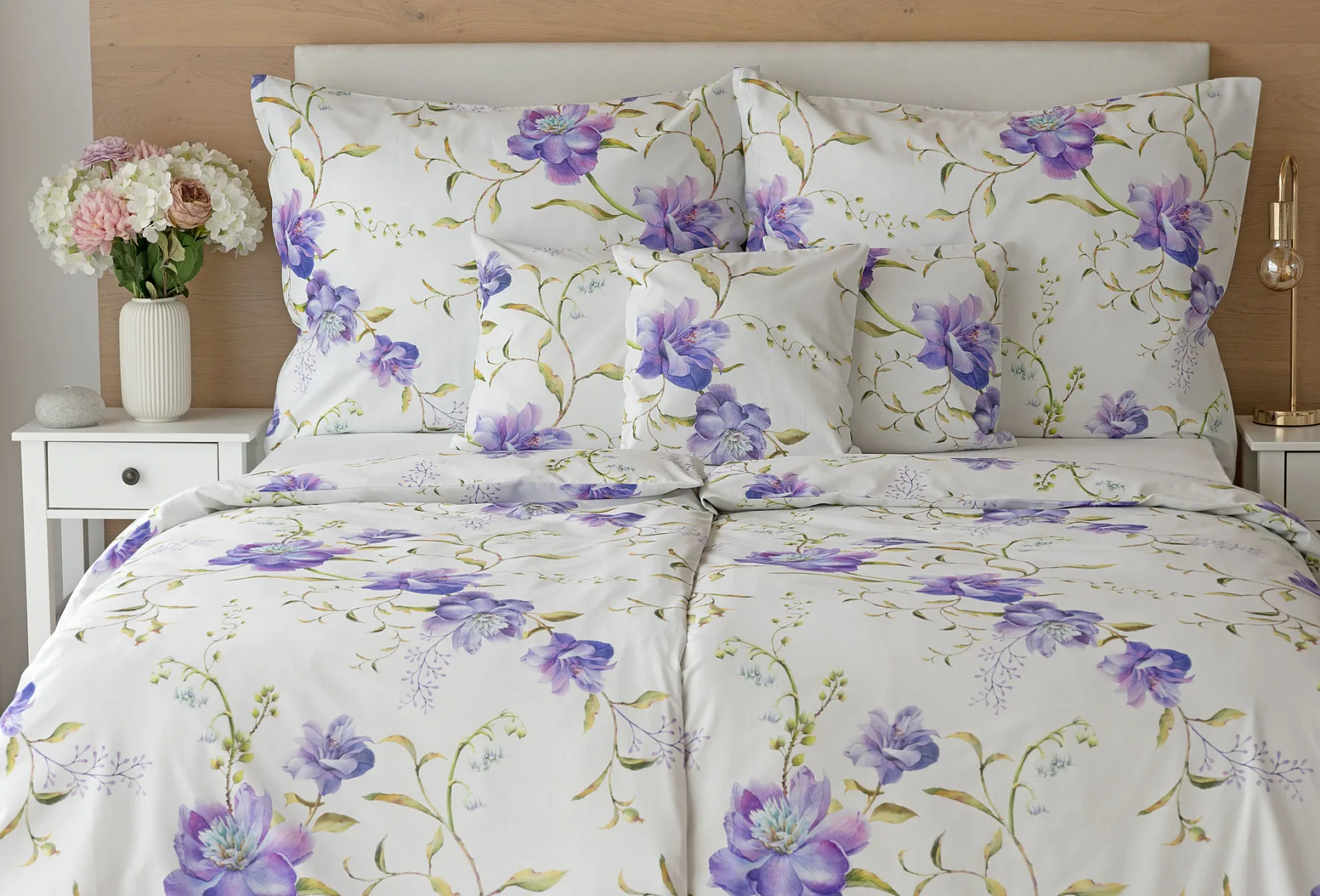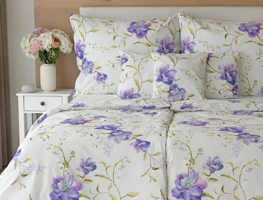Něžný květinový motiv ložního povlečení Viola vás vtáhne do svěží atmosféry jarních dnů. Atraktivní fialové květy doplněné svěží zelení vynikají na bílém podkladu a díky nejmodernějšímu digitálnímu tisku si vychutnáte každý detail tohoto květinového vzhoru.