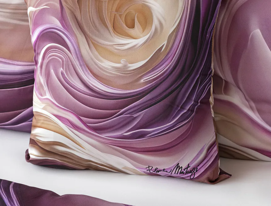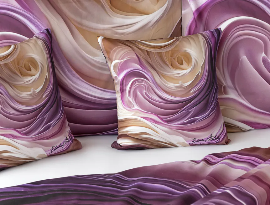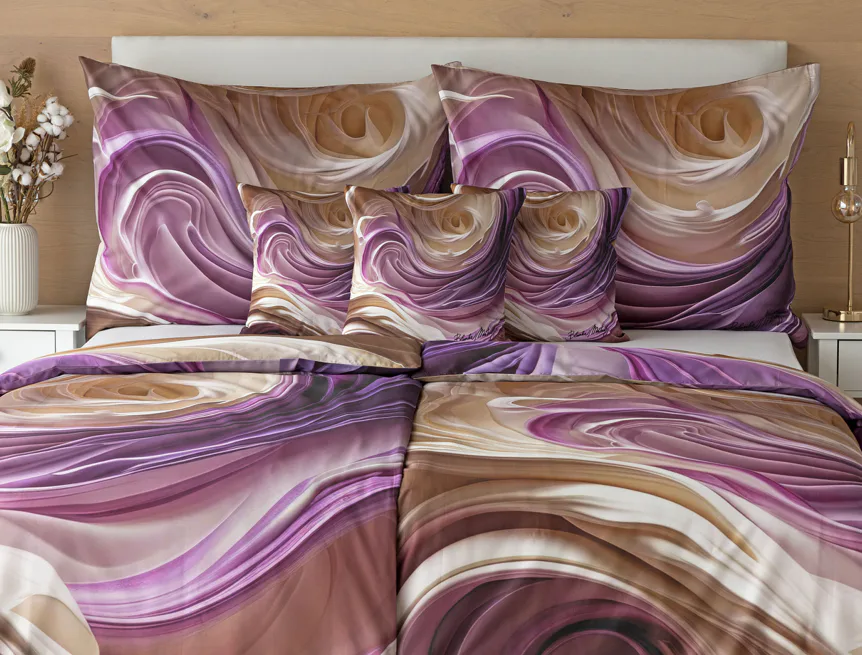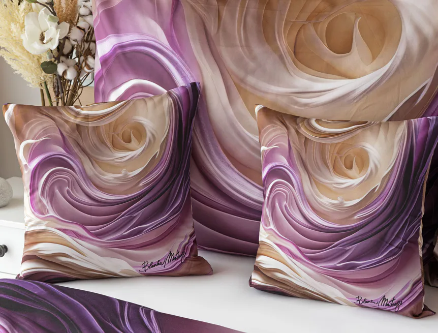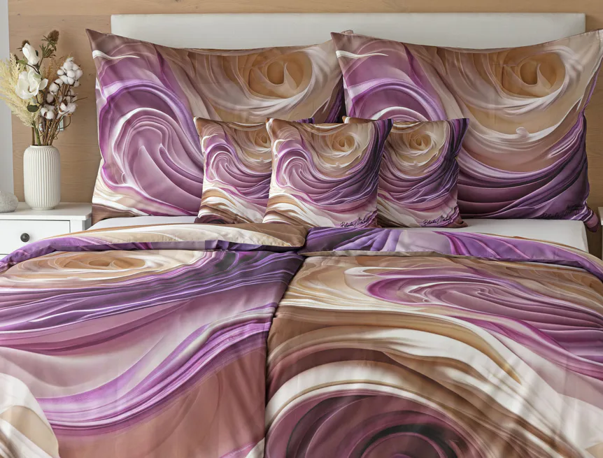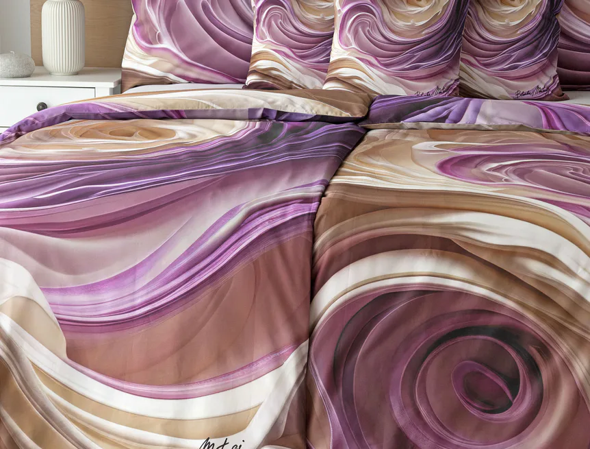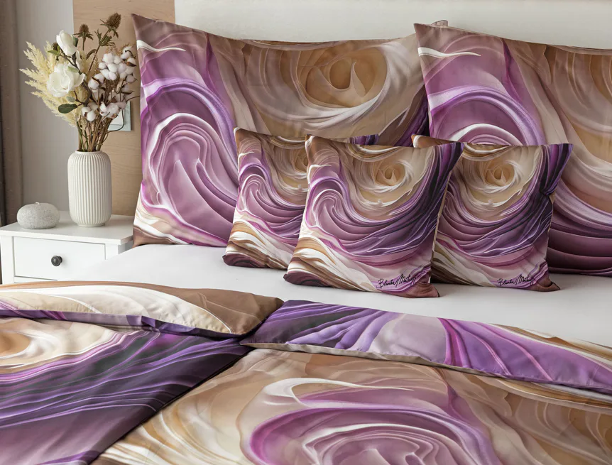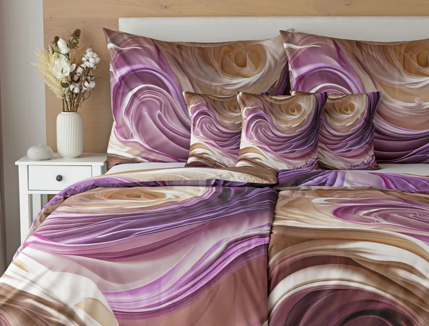 Tento autorský digitálně zpracovaný motiv harmonicky spojuje zářivé odstíny fialové s paletou krémových a béžových tónů. Nejmodernější digitální tisk zajišťuje