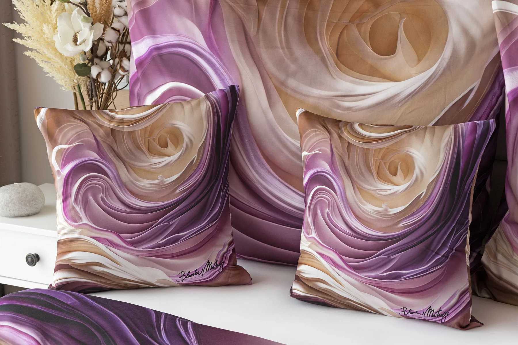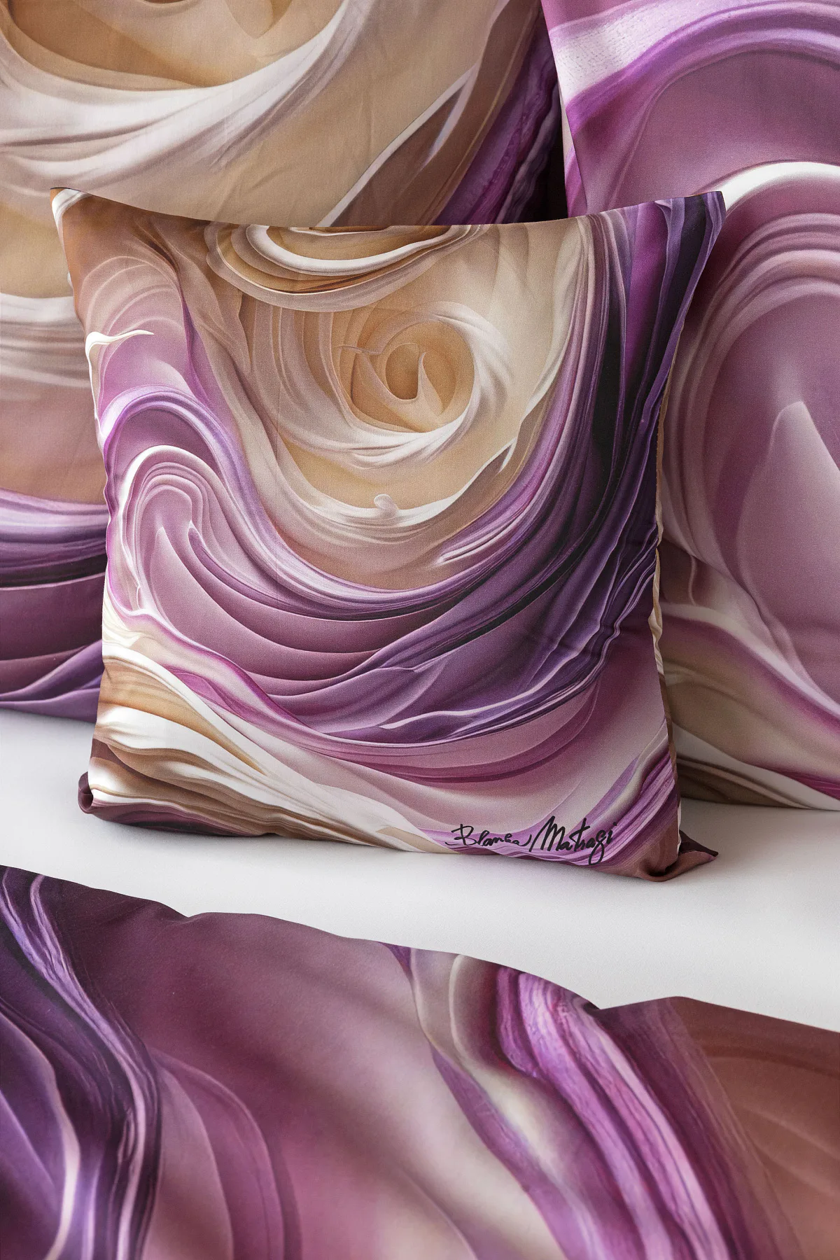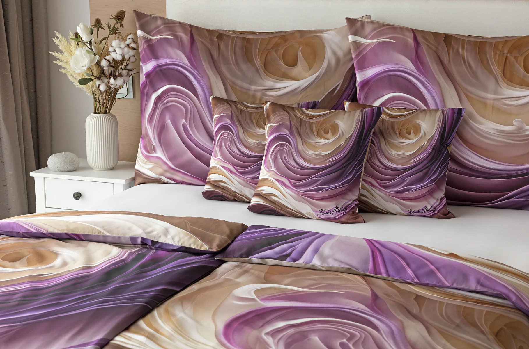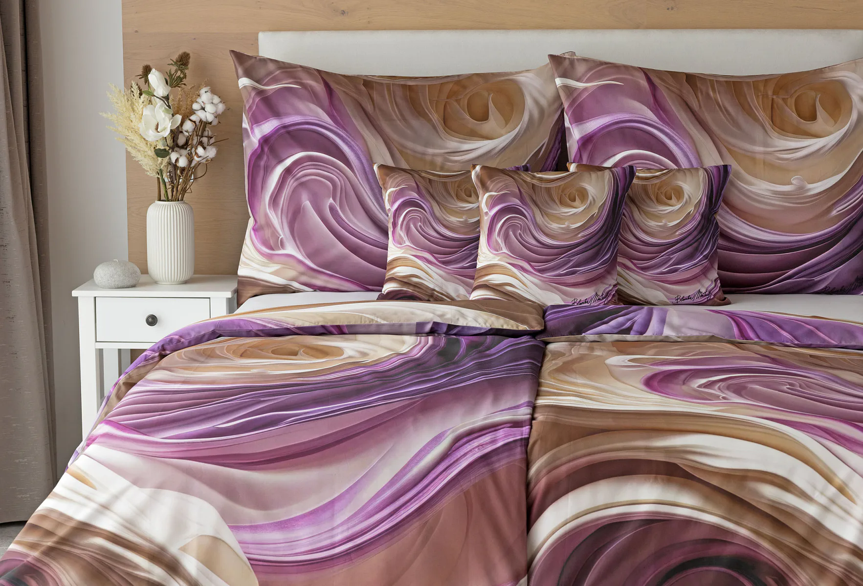 Tento autorský digitálně zpracovaný motiv harmonicky spojuje zářivé odstíny fialové s paletou krémových a béžových tónů. Nejmodernější digitální tisk zajišťuje