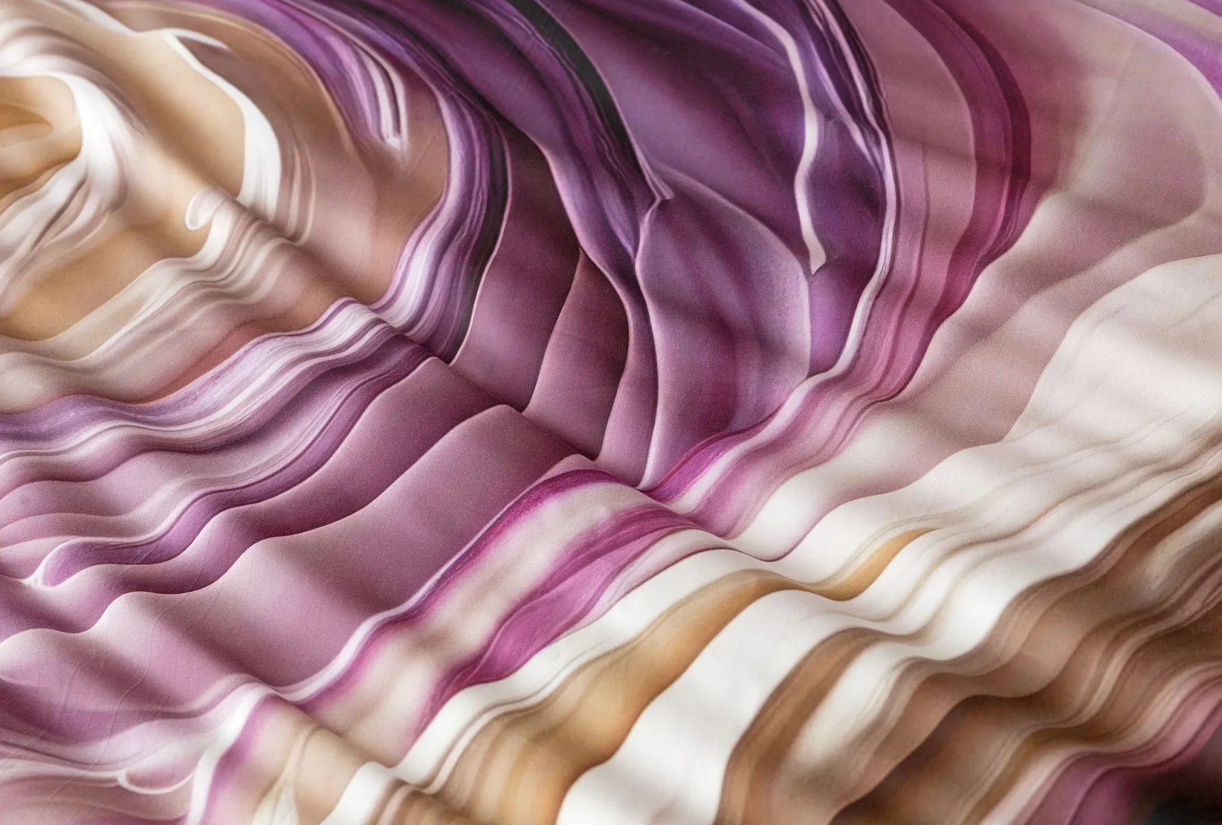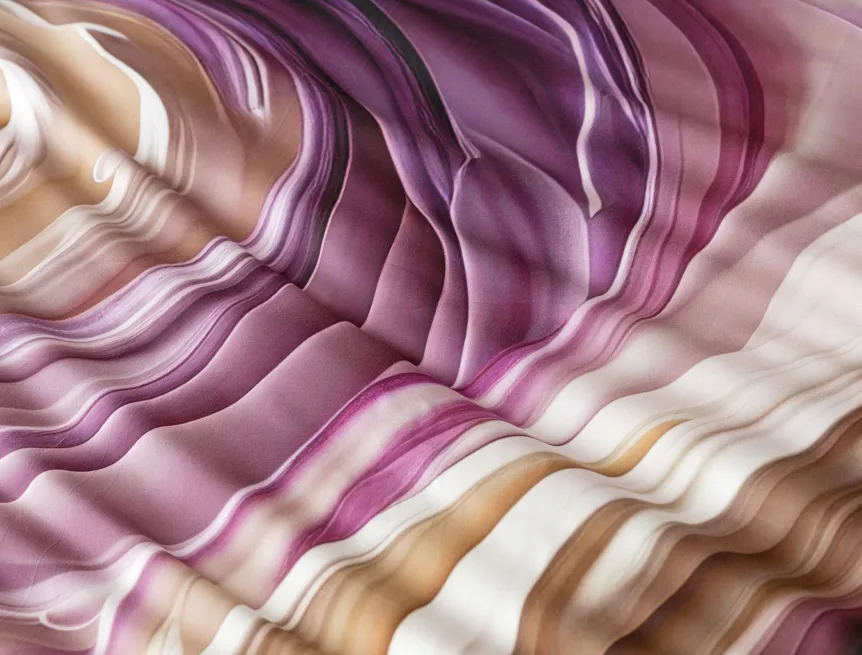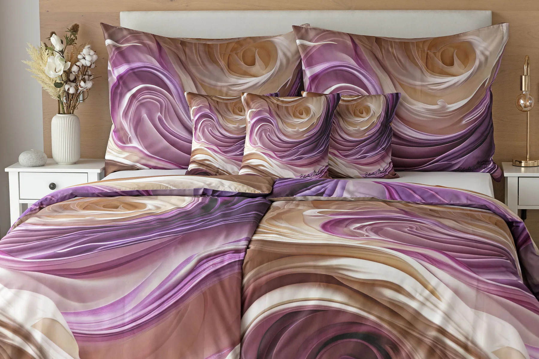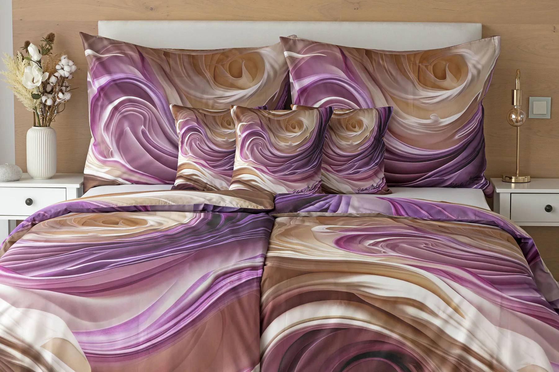 Tento autorský digitálně zpracovaný motiv harmonicky spojuje zářivé odstíny fialové s paletou krémových a béžových tónů. Nejmodernější digitální tisk zajišťuje