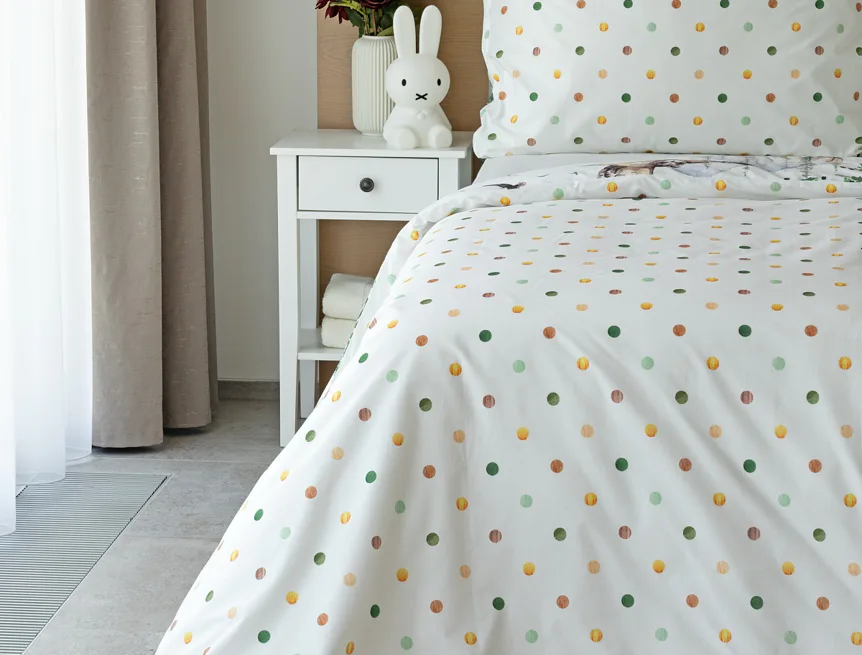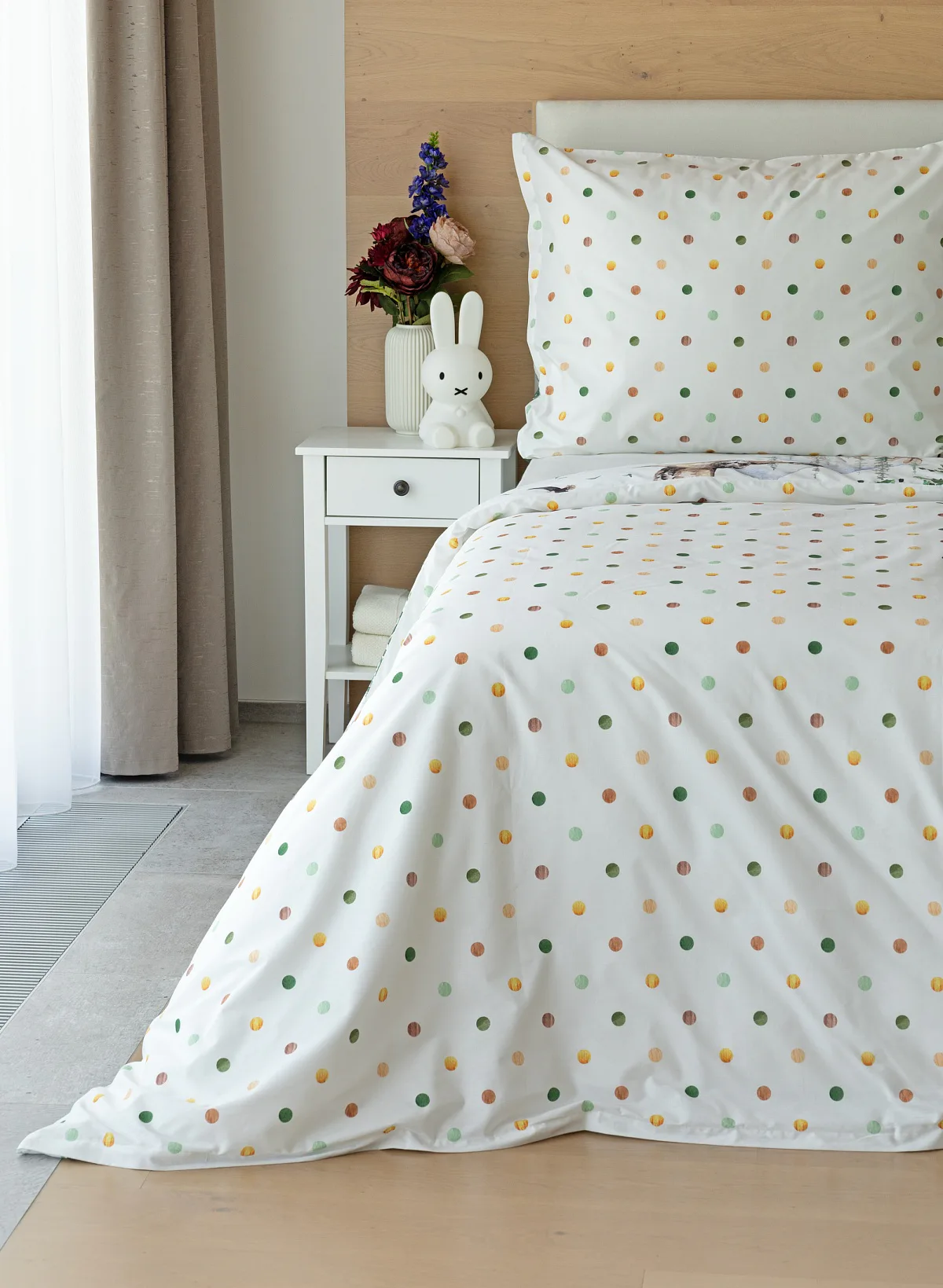 S povlečením Wild si můžete užít hravé stlaní díky oblíbenému oboustrannému provedení, kdy spodní stranu tvoří motiv barevně sladěných puntíků na bílém podkladu. Povlečení je opatřeno praktickým zipovým uzávěrem