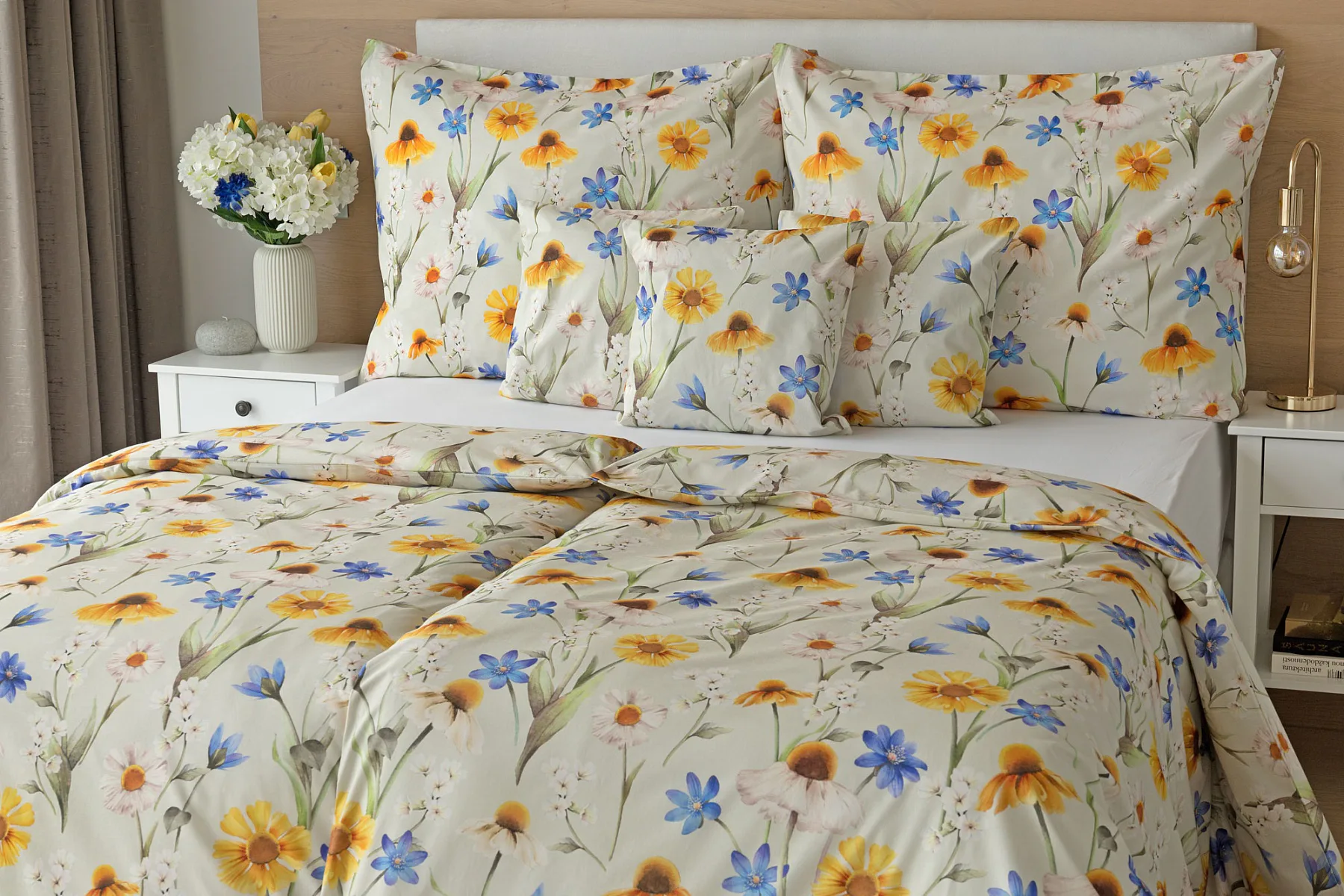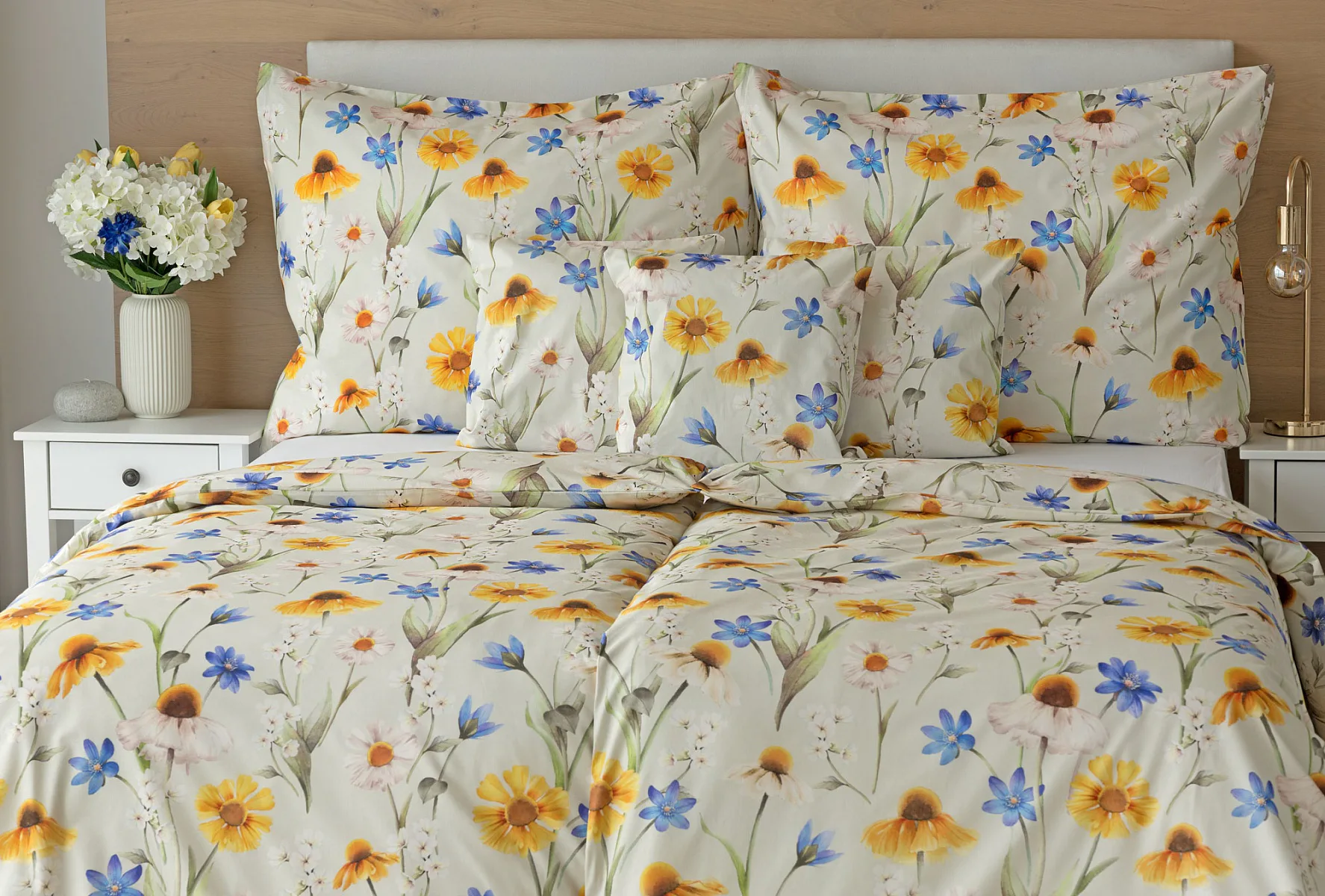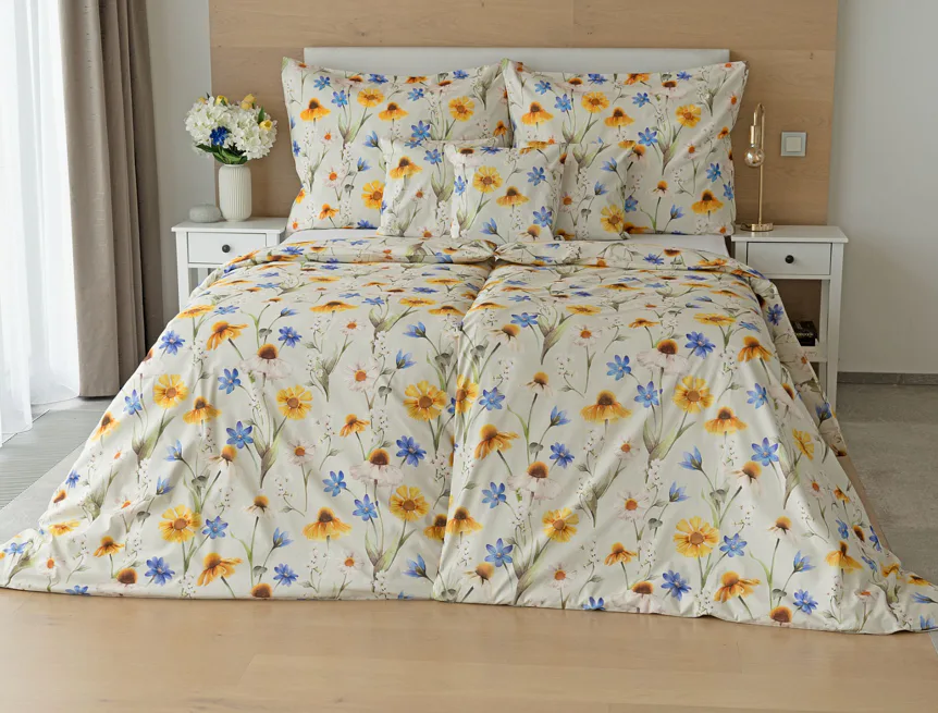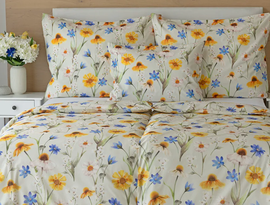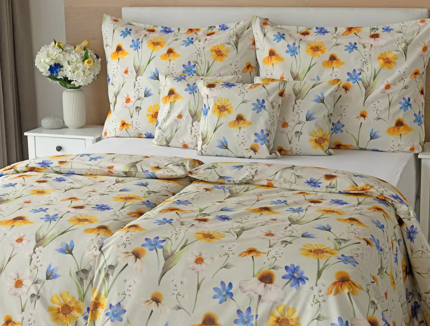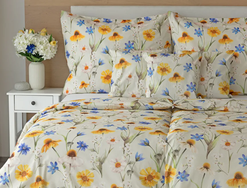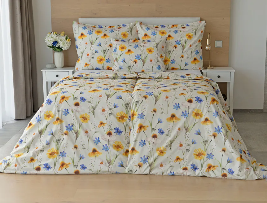 Dopřejte své ložnici svěží nádech s bavlněným povlečením Zaria. Směsice lučního kvítí v odstínech žluté, oranžové a fialovomodré barvy vyniká na decentním podkladu v tlumeném zeleném tónu. Díky nejmodernějšímu digitálnímu tisku vyniká vzor v precizním detailu.